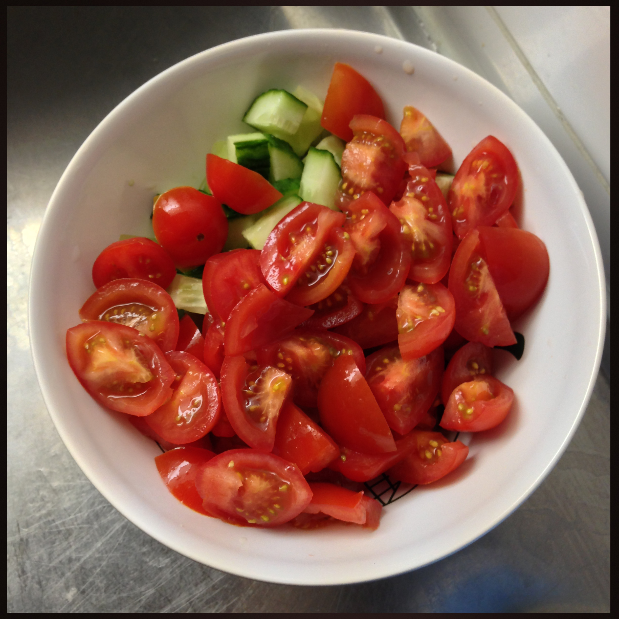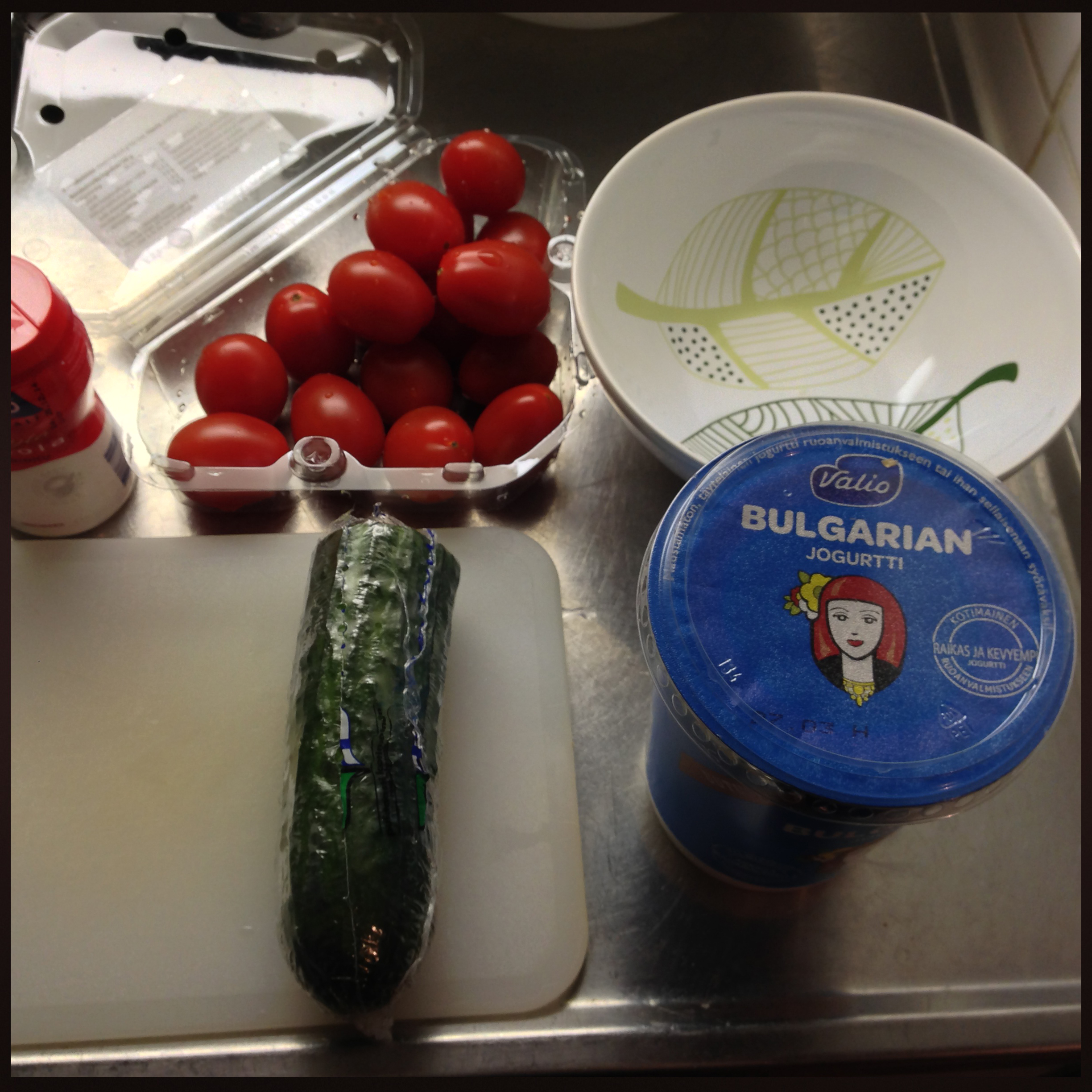 3. Add yoghurt and mix them well. Add some cold water if you think that the yoghurt is too thick. Add some salt (I like tomatoes and cucumber salty – but you don’t have to add salt..).