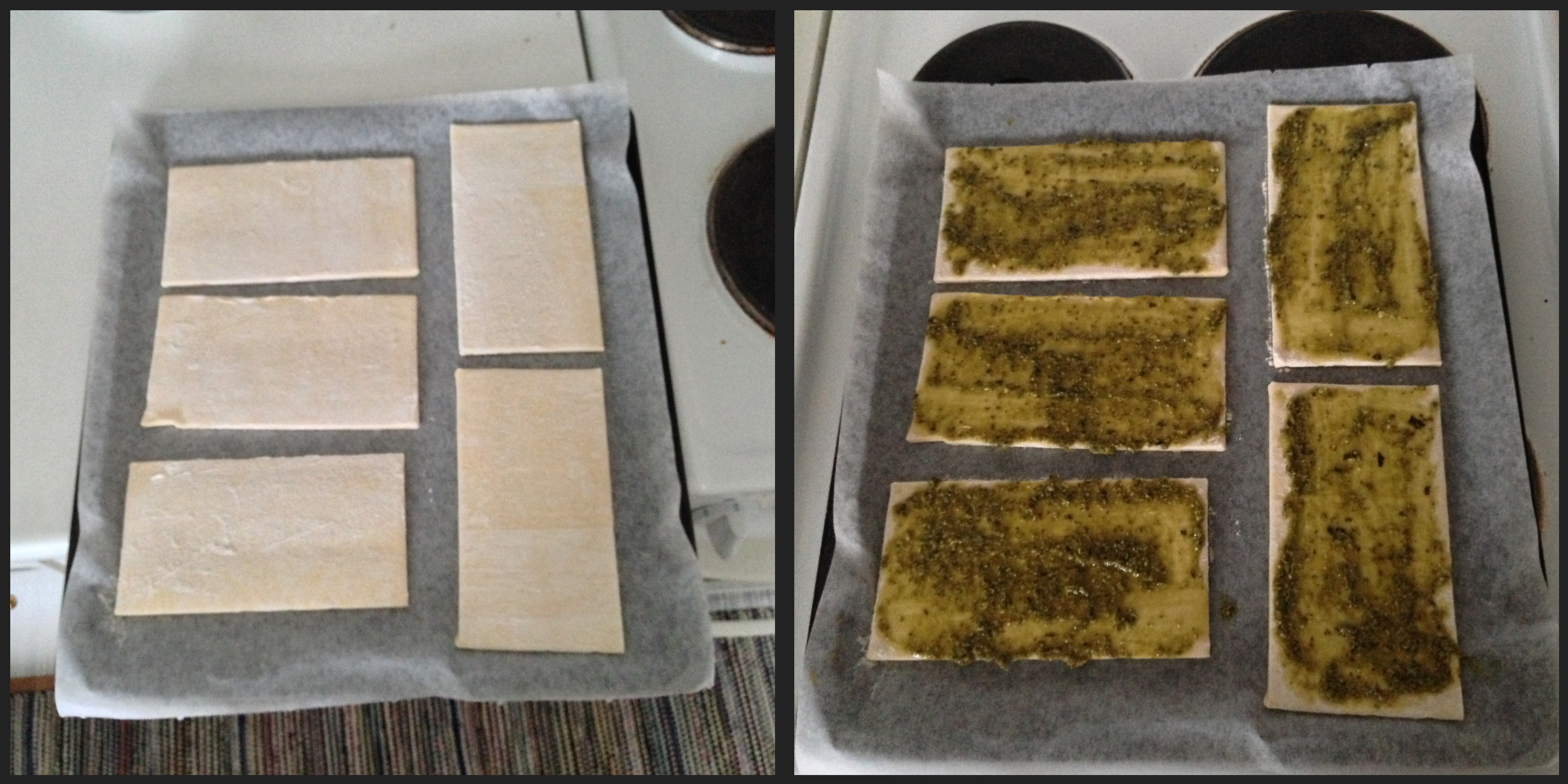 1. Take out five sheets of puff dough and put them on the tray, on a baking sheet. Put some pesto sauce on each sheet and spread it all over.