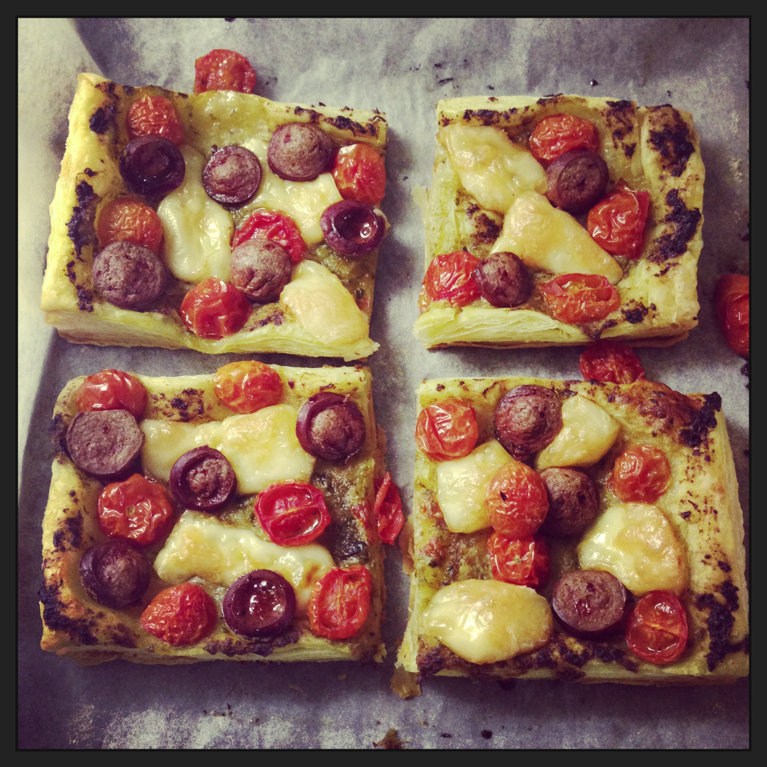 This one inspired me! I wanted to make it just as you did, but quite quickly decided to leave out the tomato. Unlike you, I’m an tomatophobe. Continued through the supermarket finding all other ingredients, but was left without any puff pastry… So after 3 more rounds through the supermarket looking into the freezer, cooler, fresh baked, and part-baked section, I decided to go with pita bread. I gut them open, en saved the top part for some breadcrumb purposes. Put the pesto and chopped ingredients on the pita breads, in the oven for a while, and then had a very tasty late evening meal. Wish I could add the picture here!