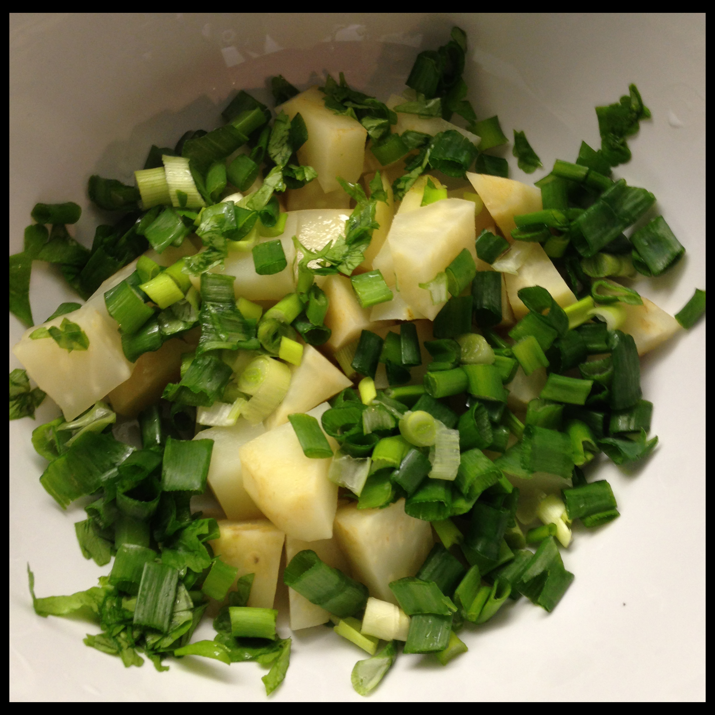 5. When celery is ready, take it out of steamer and put into a big bowl. Add spring onions and parsley. Finally, add the sauce mixture and mix them well altogether. Add some salt and pepper in the end.