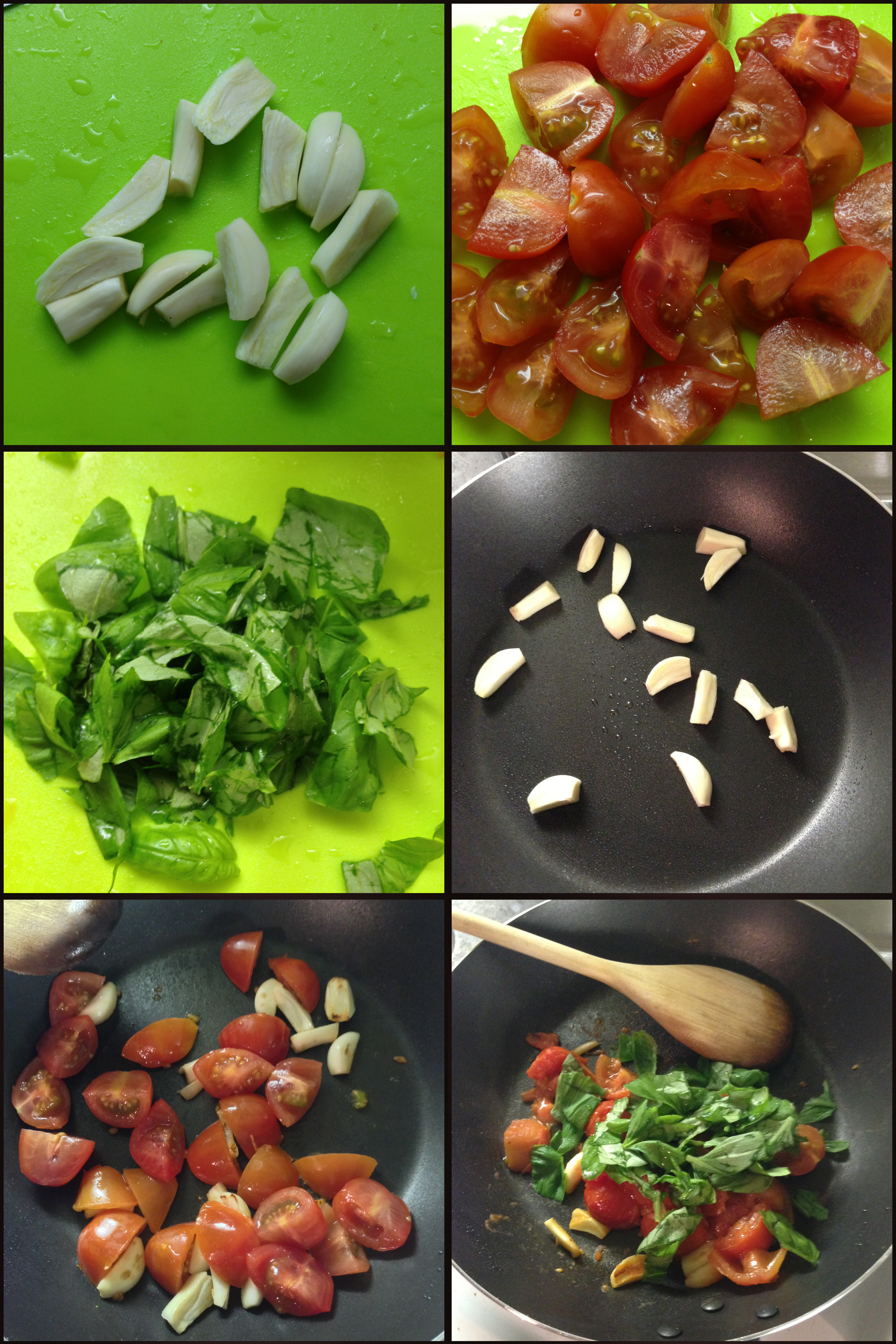 5. Peel the garlic cloves and chop each clove into 2 pieces. Chop cherry tomatoes in 2 or 4 pieces, my cherries were quite big so I chopped into 4 pieces. Chop also basil leaves into pieces as small as you desire but I recommend not to make them too small. Put a drop of olive oil in a frying pan and again spread it all over the surface of the pan with a paper towel, removing the excess oil, as you did in step 3. Put the pan in medium heat. First stir fry the garlics, then add tomatoes, stir a bit more, then finally add basil leaves, as well as a little bit of salt and pepper. Do not fry them much!