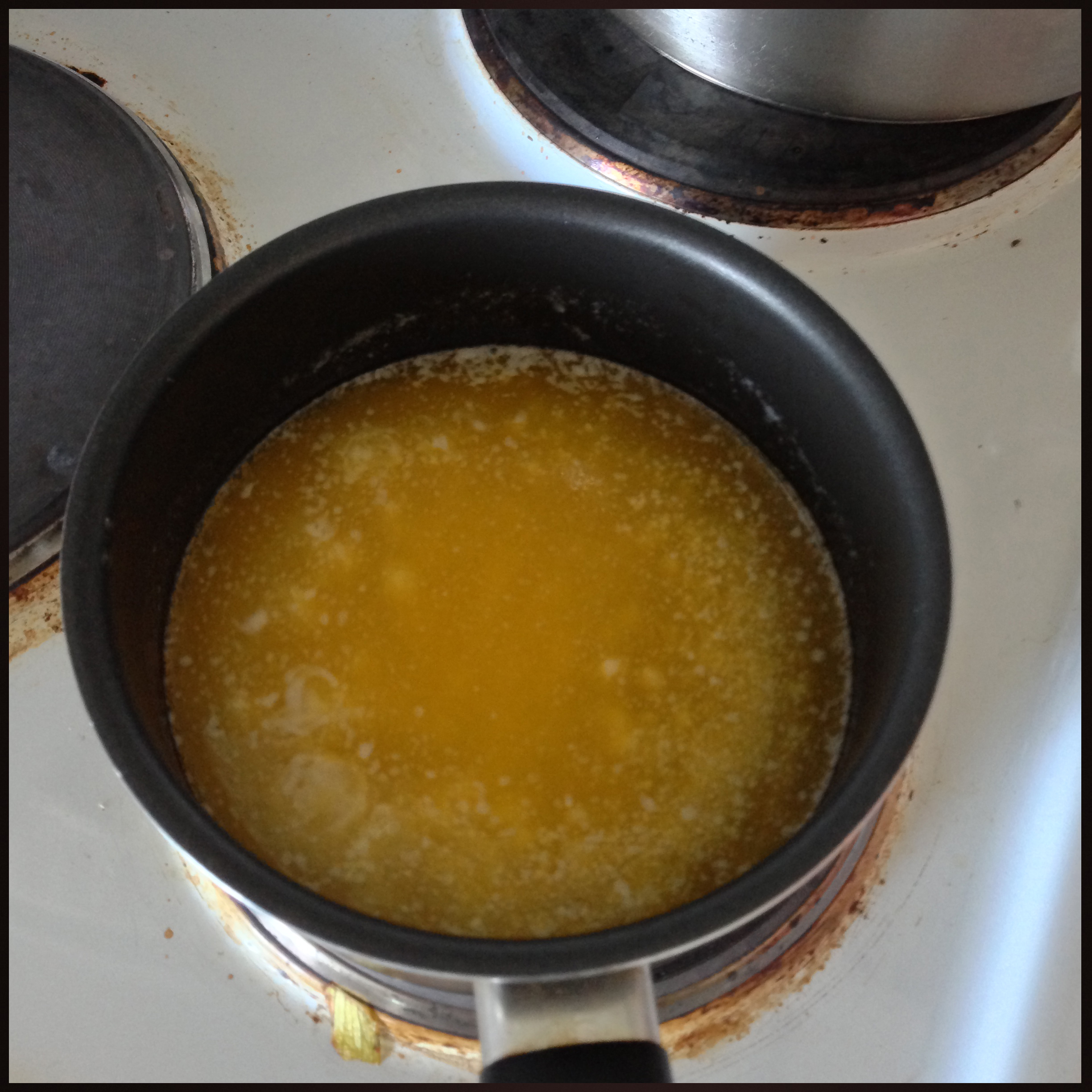 2. Put butter in a small pan and melt it totally in medium heat. Be careful and do NOT burn it. When it gets totally liquid, take it away from heat and let it cool for a few minutes.