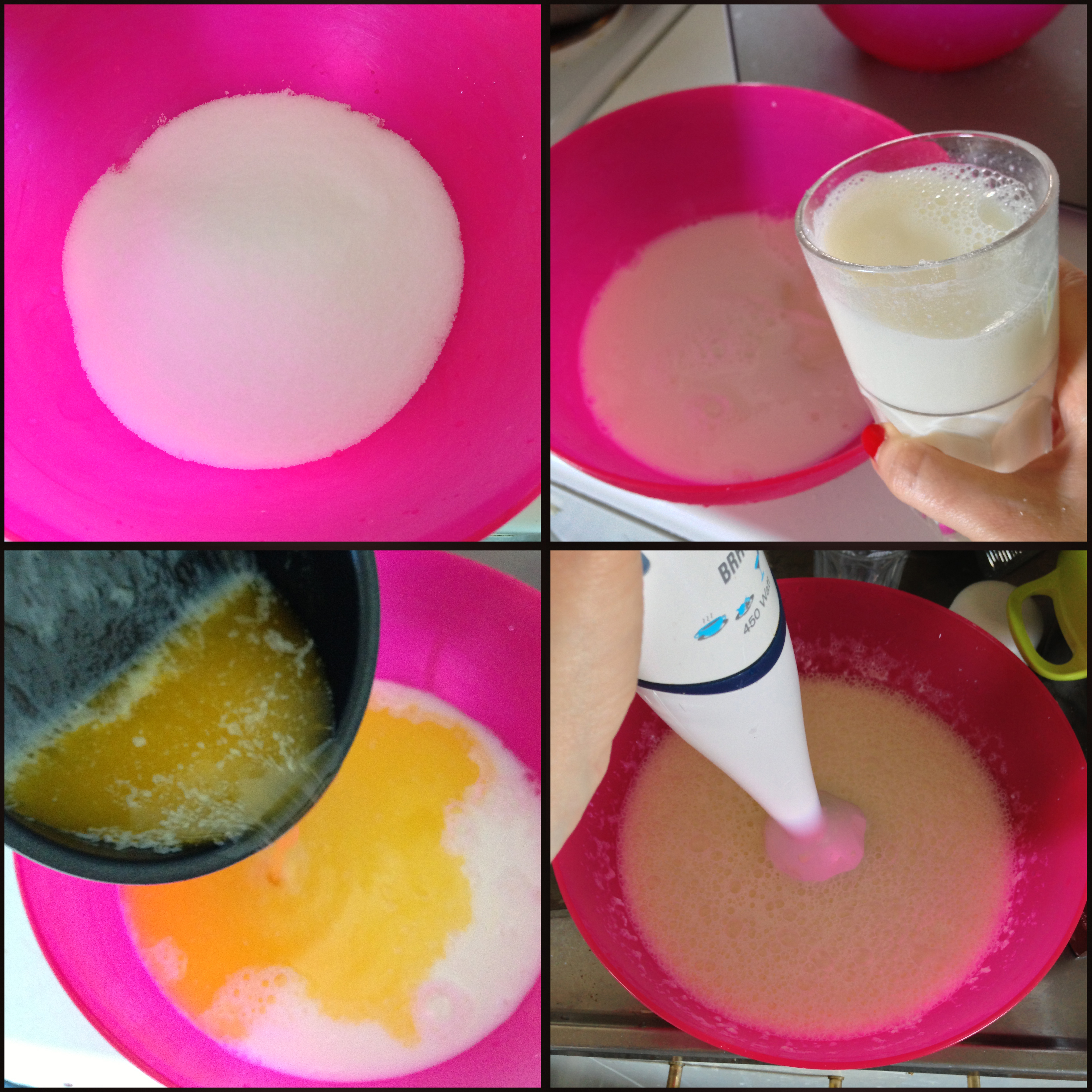 3. In another bowl, put sugar, milk and butter. Mix them using blender.