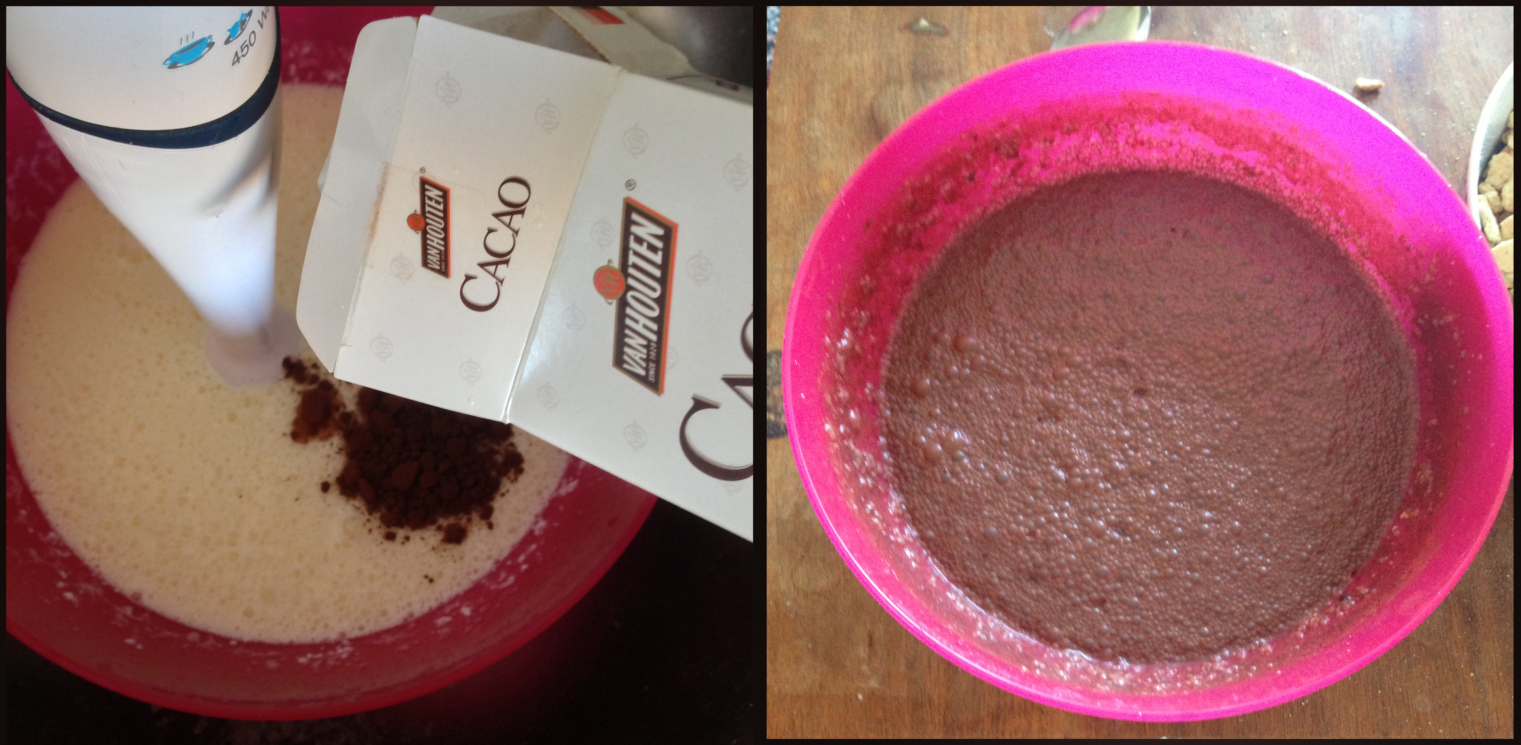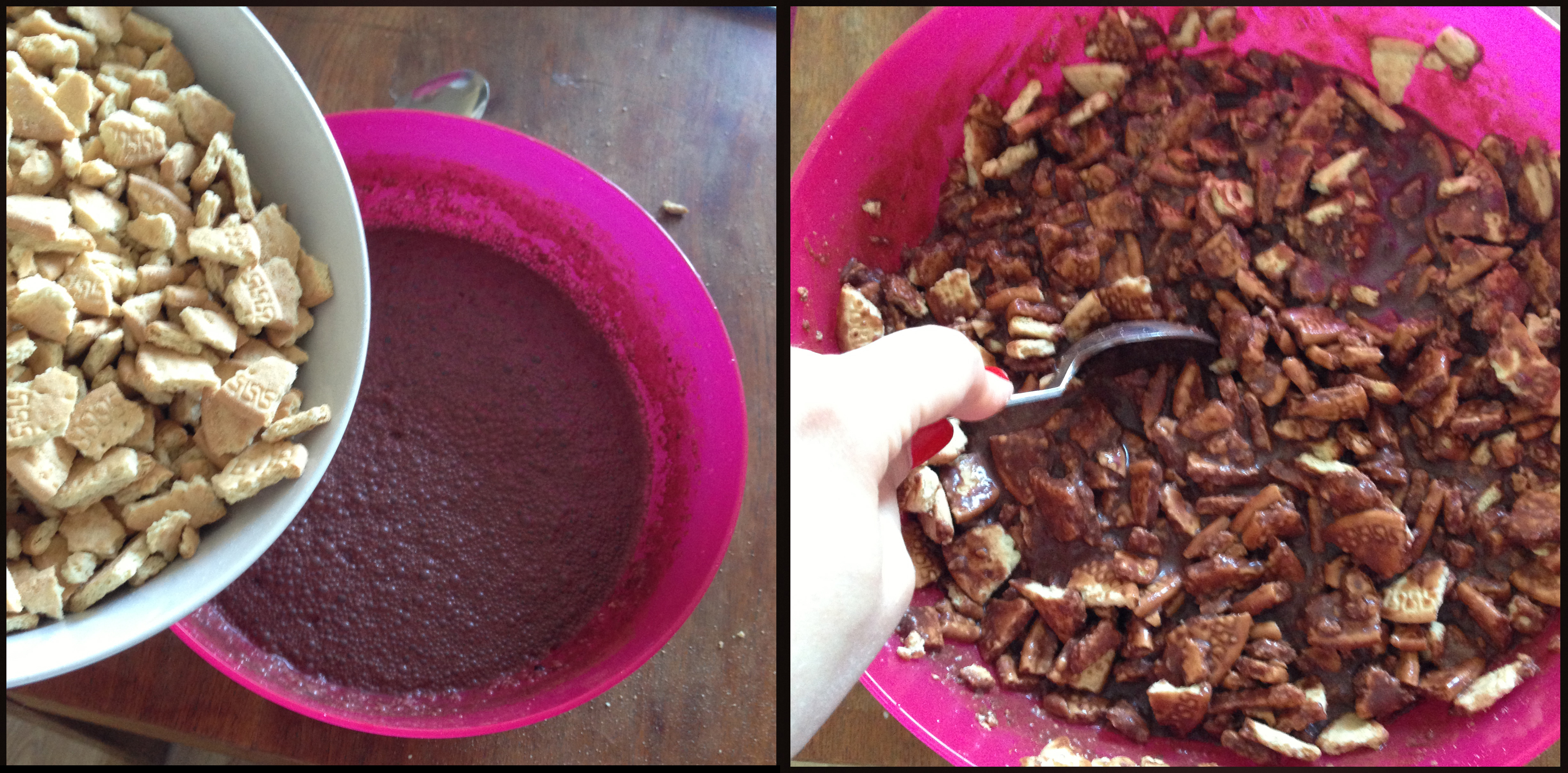 5. Pour the cacao mixture onto the biscuits. Mix them well. If it feels to liquid rather than a bit muddy texture, you can add a bit more biscuits.