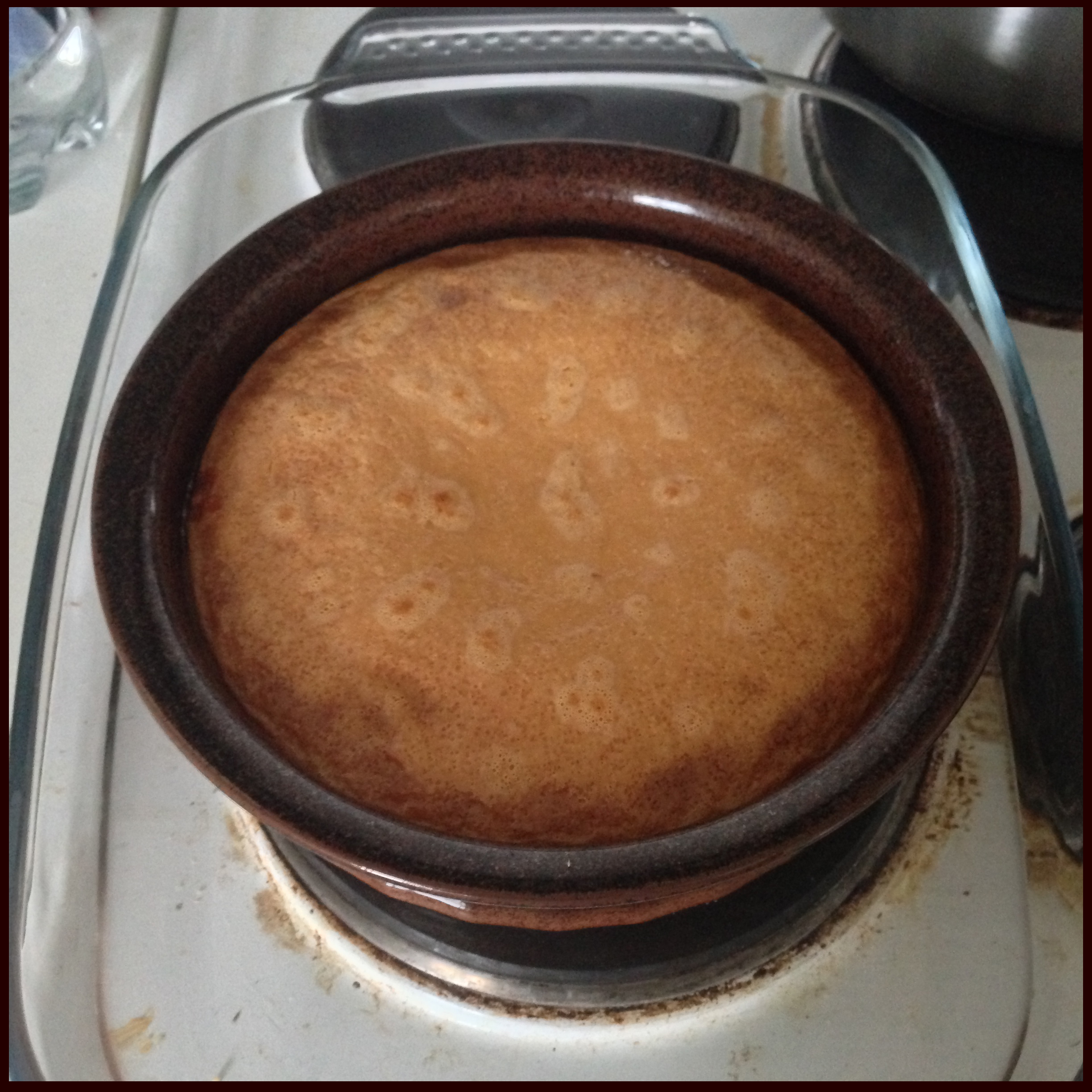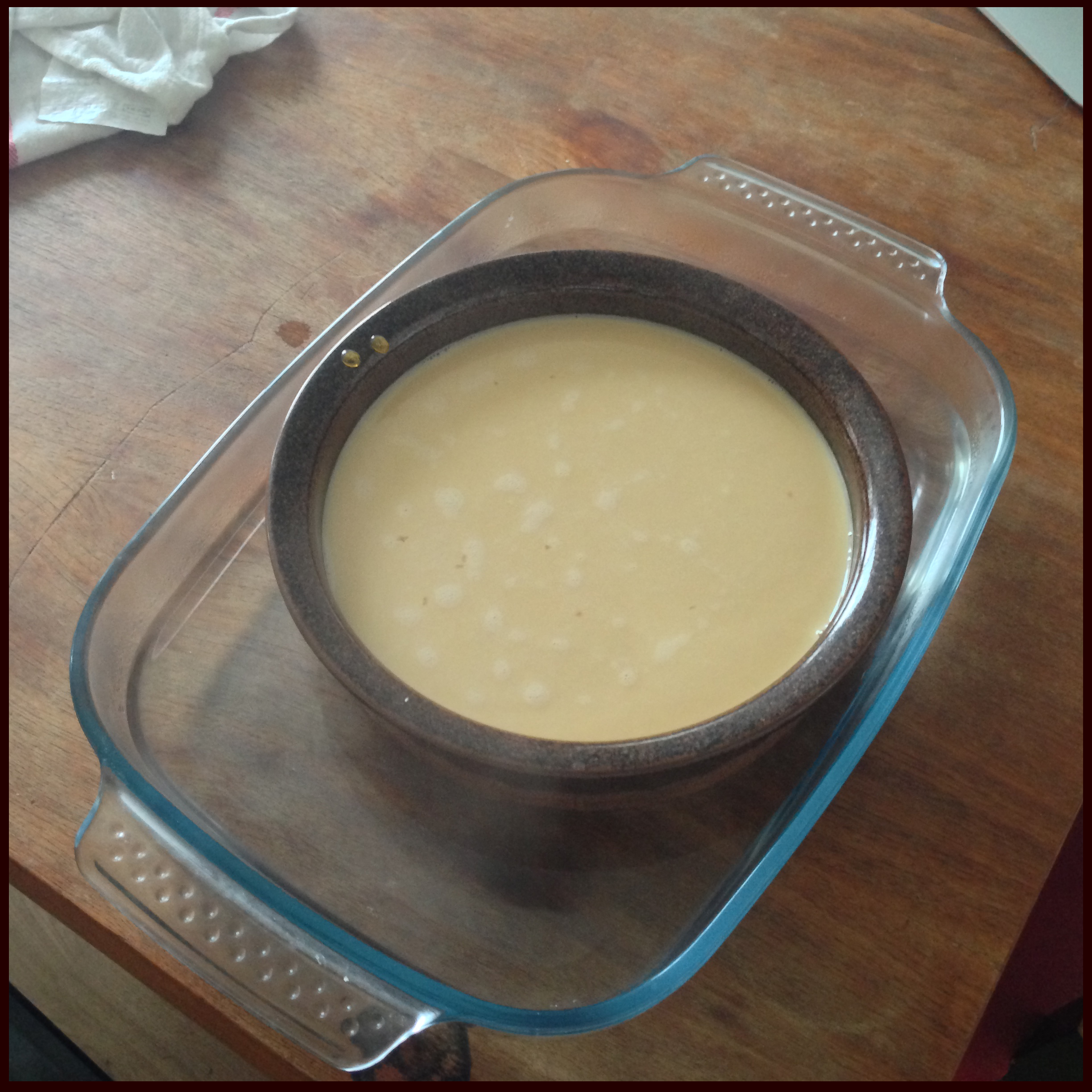 7. Put the dish inside another bigger dish (as you can see, I used a big glass dish). Boil some water and pour the boiled water in the bigger dish until. The water level should be about 2 cm deep. You will bake the flan like this in the oven and this is called water bath baking.