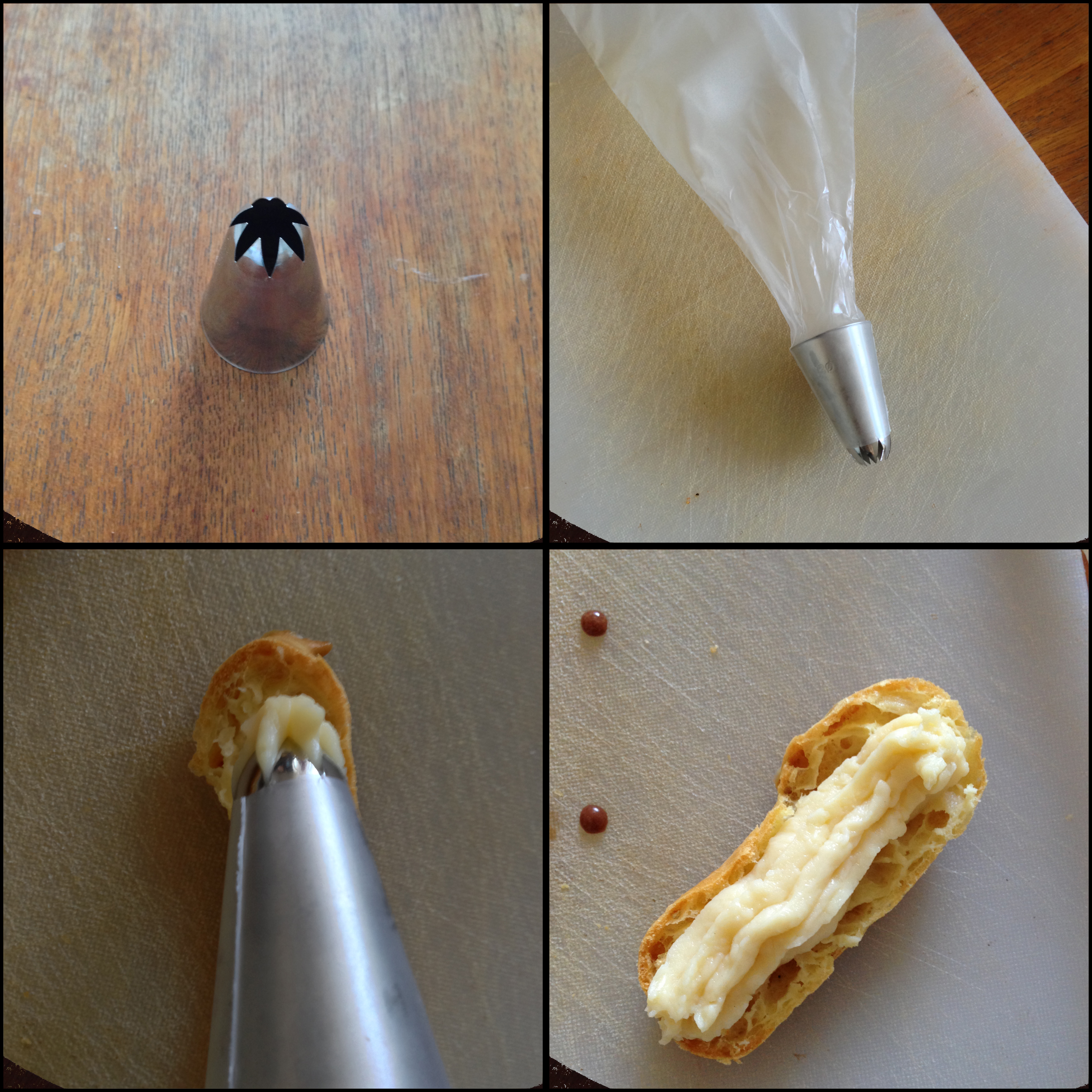 2. Take a pastry bag tip as seen in the first photo below. Put this tip inside a pastry bag. Put all the pastry cream inside pastry bag and put it aside. Take one of the baked pastry pieces, cut it in halves right along through the edge. Squeeze pastry cream all along the bottom pastry half as seen in the last photo below.