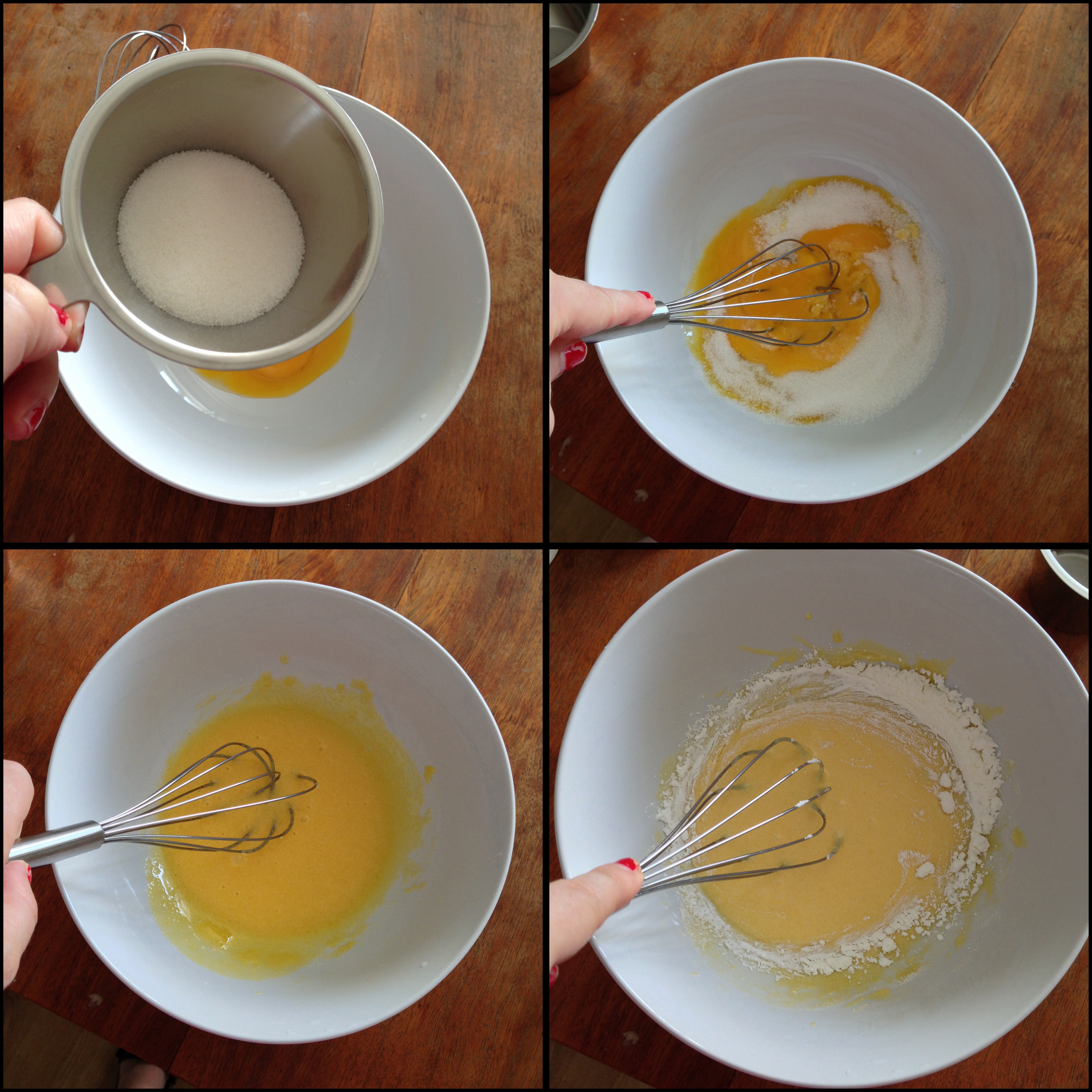 2. In a mixing bowl, put egg yolks and granulated white sugar and whisk it until you get a glossy and rather homogenous mixture. Add flour and corn starch and whisk more.