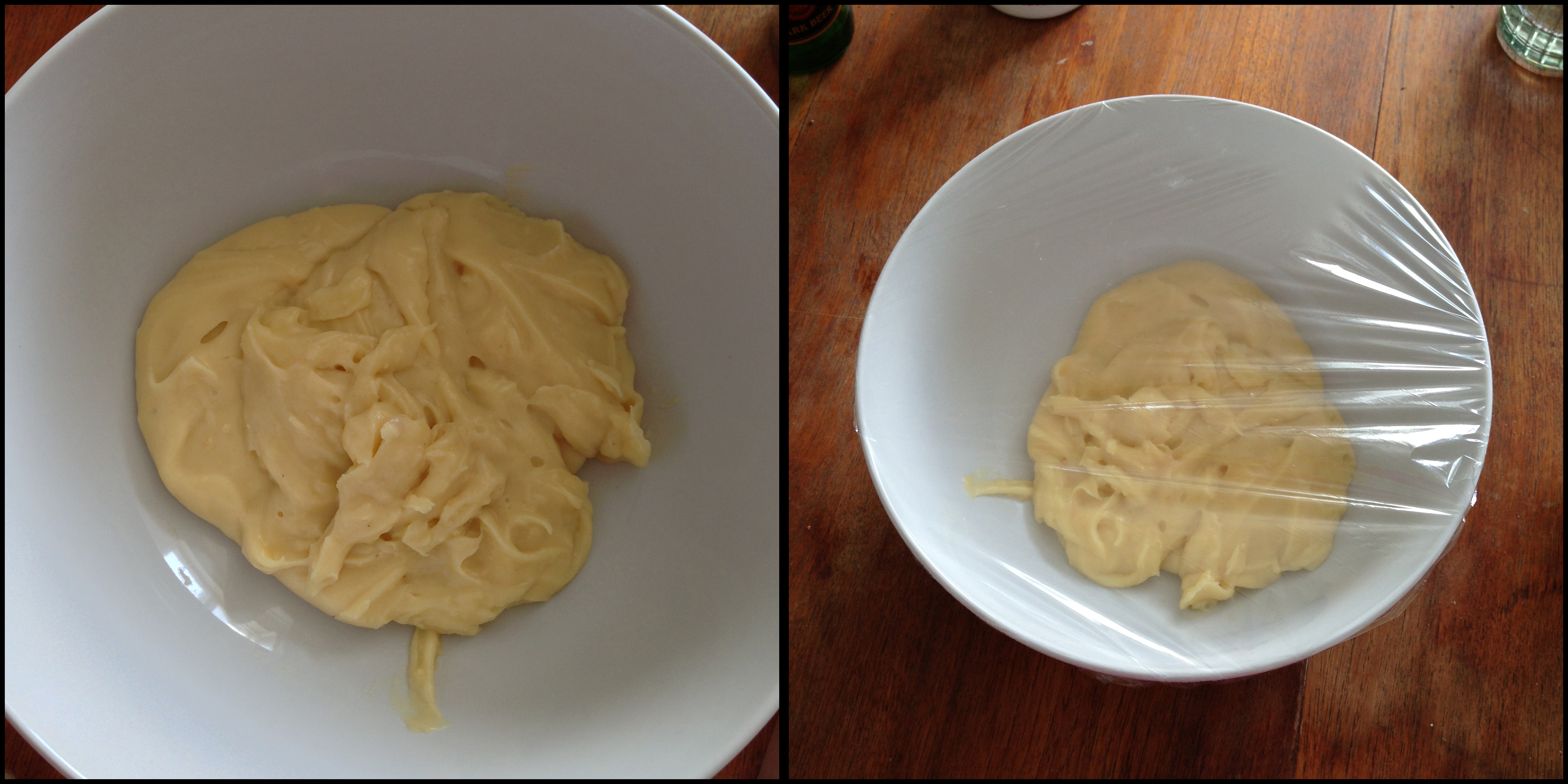 4. Take the cream away from the heat and put it back in a bowl. You need to cool it down to room temperature, that’s why I suggest you do the cream as the first step. You may also make the cream one day earlier and store it in the fridge. While waiting for the cream to cool down (and if you put in the fridge for 1 day, then while it is in the fridge), put a stretch film on the bowl.