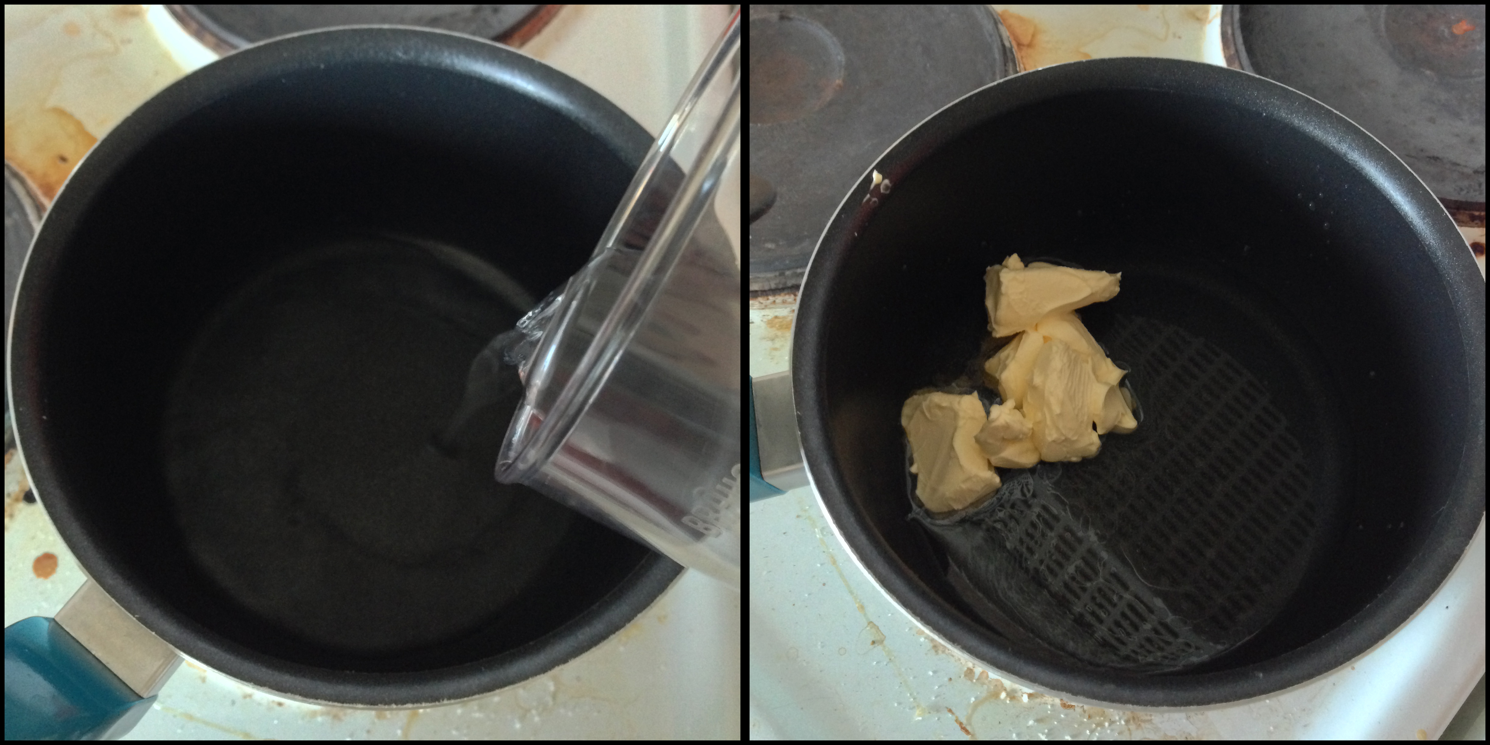 2. Pour 120 ml. water in a pan. Cut the butter into smaller pieces and add it to the water (we cut butter into smaller pieces so that it melts easier). Melt the butter on medium high heat (and constantly check it, you would not want to burn the butter).