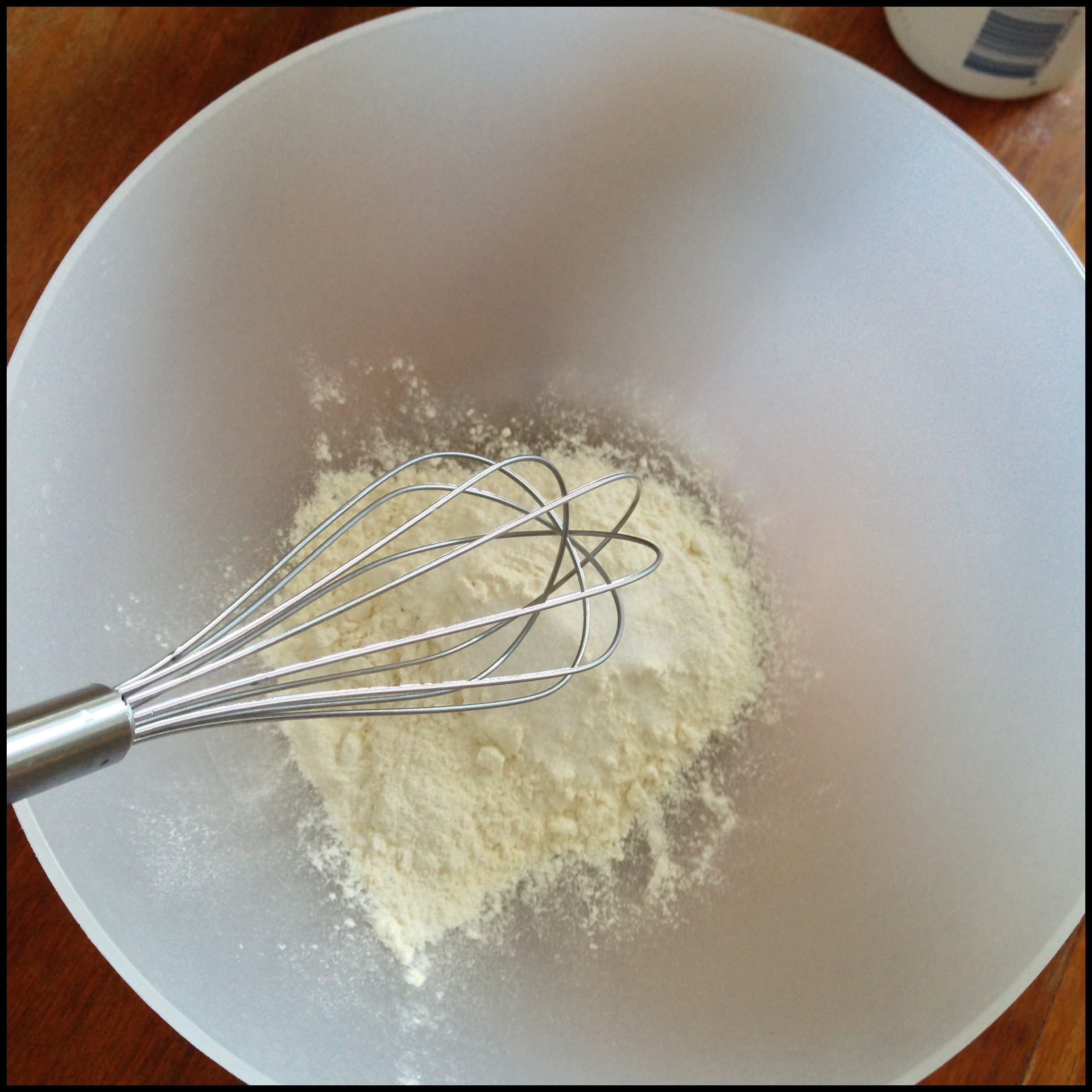 3. In a mixing bowl, put flour, sugar and salt and stir them with a whisk or just plain spoon.