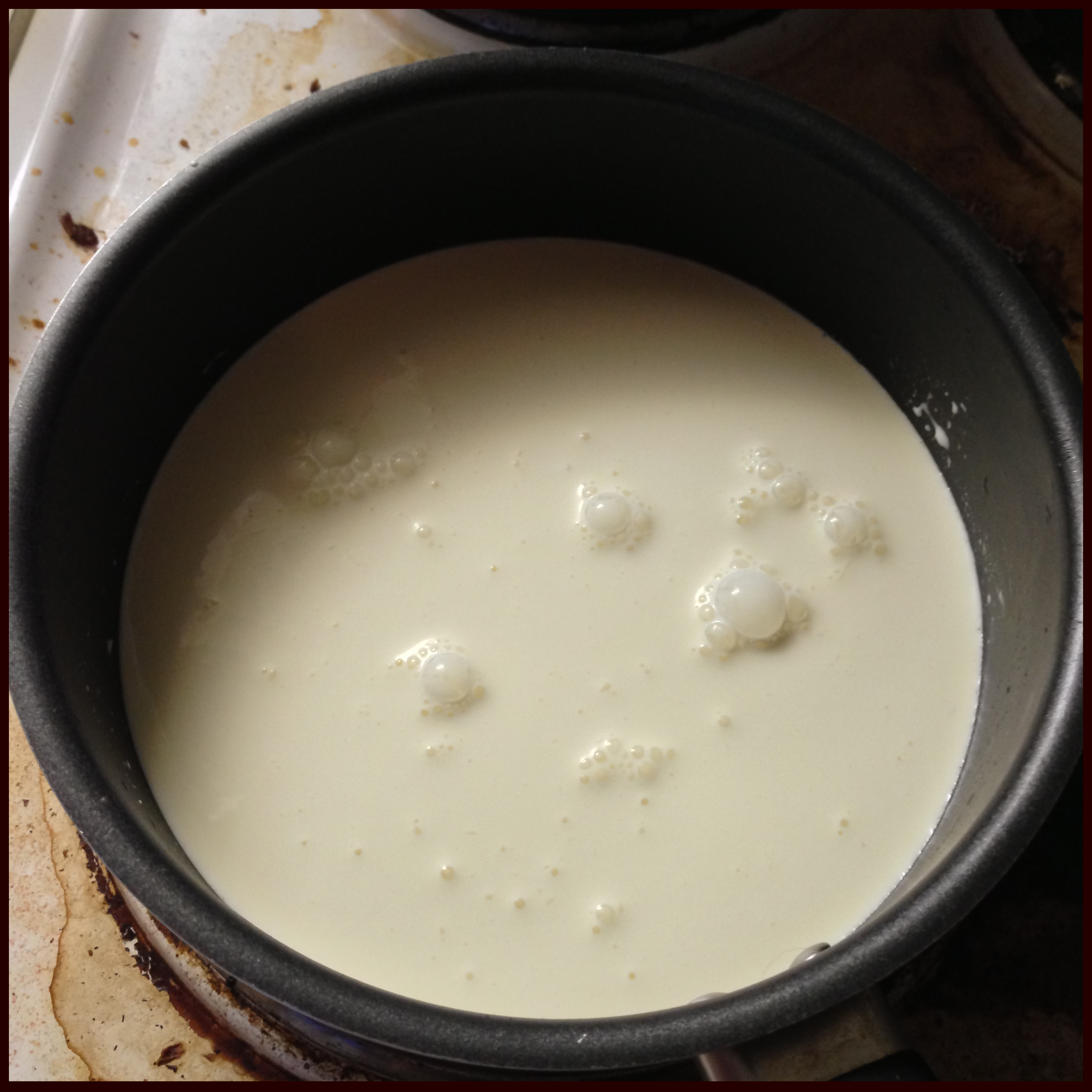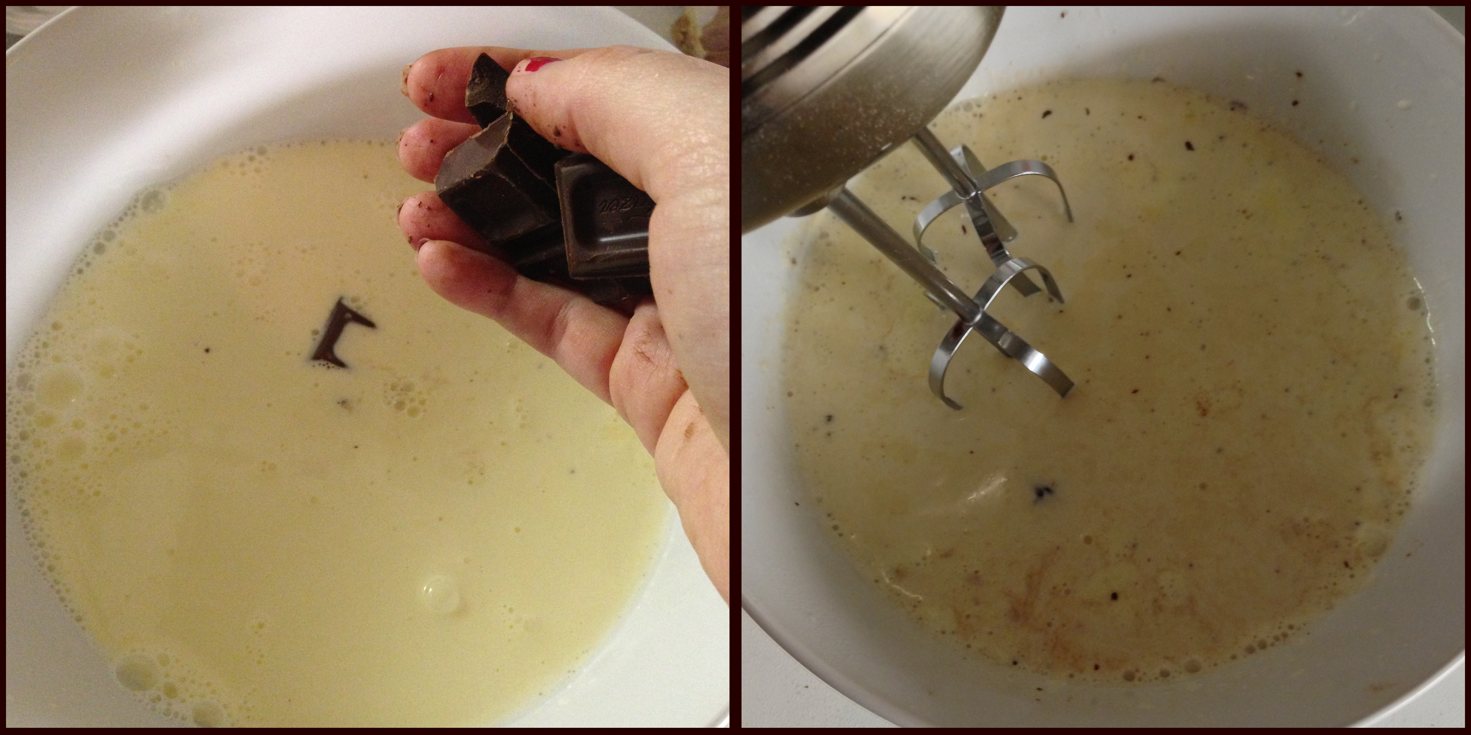 11. Now comes the topping. In these photos below I used the topping with the ingredients “B” above. It is a wet and rather liquid topping and it is hot when you pour it on the cake, But it makes it deadly delicious. Especially when you leave it to cool down in the fridge for a while. So how do you do it? Simple: Put heavy cream in a pan and bring it to a boil in medium heat. When it is boiled, put it in a heat proof bowl. Put chocolate pieces in the cream and mix them well with an electric mixer. When you have a smooth cream, pour it on top of the cake, yummmm…!