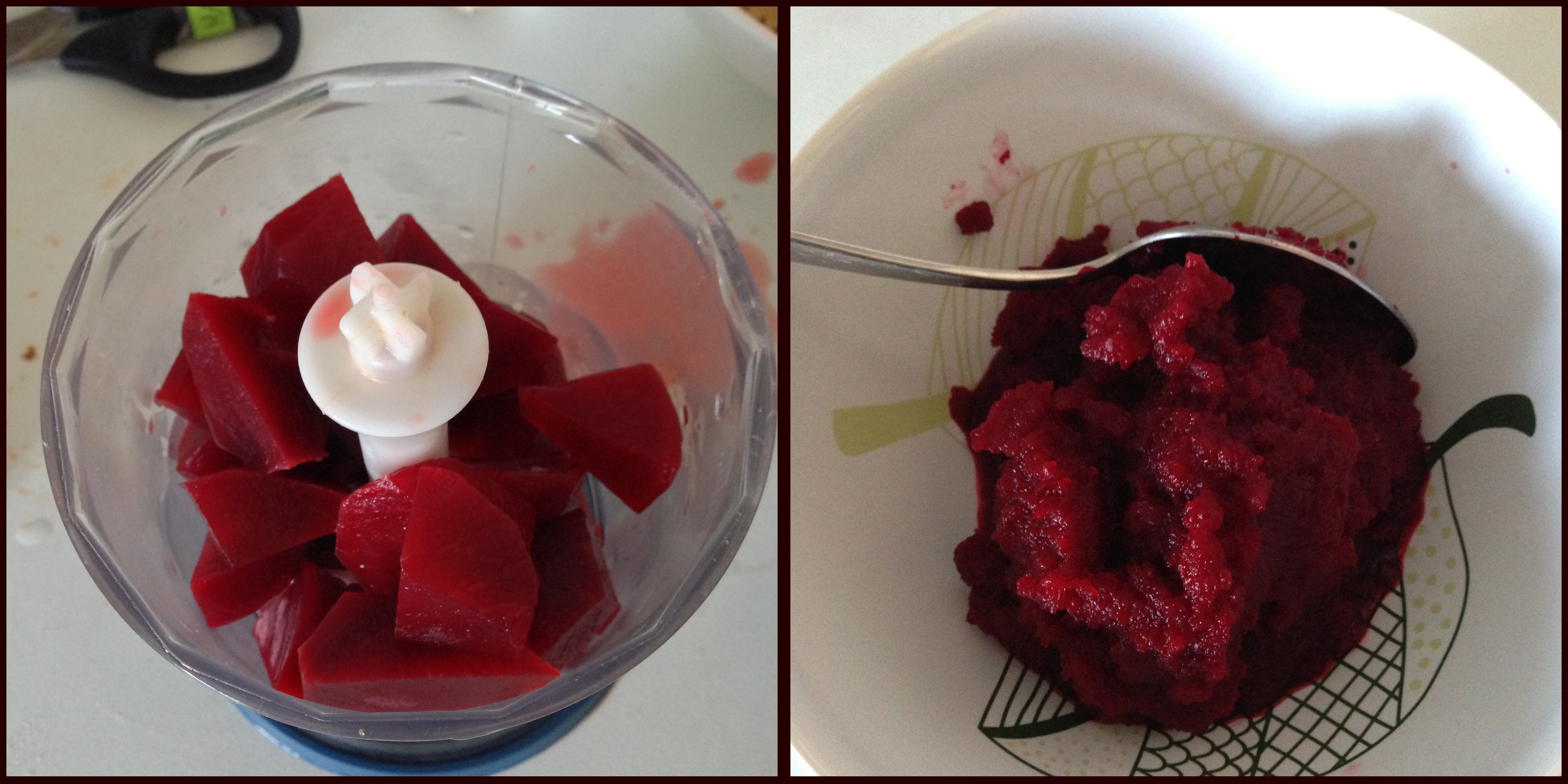 2. Put the cooked beets in a food processor and turn them into puree. Put aside in a small bowl when it is ready.