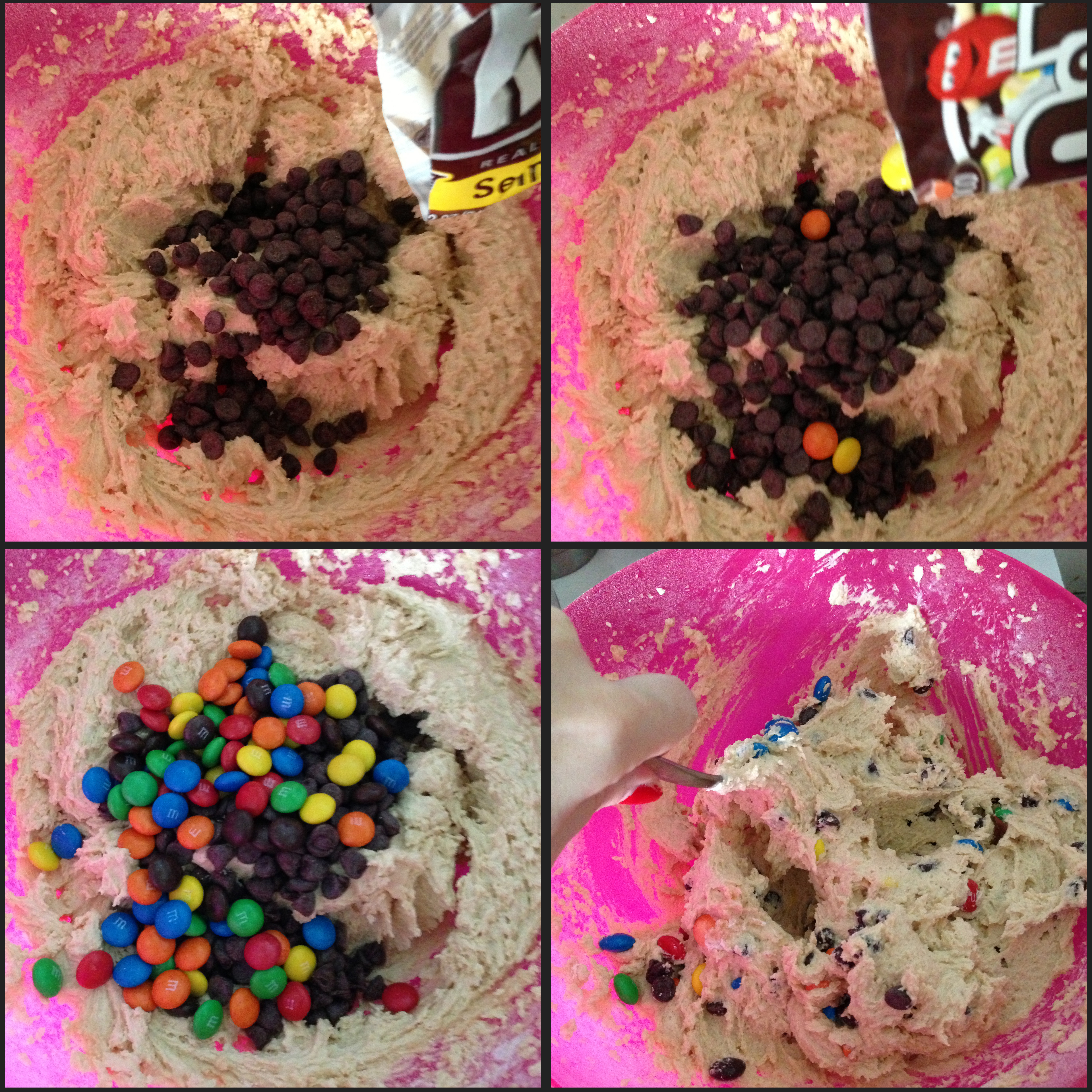 5. Add chocolate chips and M&Ms. Mix it with a spoon, try not to crack the chocolate chips or M&Ms (that’s why you just mix it with a spoon not the electric mixer!!).