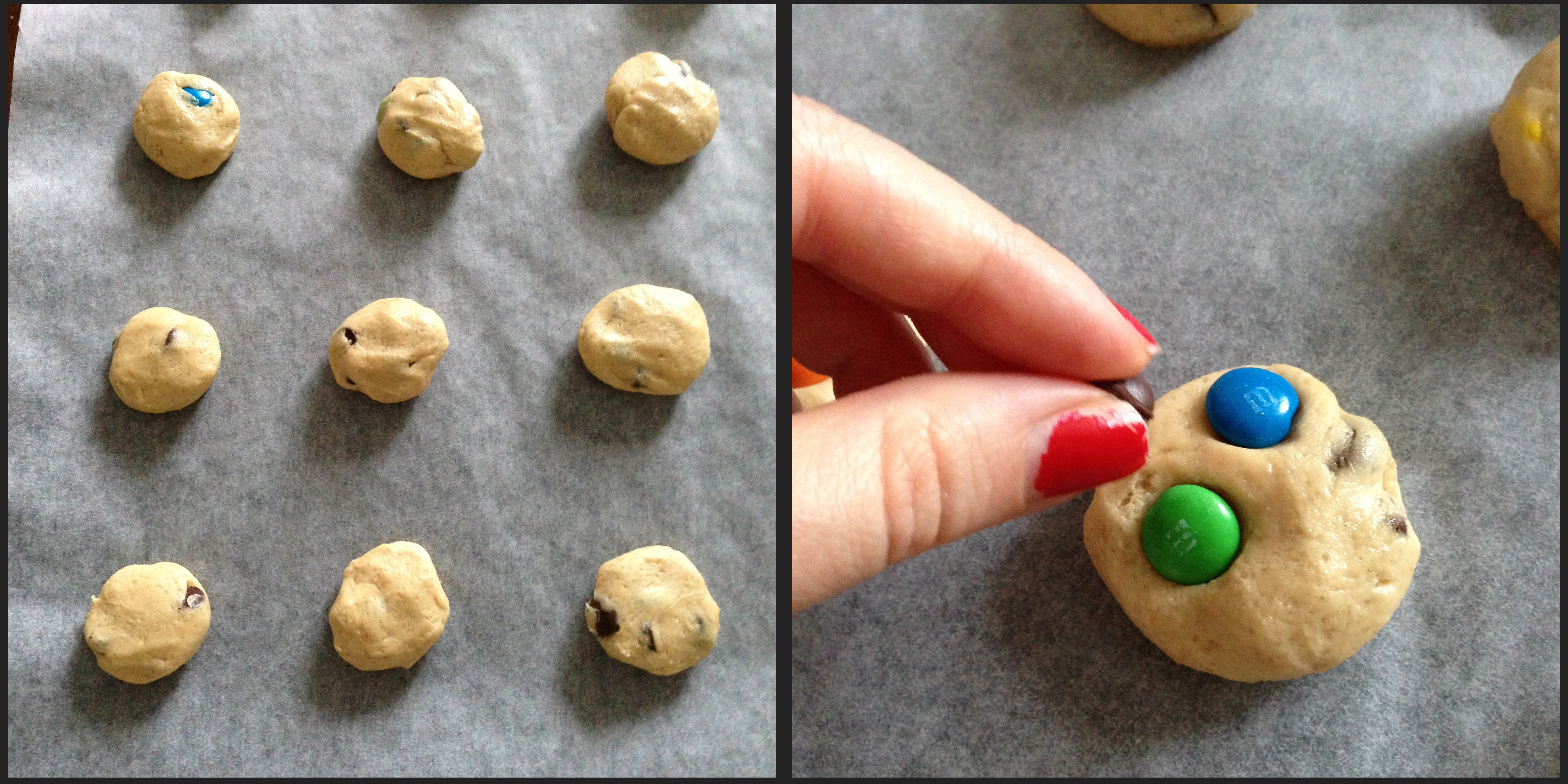 8. Put a baking sheet on an oven tray. Take a piece from the dough, a little bit smaller than a walnut size. Remember, they will spread while baking. Make a disc shape out of that piece with your hand and place it on the tray. If you want the colourful M&Ms and chocolate chips to be seen on the surface of the cookies then just add a few on each cookie piece before you put them in the oven. Make sure the chips and M&Ms added later stick well to the cookie.