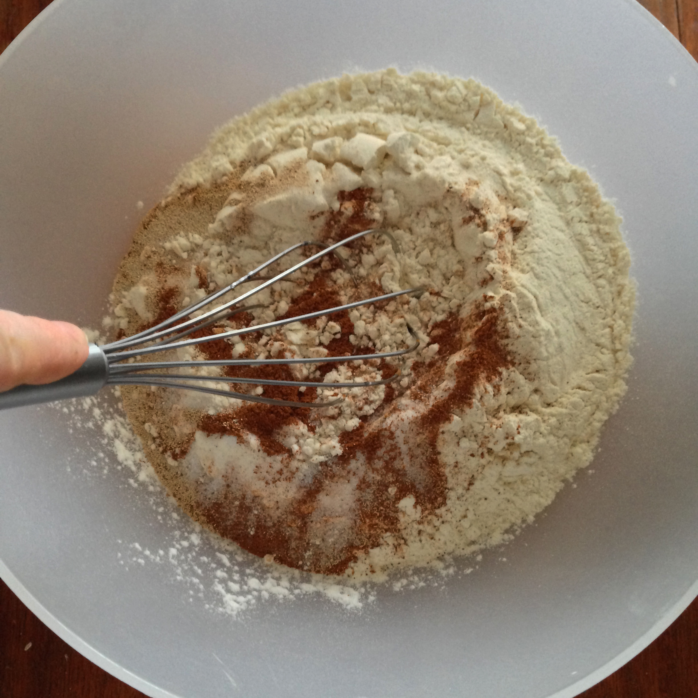 1. In a big bowl, put flour, sugar, salt, dry yeast and cinnamon, and whisk a little.