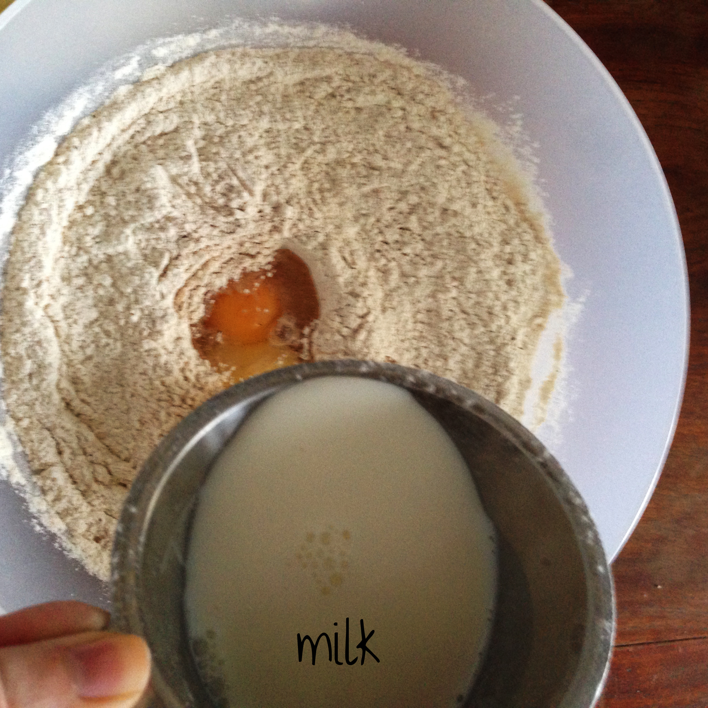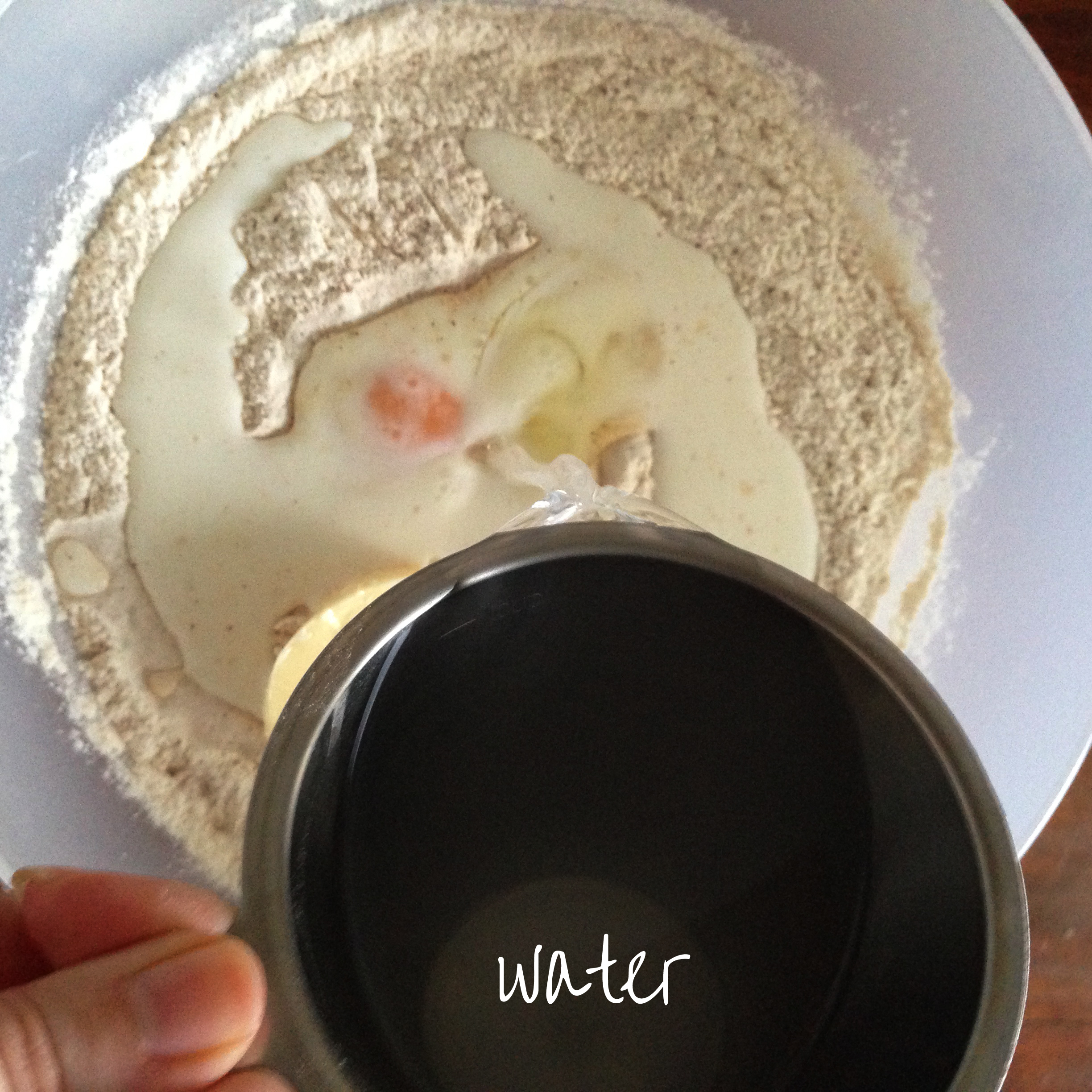 2. Add egg, butter (in room temperature), milk and water. Start kneading the dough inside the bowl until it comes together to form a ball. If it is too sticky, you can add a bit more flour. On the contrary, if it is too dry, you can add more water. But add those in small amounts if needed.