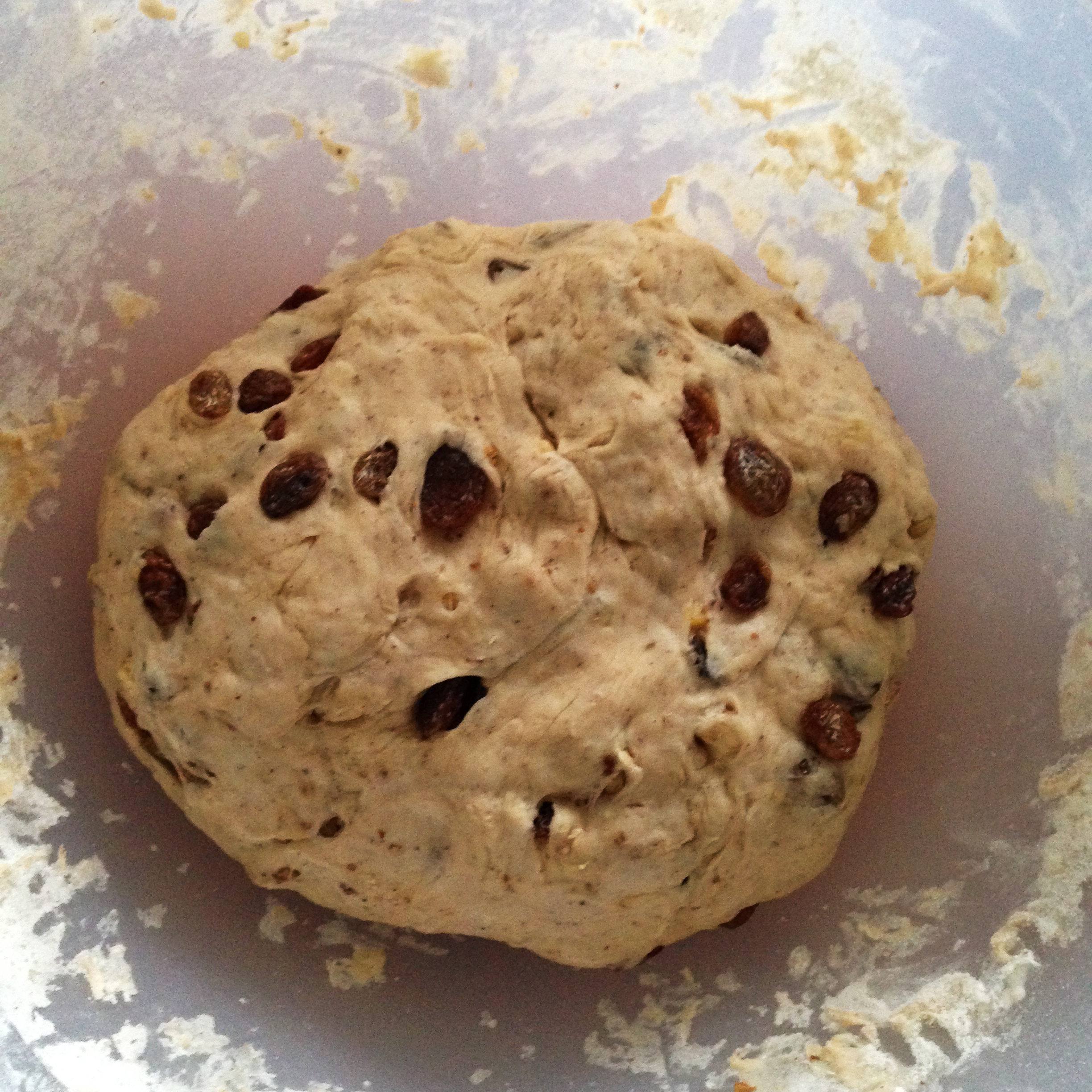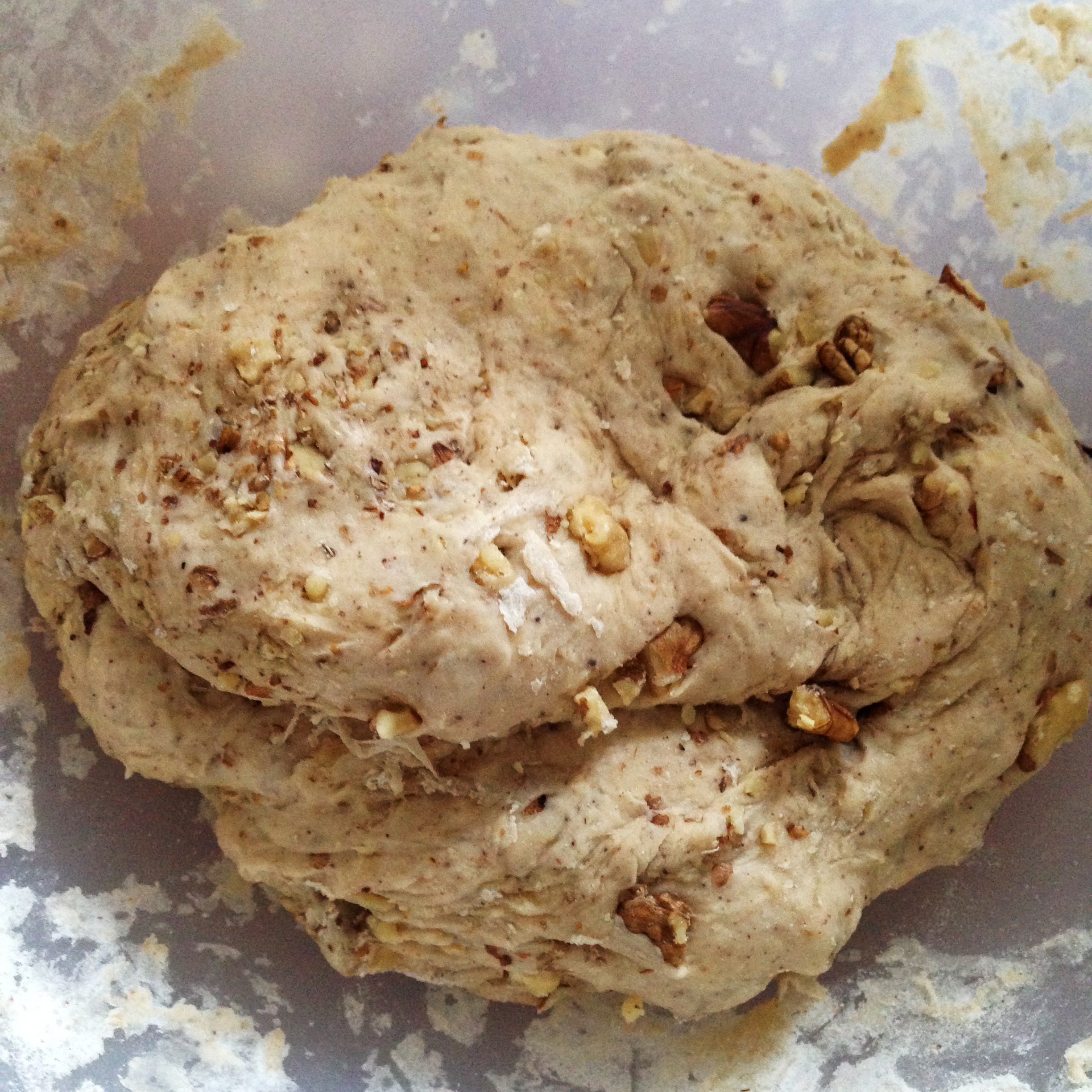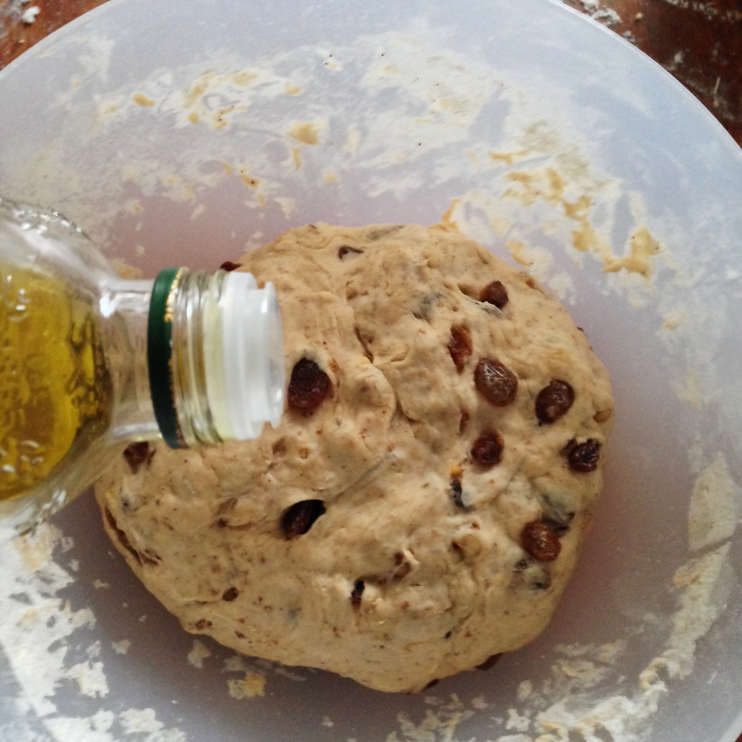 5. Put the dough again in a bowl and add walnut and raisins. Knead a little bit more, just until raisins and walnuts incorporate the dough. Do not knead too much or too hard at that point, not to crush the raisins especially. Make a ball shape with the dough.