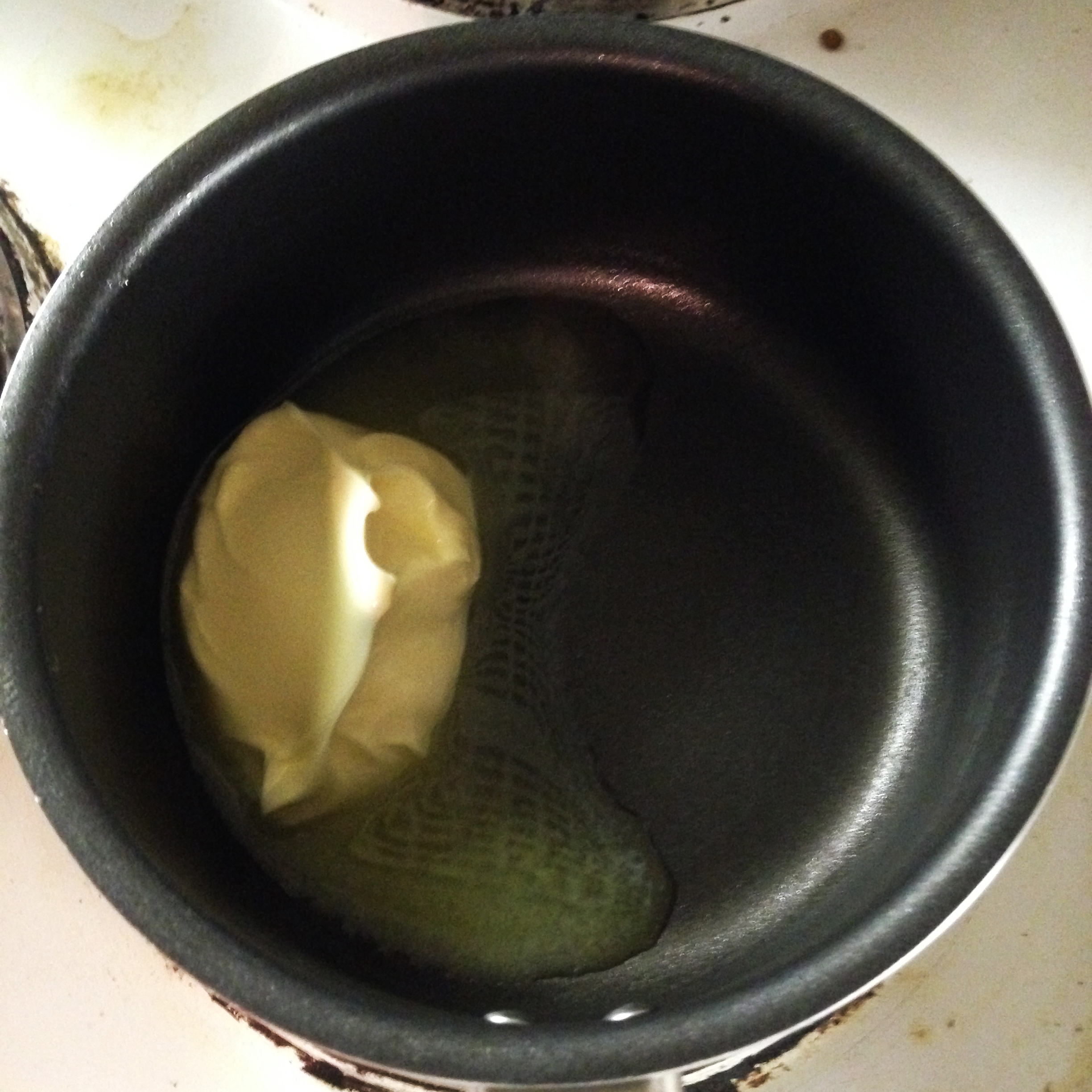 9. While the bread is baking, prepare the topping. Melt 1 tbsp butter in a pan. In a shallow bowl or on a plate, mix cinnamon and sugar evenly. This is important: you should have these ready before the bread comes out of the oven.