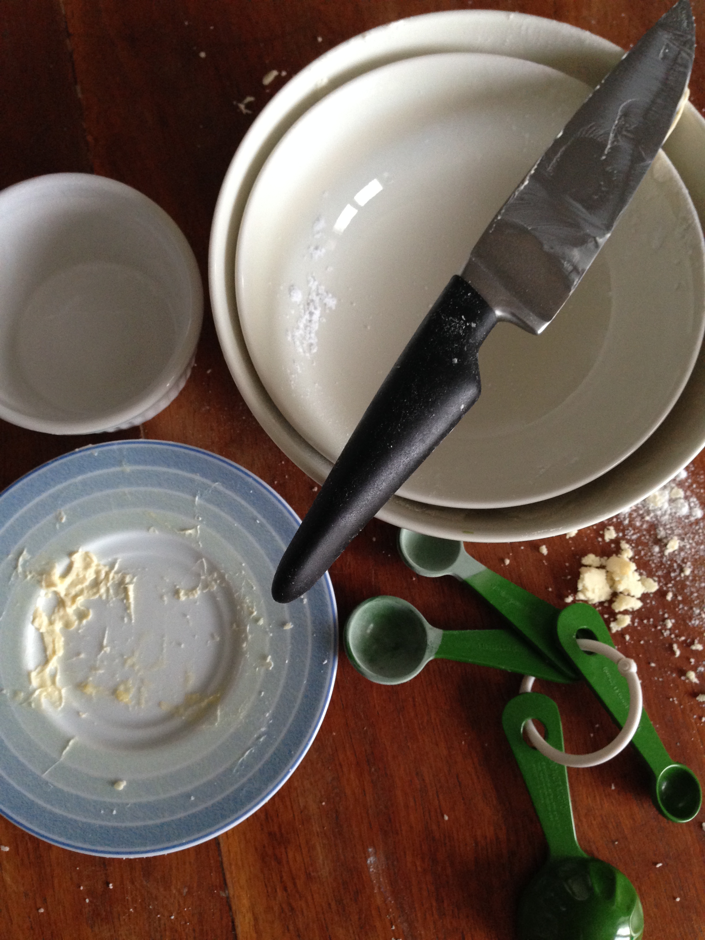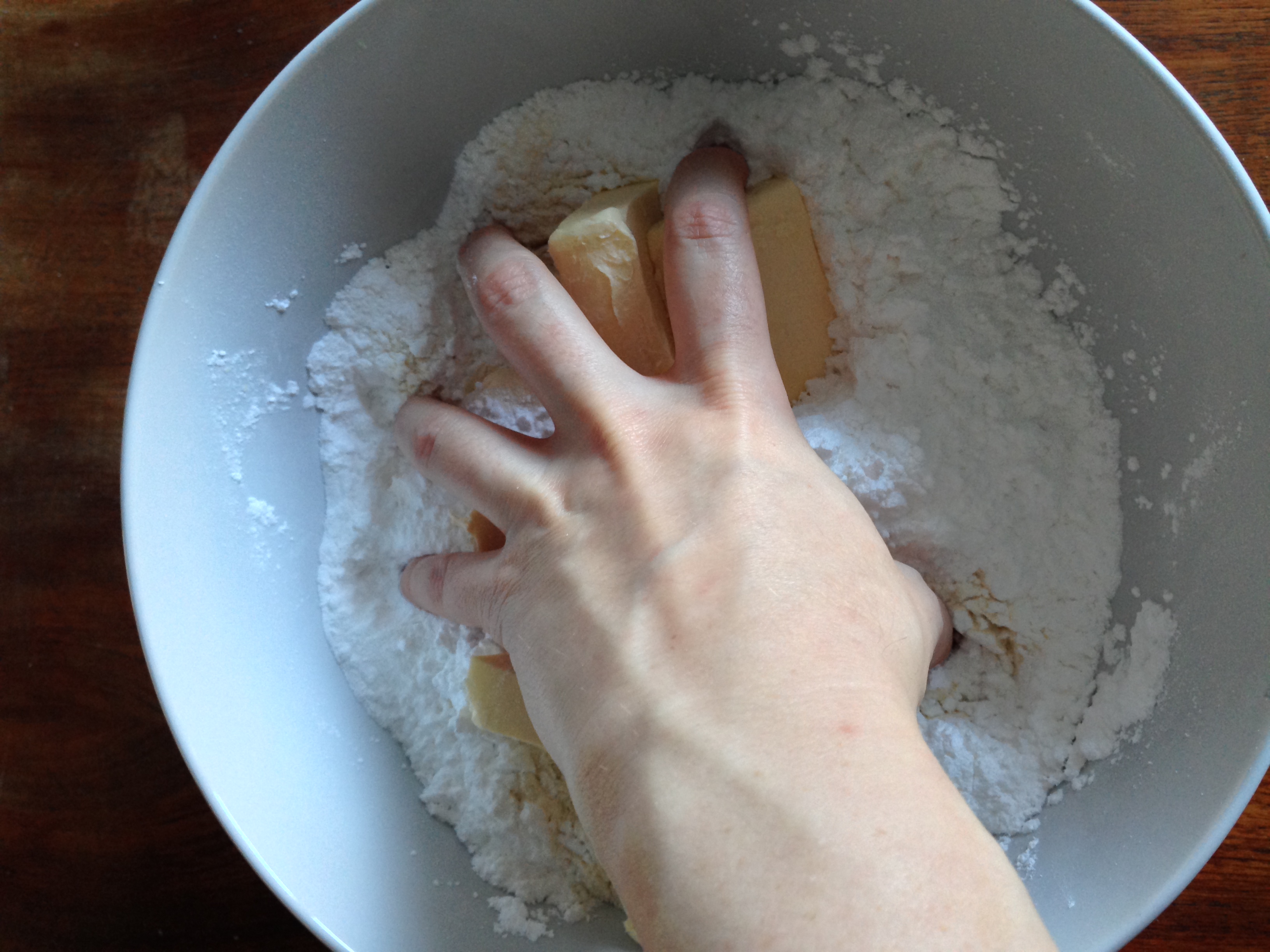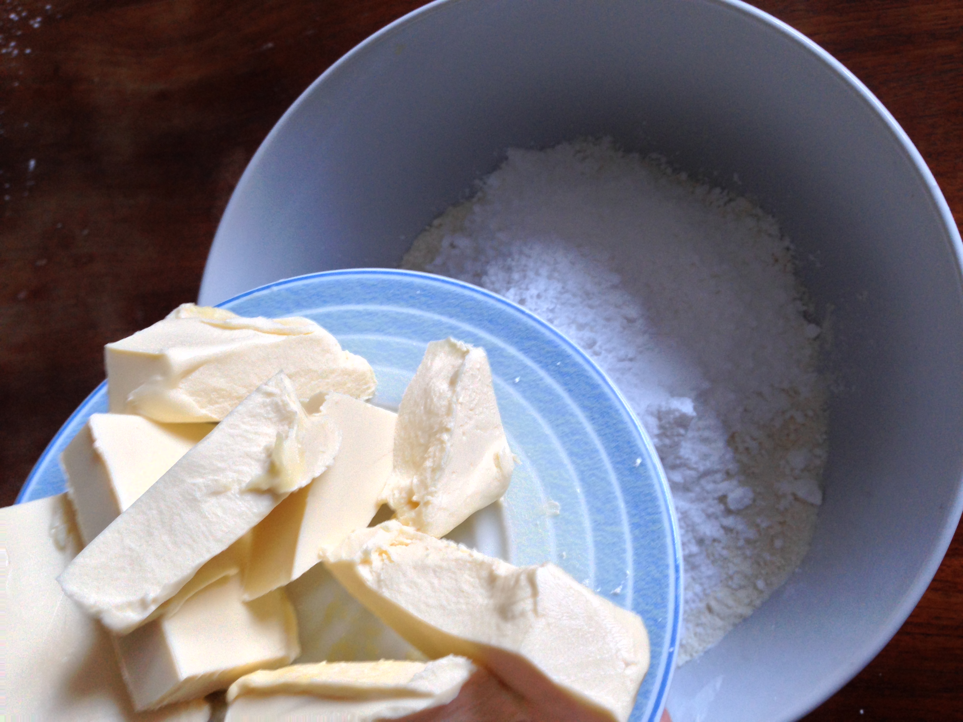 2. Put flour, powdered sugar, baking powder and butter (cut into smaller pieces just to make it easier to deal with) in a bowl and start kneading.