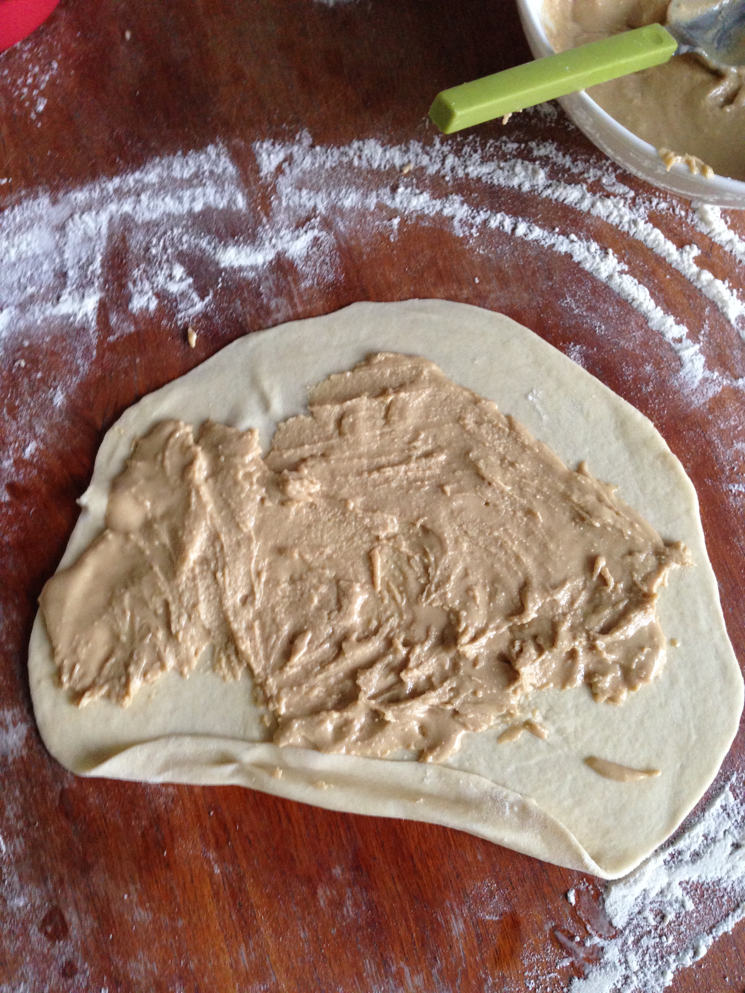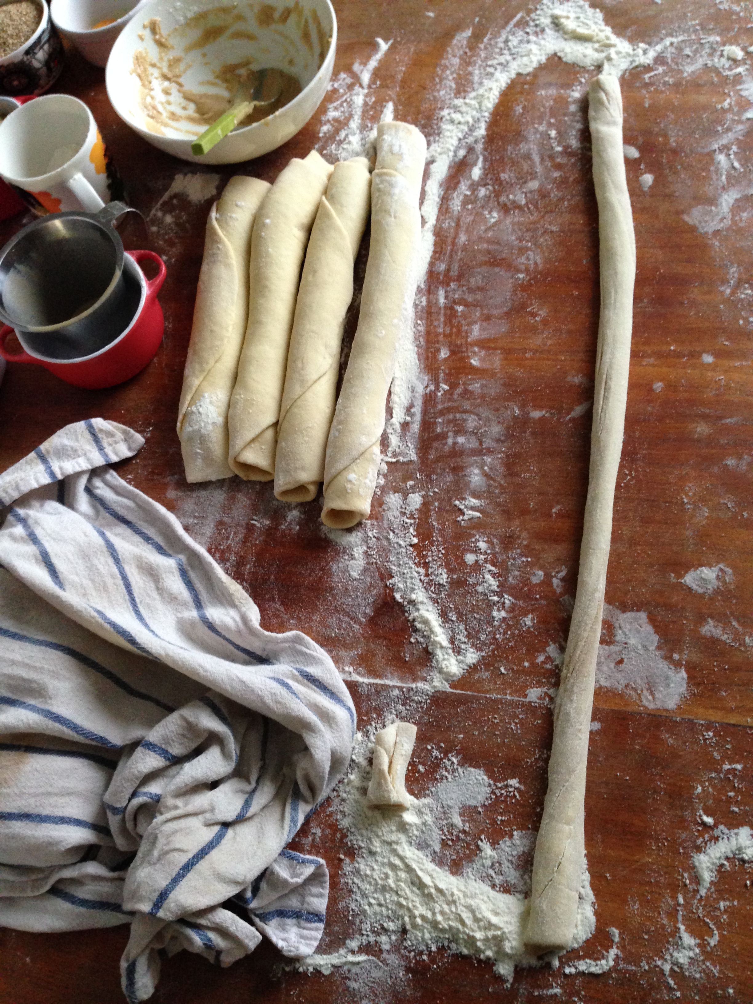 7. Put about 2 tablespoons of tahini mixture on the rolled piece of dough. I did not cover the whole piece, which made the final pastry quite mildly sweet. If you want extremely sweet then you can put more tahini – powdered sugar mixture in each piece (but you would need bigger tahini and powdered sugar measurements than above). When you spread enough tahini mixture, start rolling the dough from one side. Put each rolled piece of dough aside and cover with another kitchen towel, leaving them like that for 15 minutes to give them a final proof.