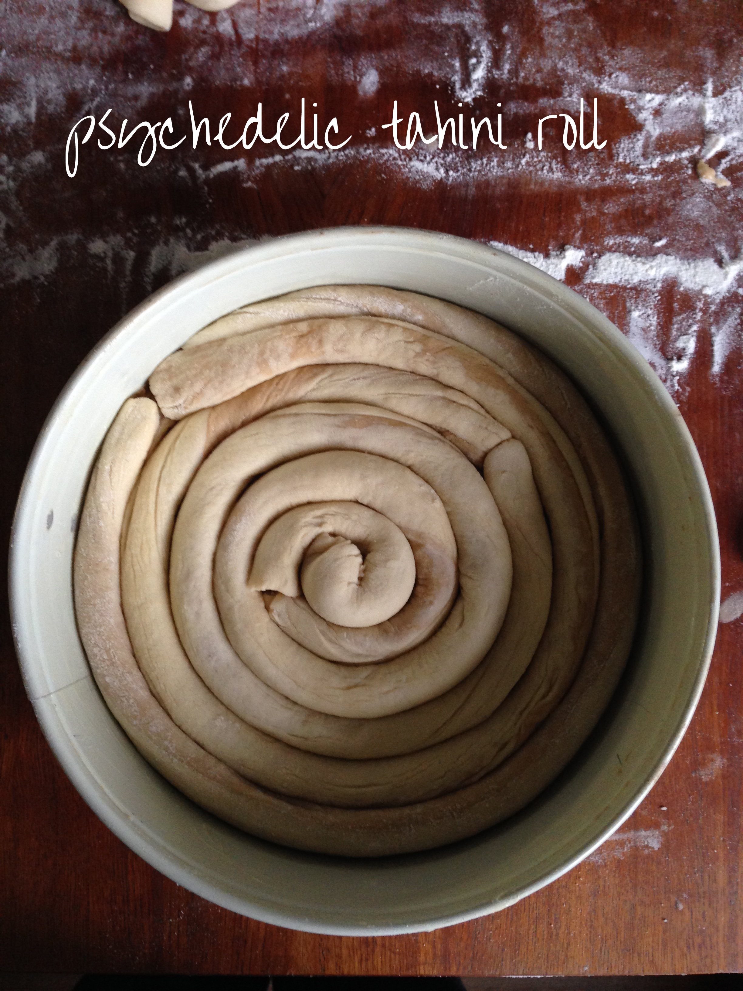 Today’s recipe is a rather less sweet (but still, sweet) pastry, again from Turkish cuisine – tahini roll. It is quite crunch on the outside but soft and sweet on the inside and especially before you put it in the oven, it has a rather psychedelic look in the baking mould…