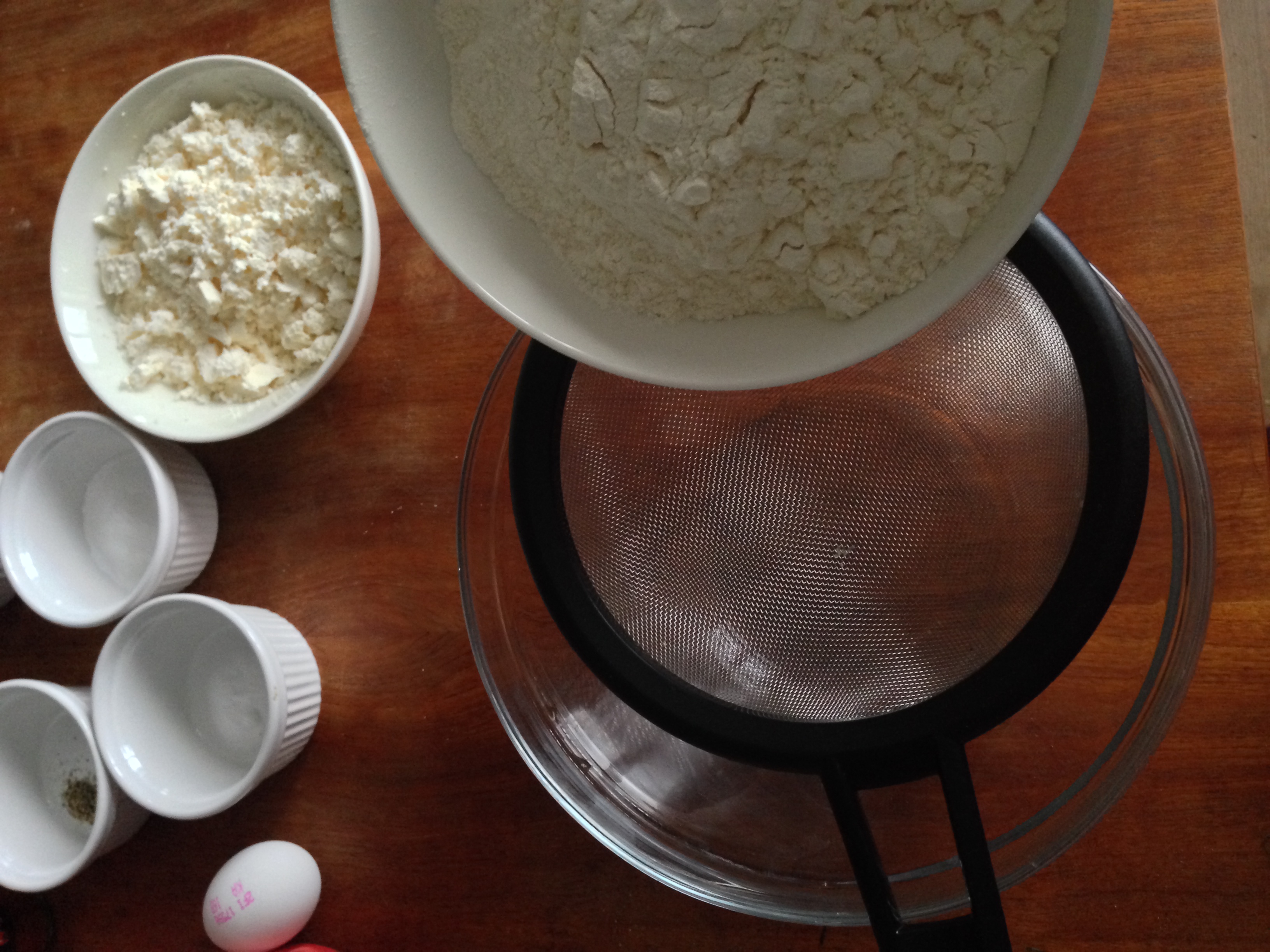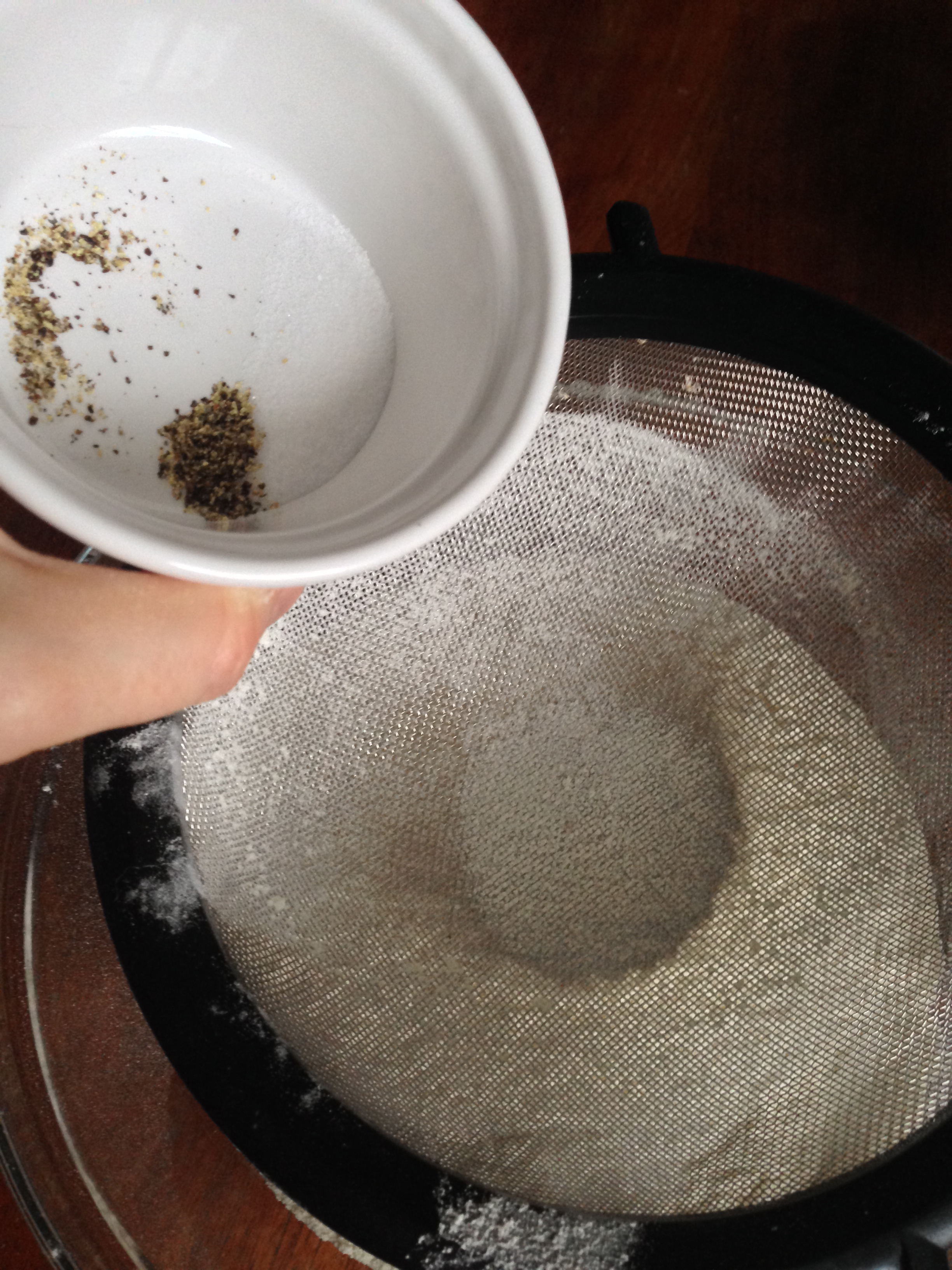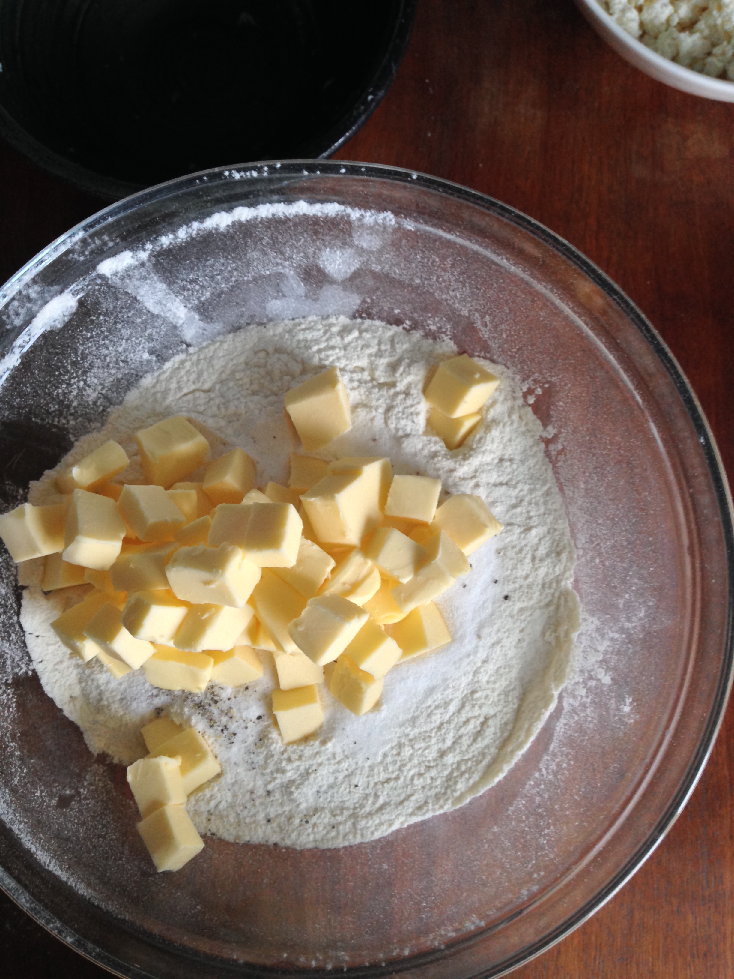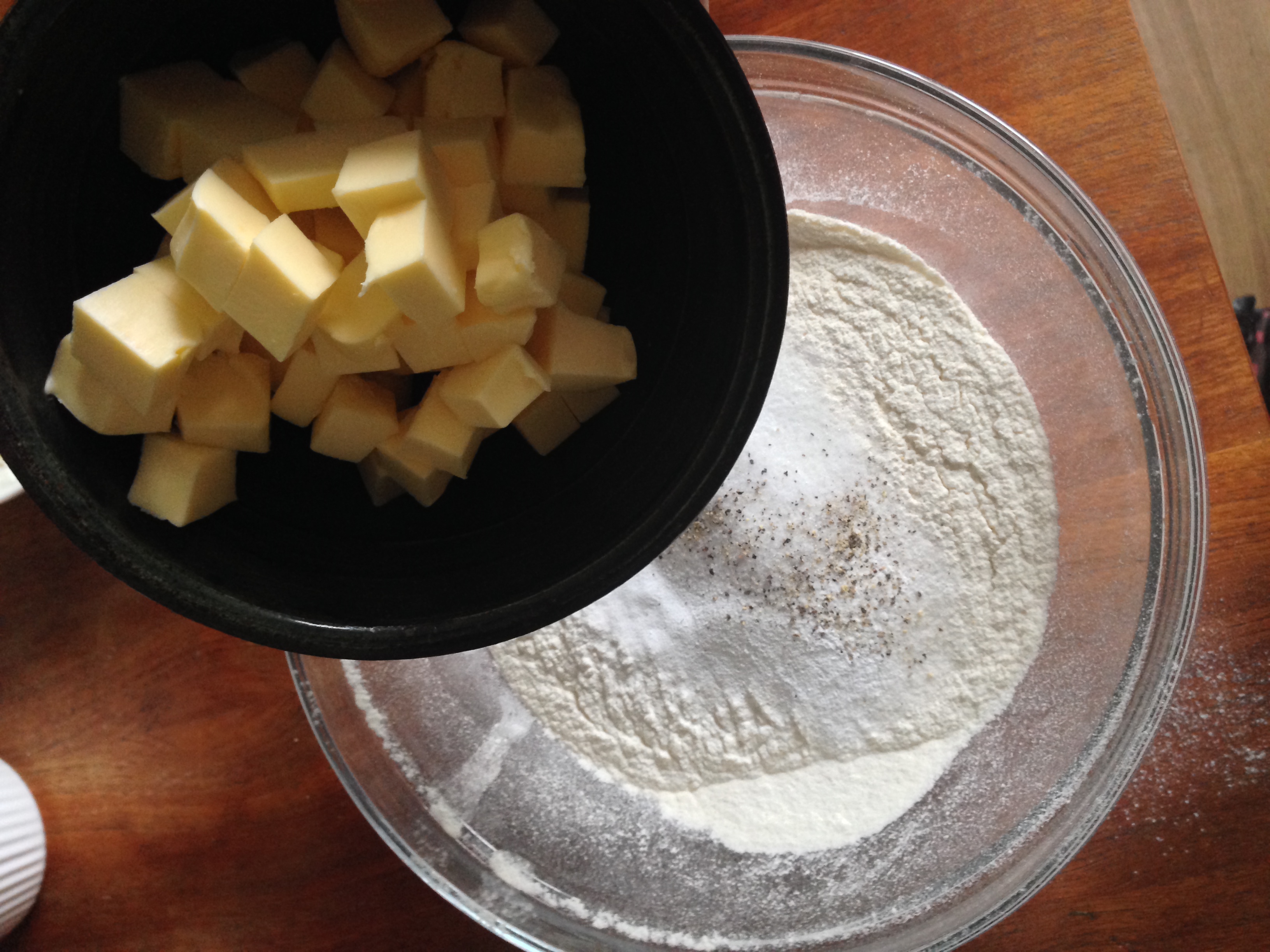 2. Into a big bowl, sift flour, salt, sugar, baking powder, baking soda and black pepper. Add the cubes of butter and just cut it in, you will end up small crumbles of dry ingredients & butter mixture.