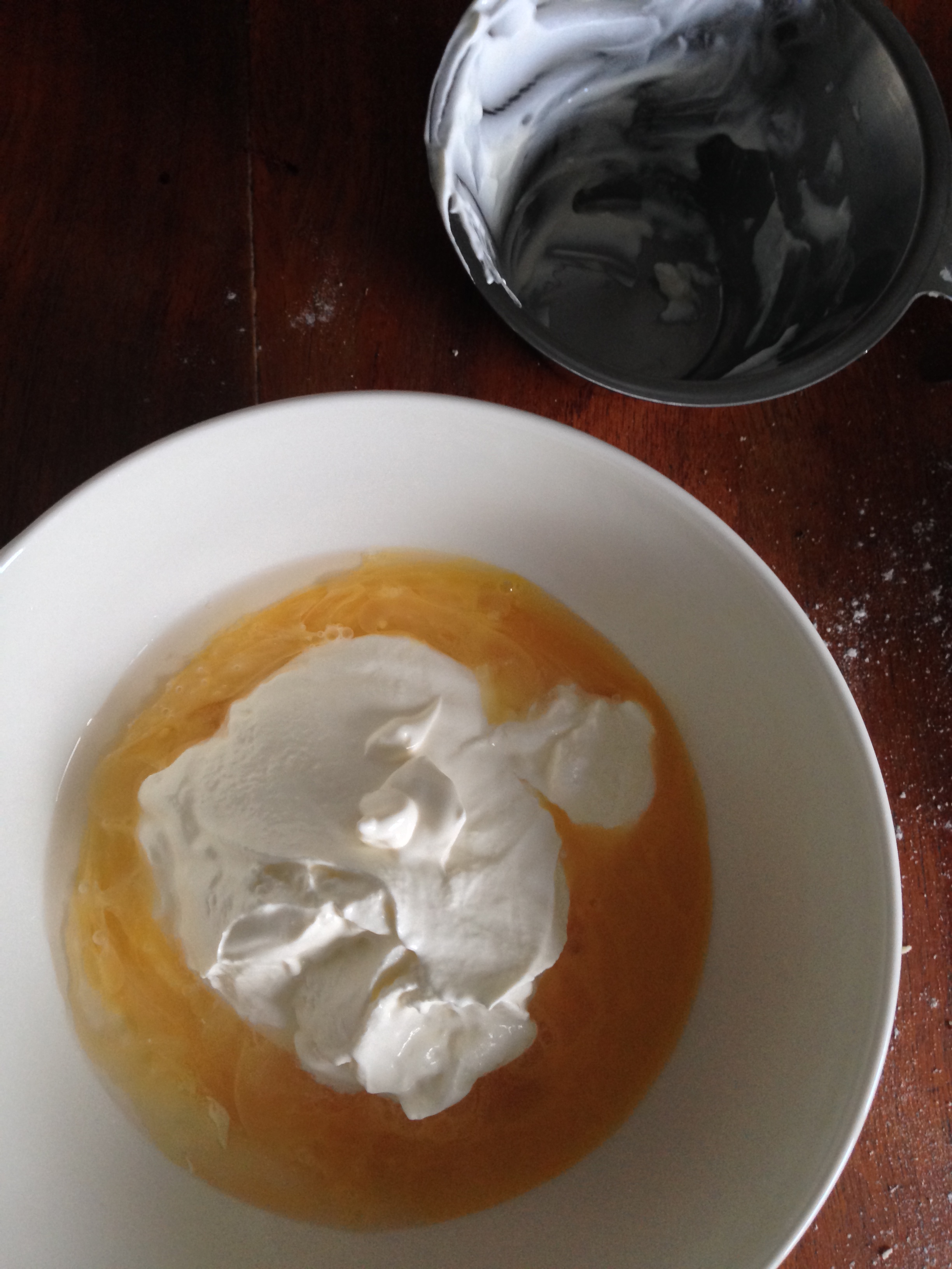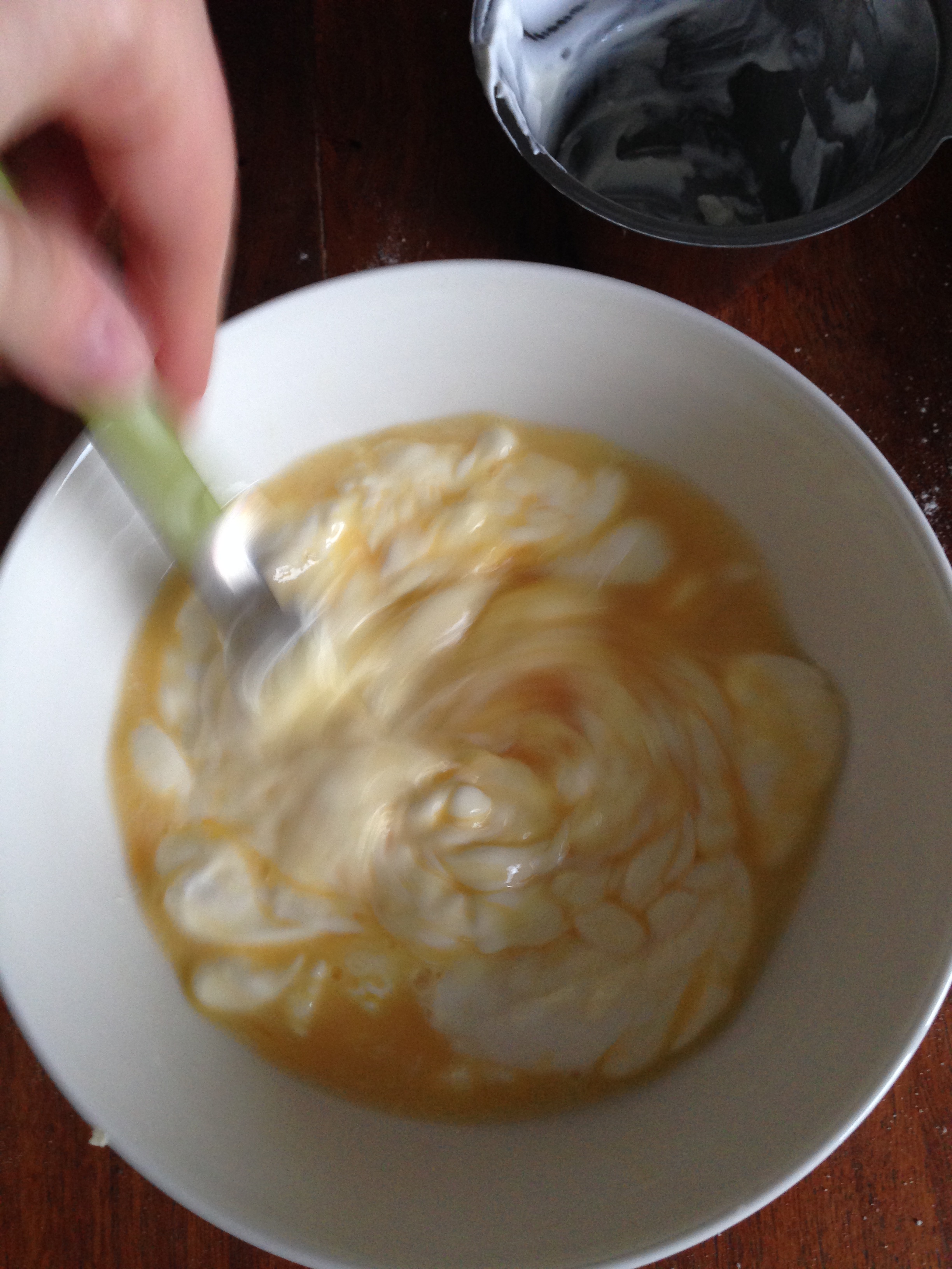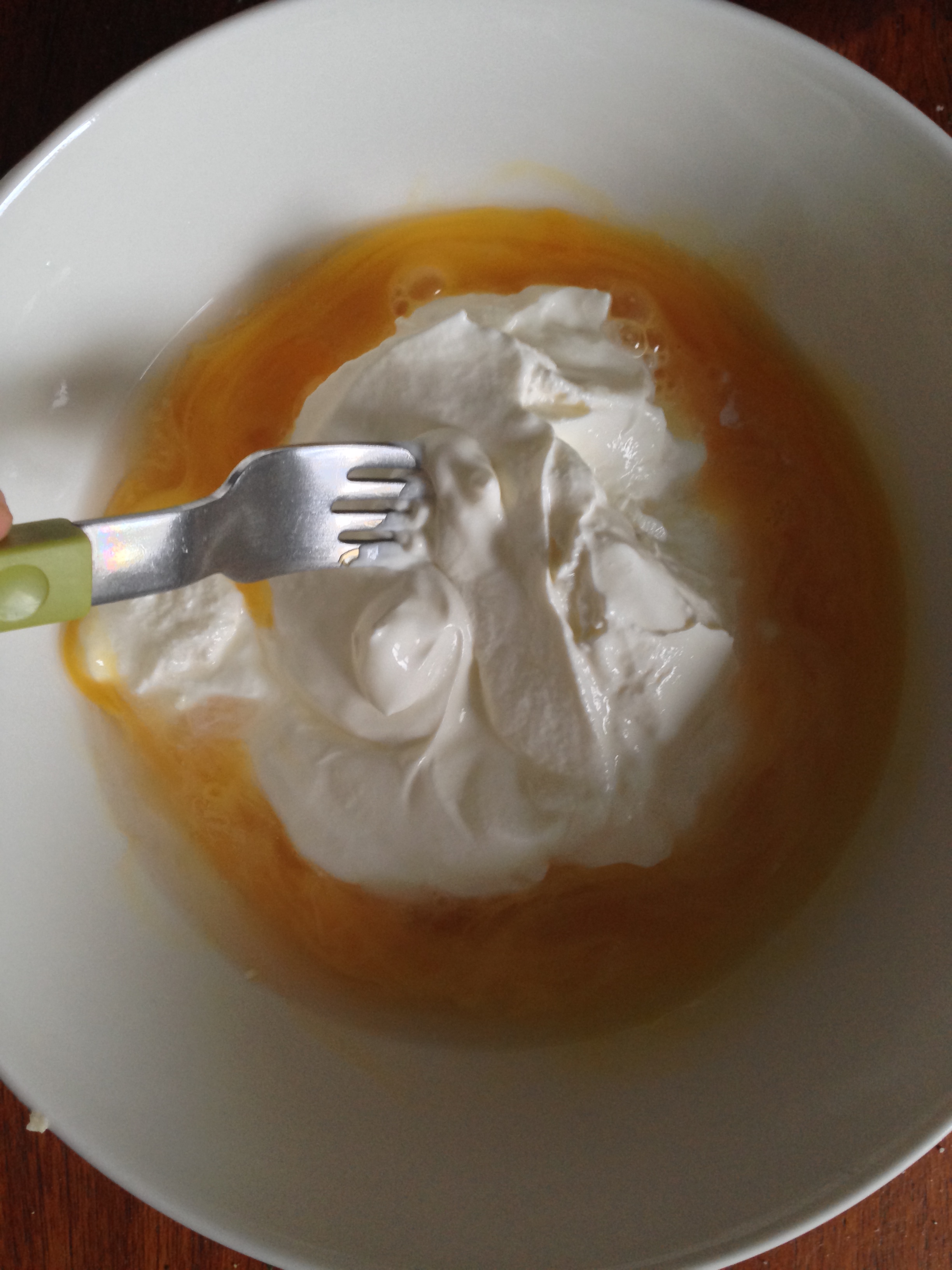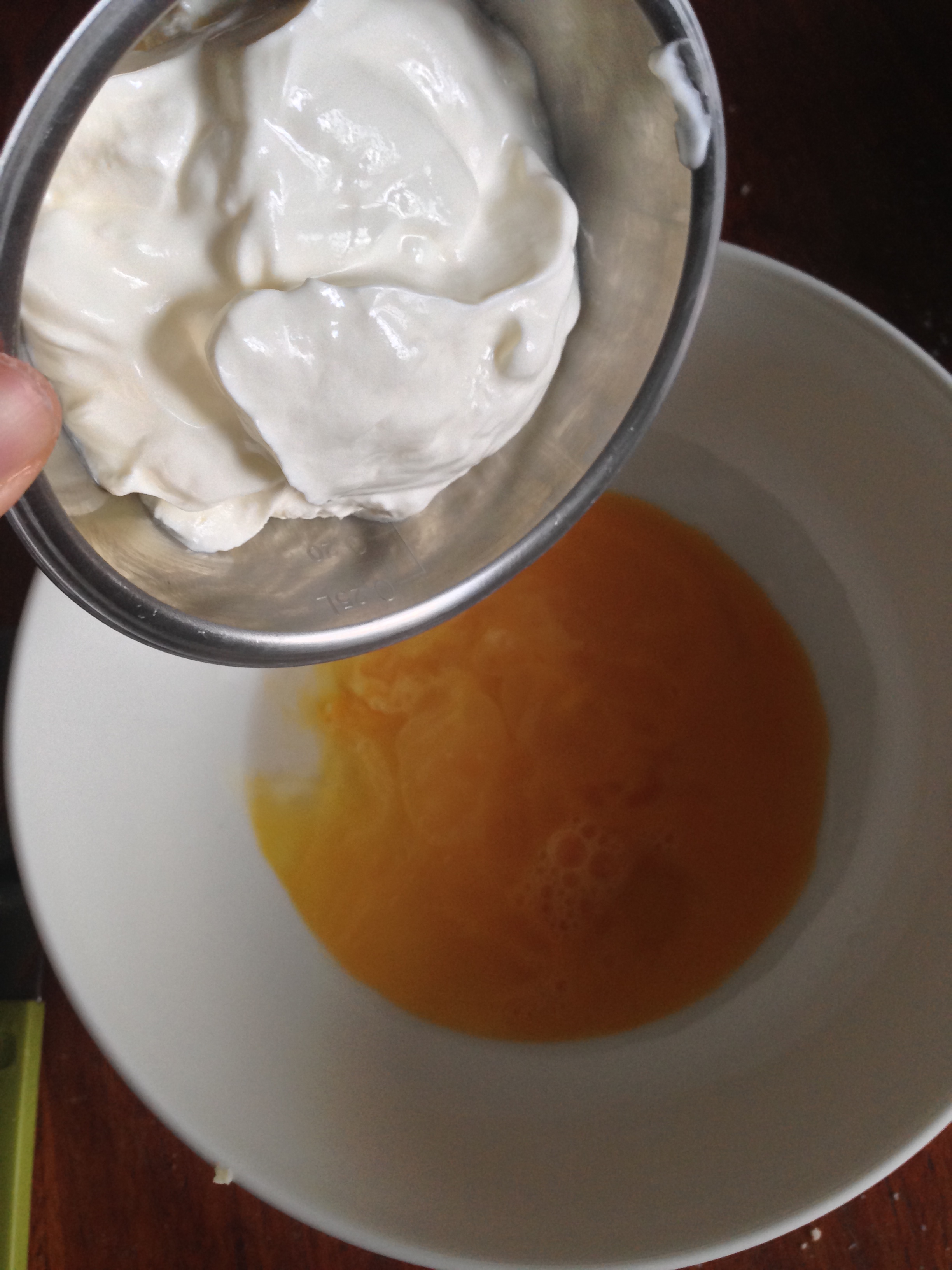 3. In a separate bowl, put the beaten egg, cold water and sour cream. Beat them well with the help of a fork (or another tool, like a whisk).
