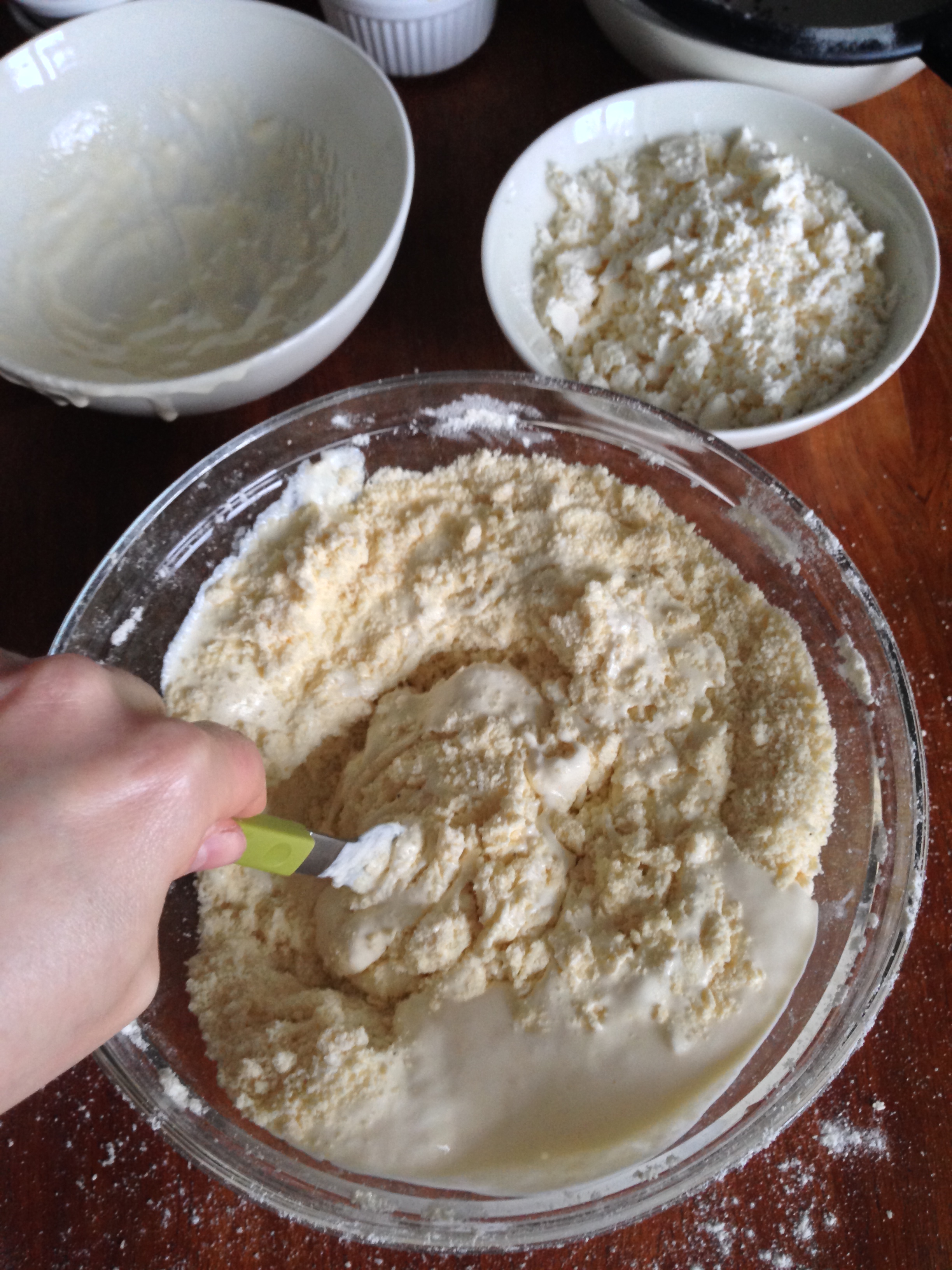 4. Add the wet ingredients to the dry ones and mix them again with a fork or with a whisk, until they are blended well together. It should look sticky as the picture, do not try to have a smooth result.
