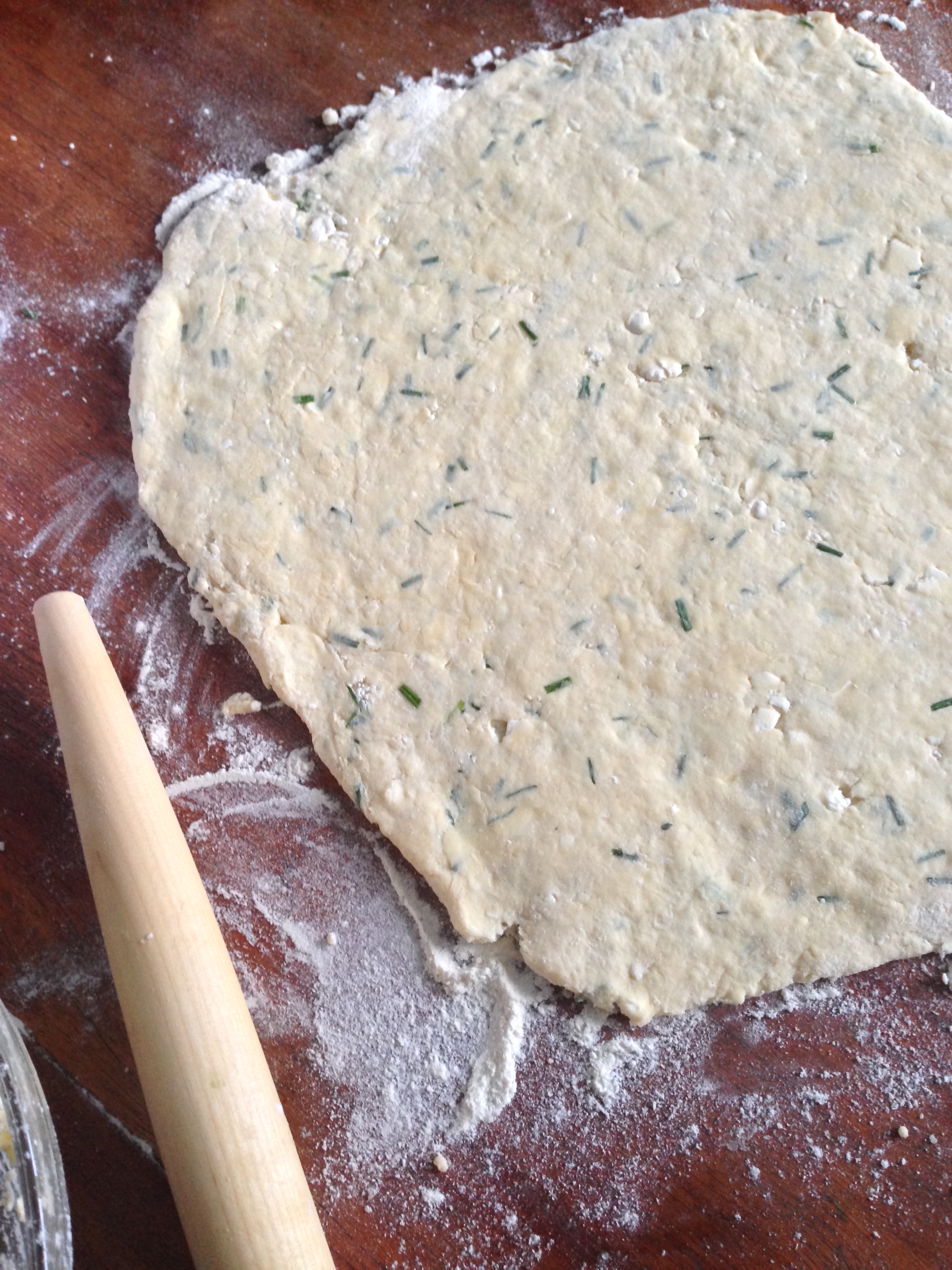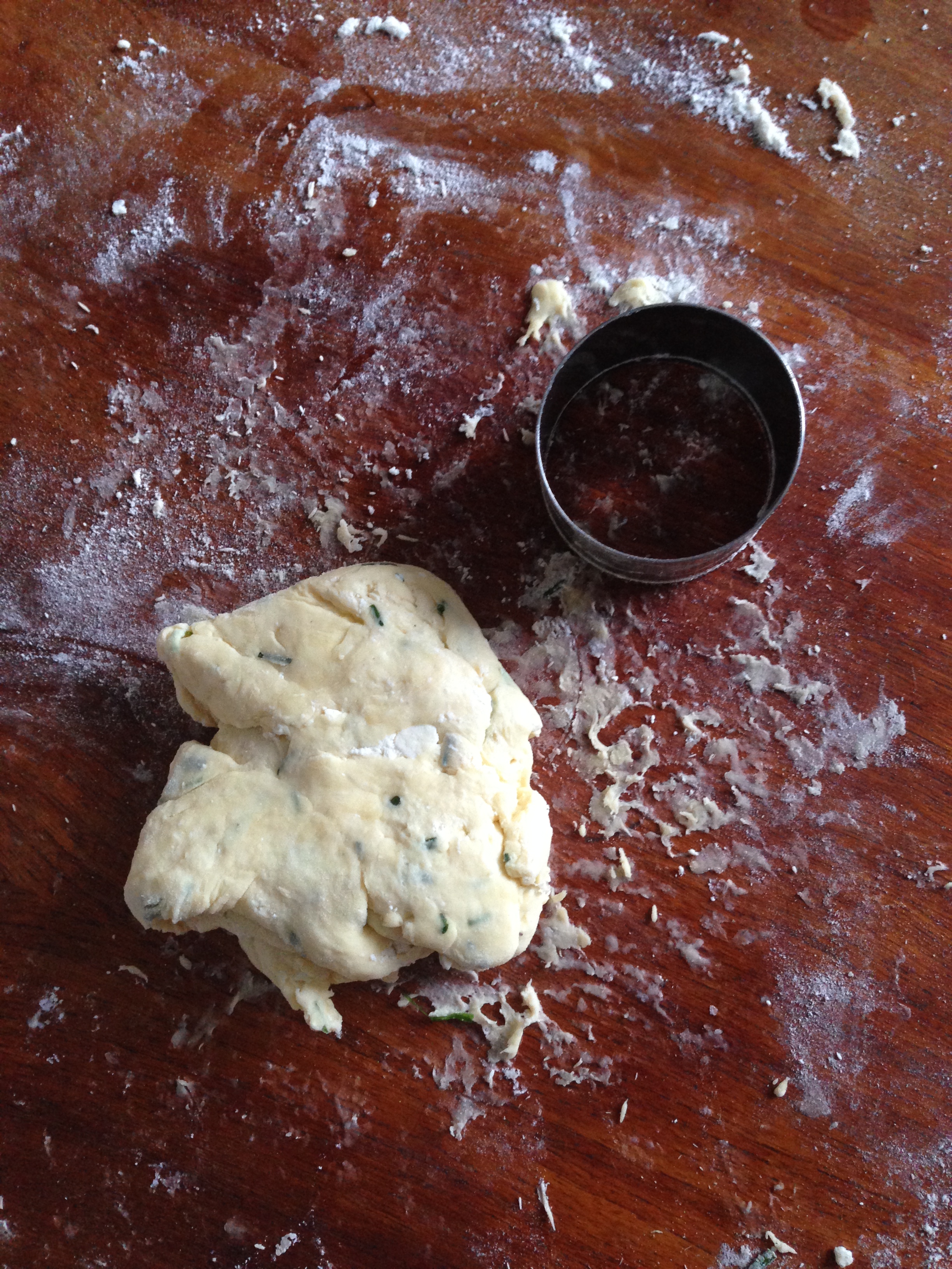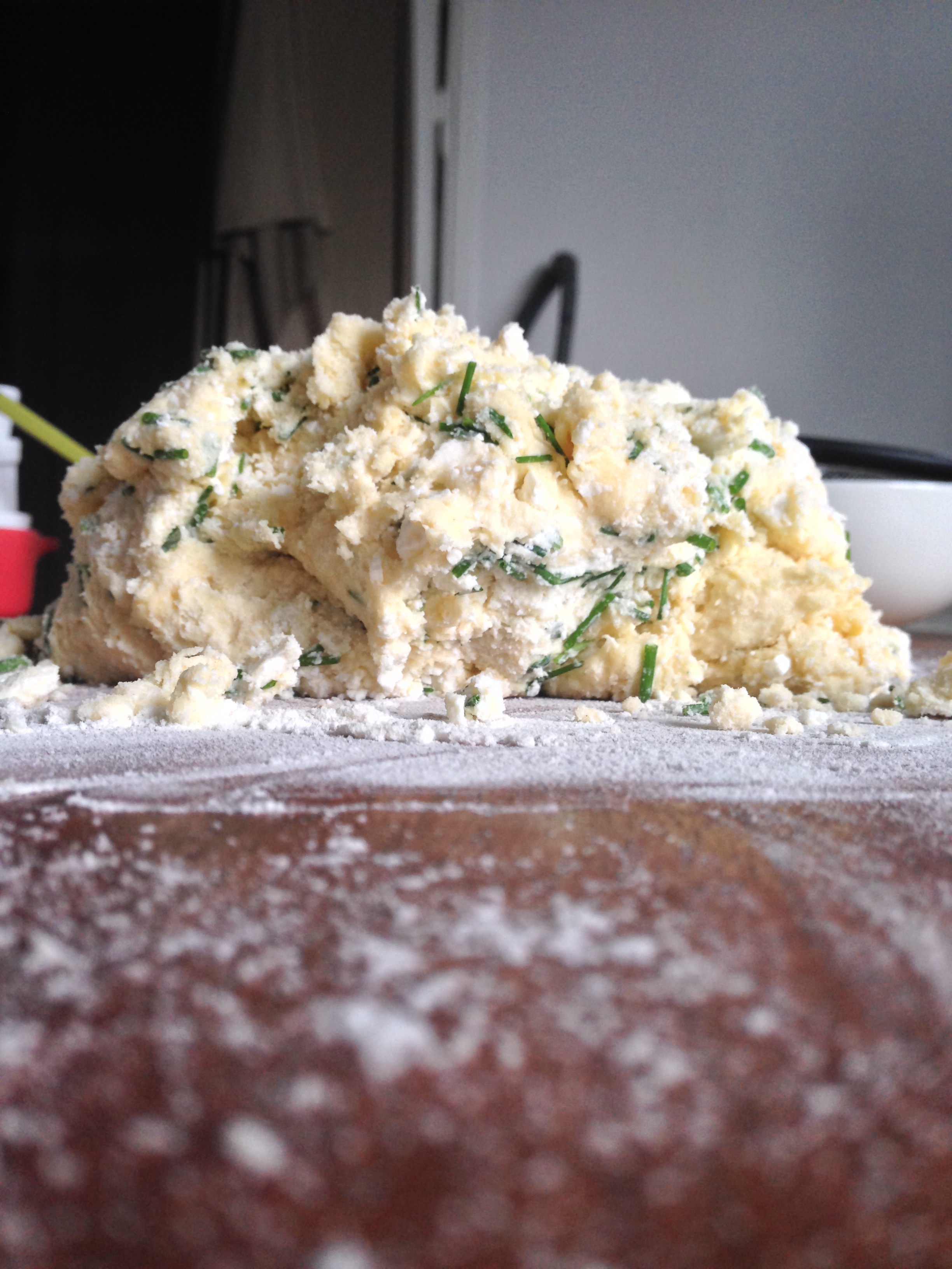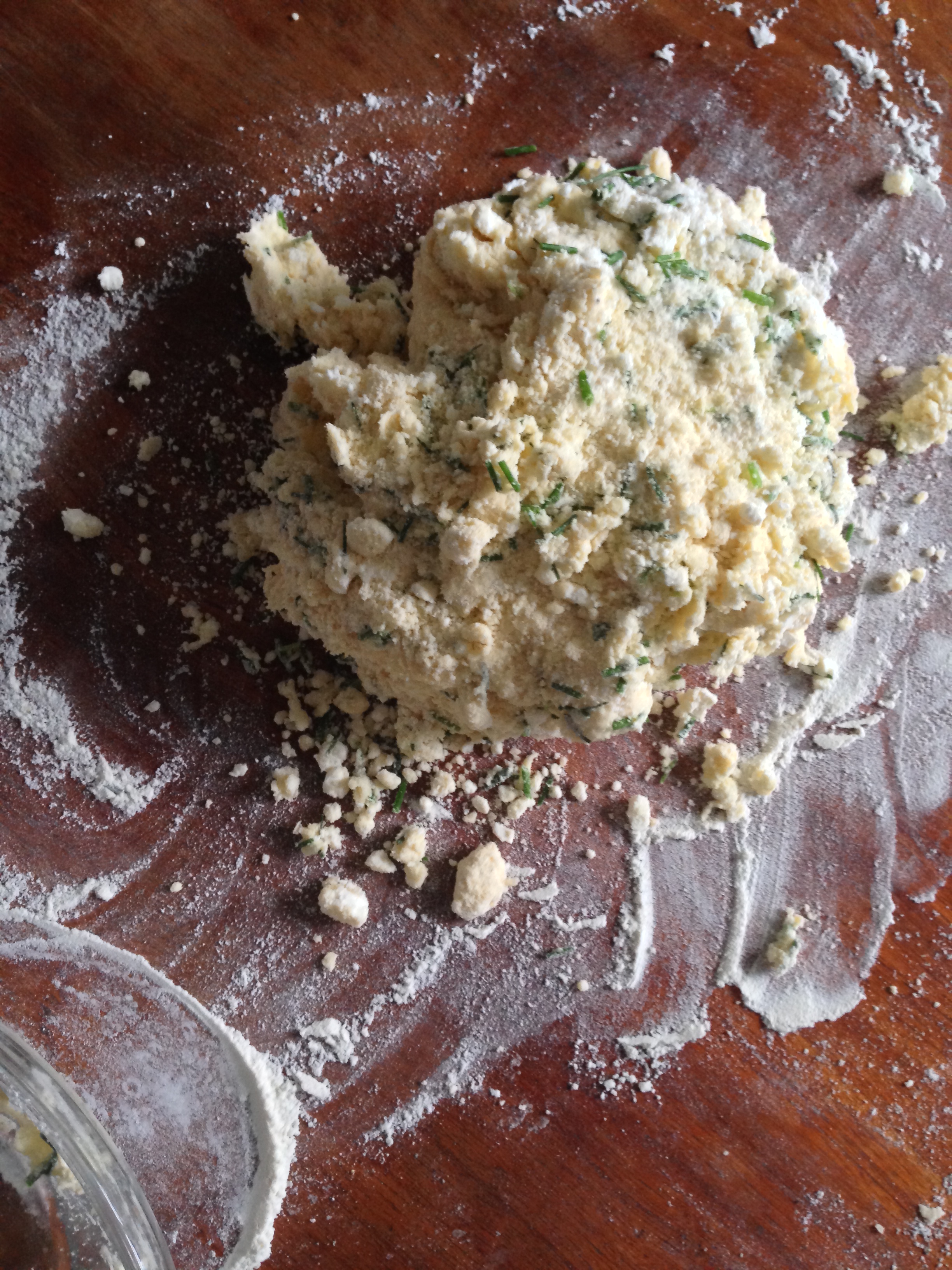 6. Flour your table or your counter a little. Pour the crumbly dough on the counter and start kneading. Having so much crumbles and chopped chives etc. you will not have (and you are not supposed to have) a very smooth dough.