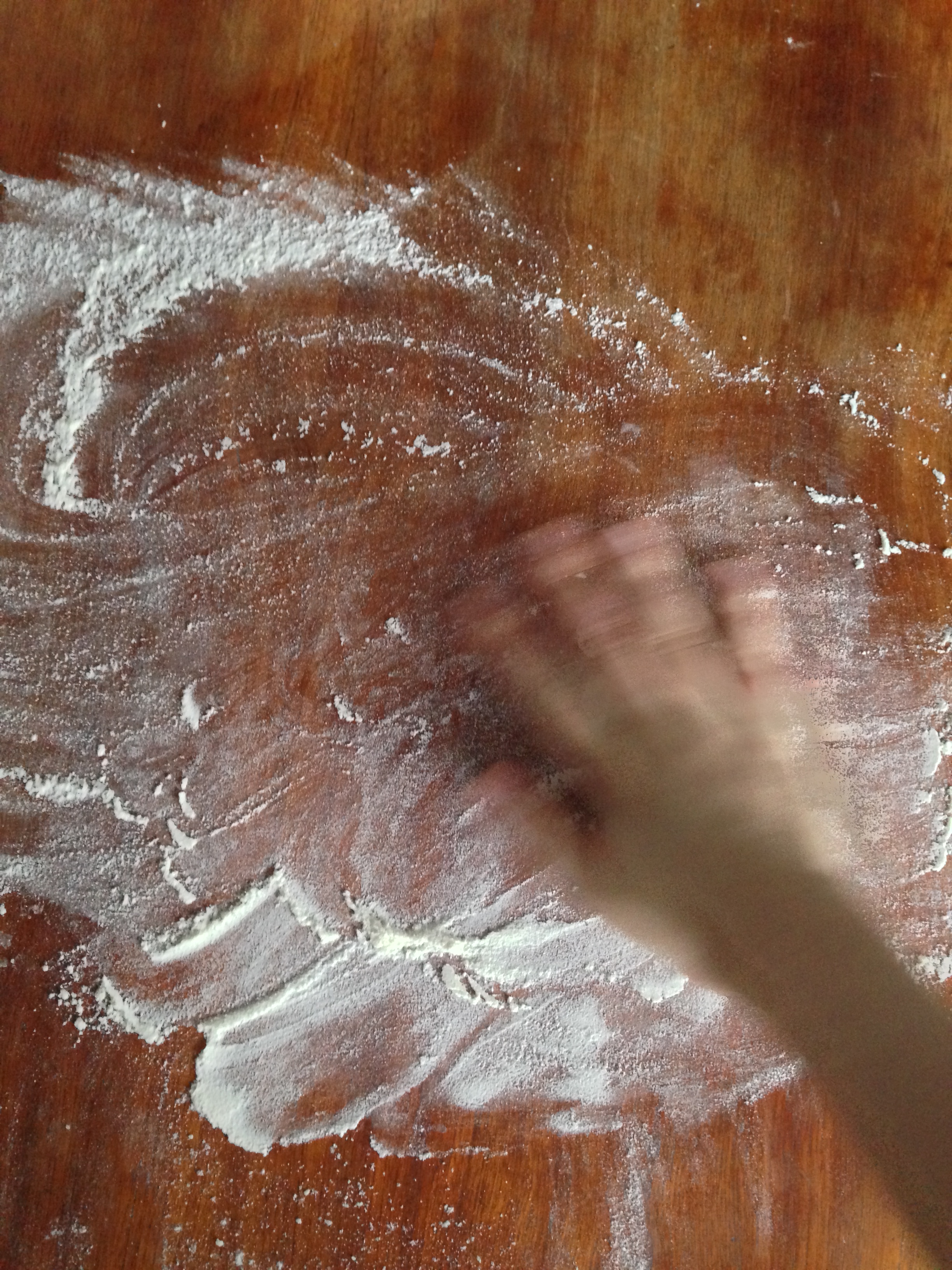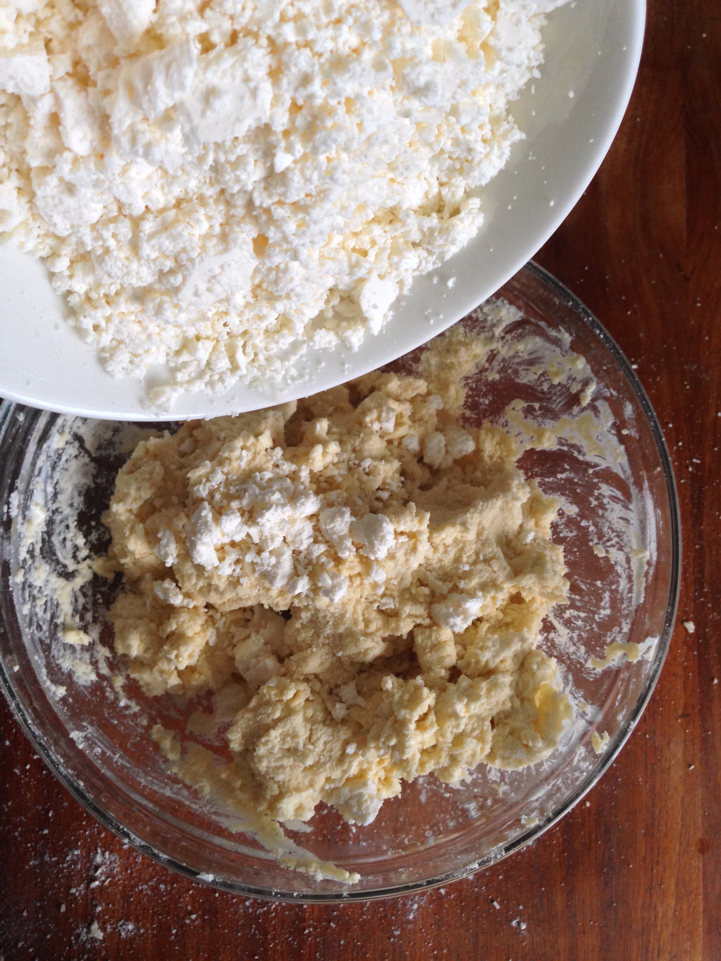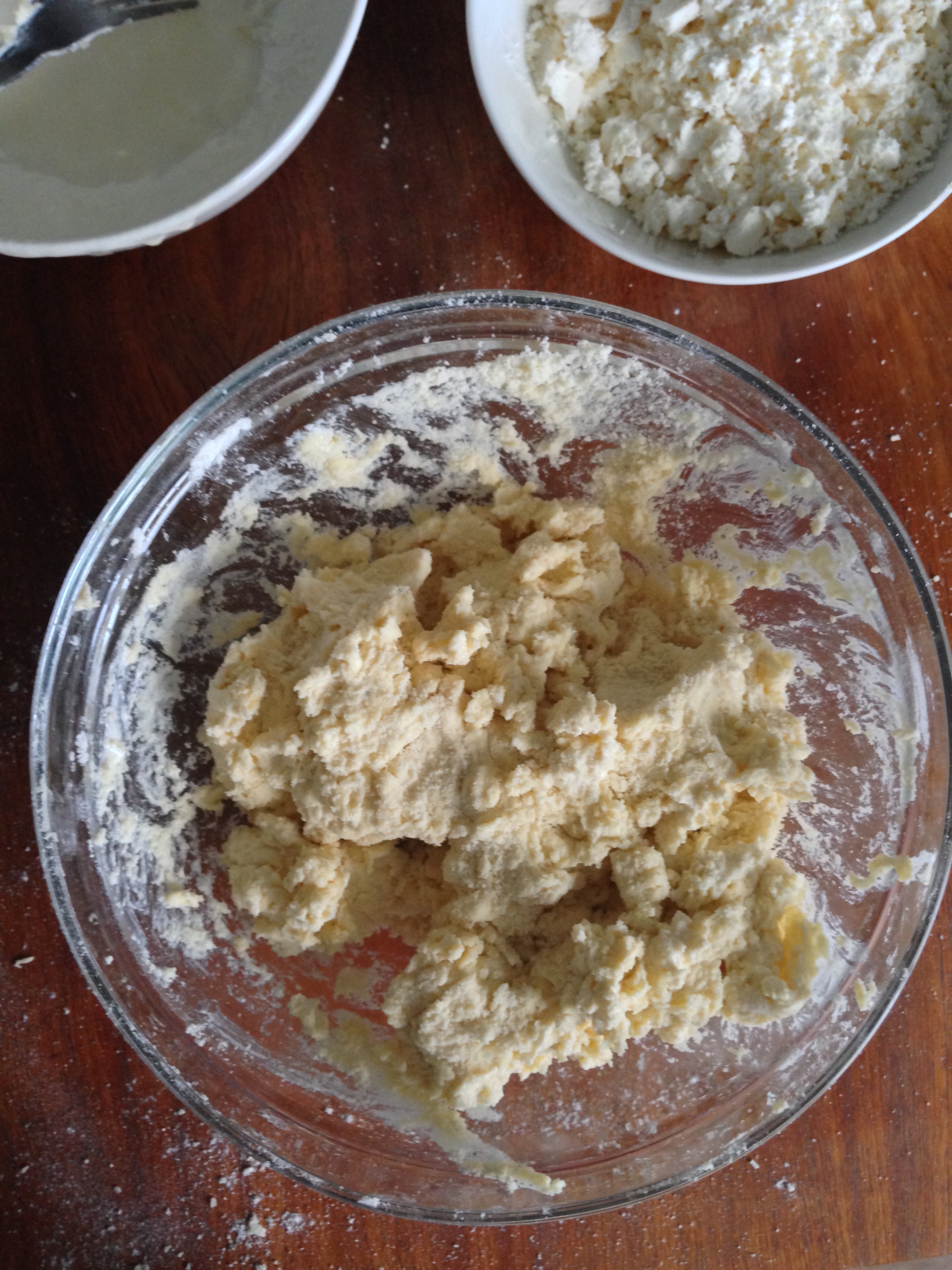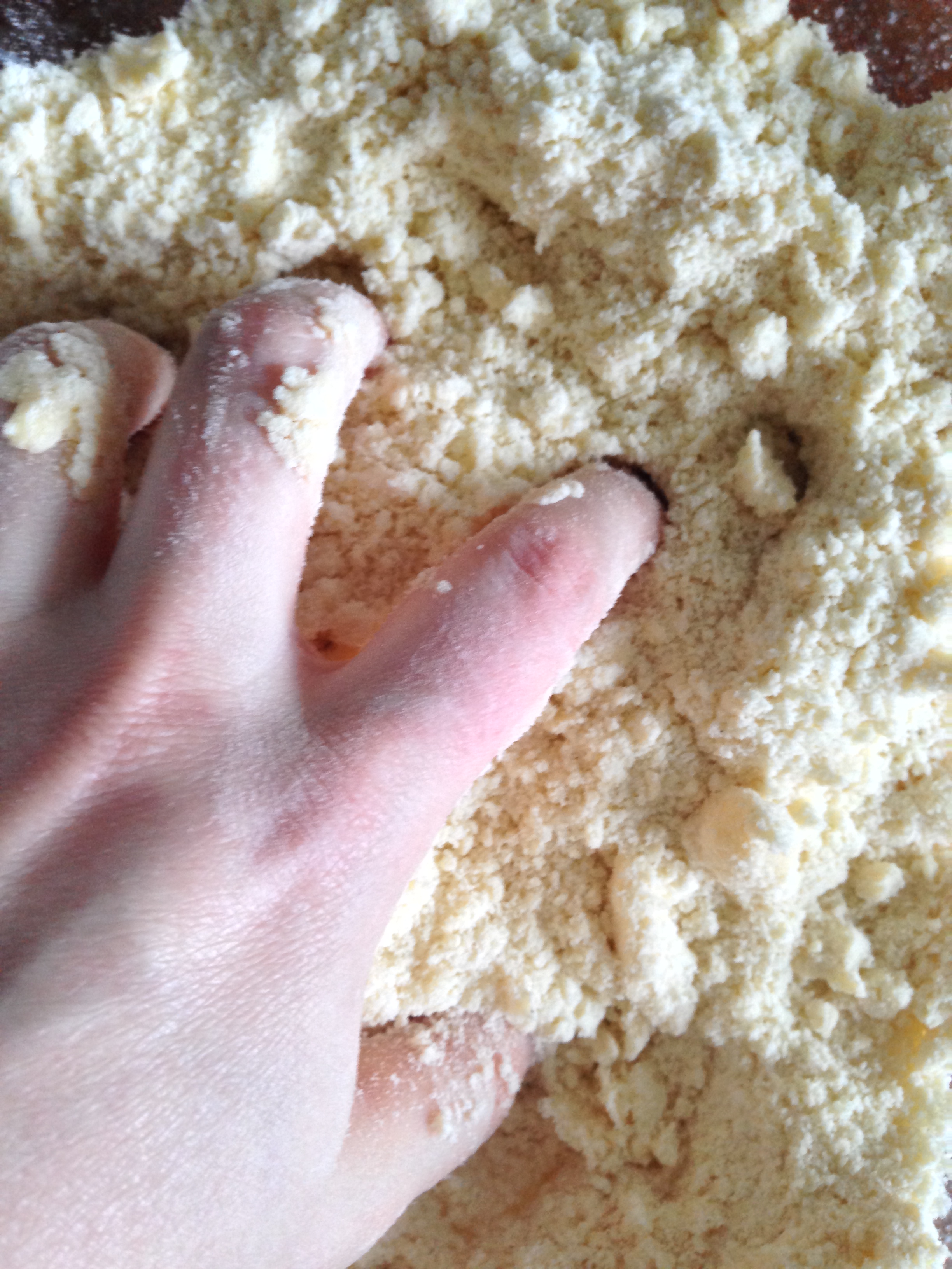 6. Flour your table or your counter a little. Pour the crumbly dough on the counter and start kneading. Having so much crumbles and chopped chives etc. you will not have (and you are not supposed to have) a very smooth dough.
