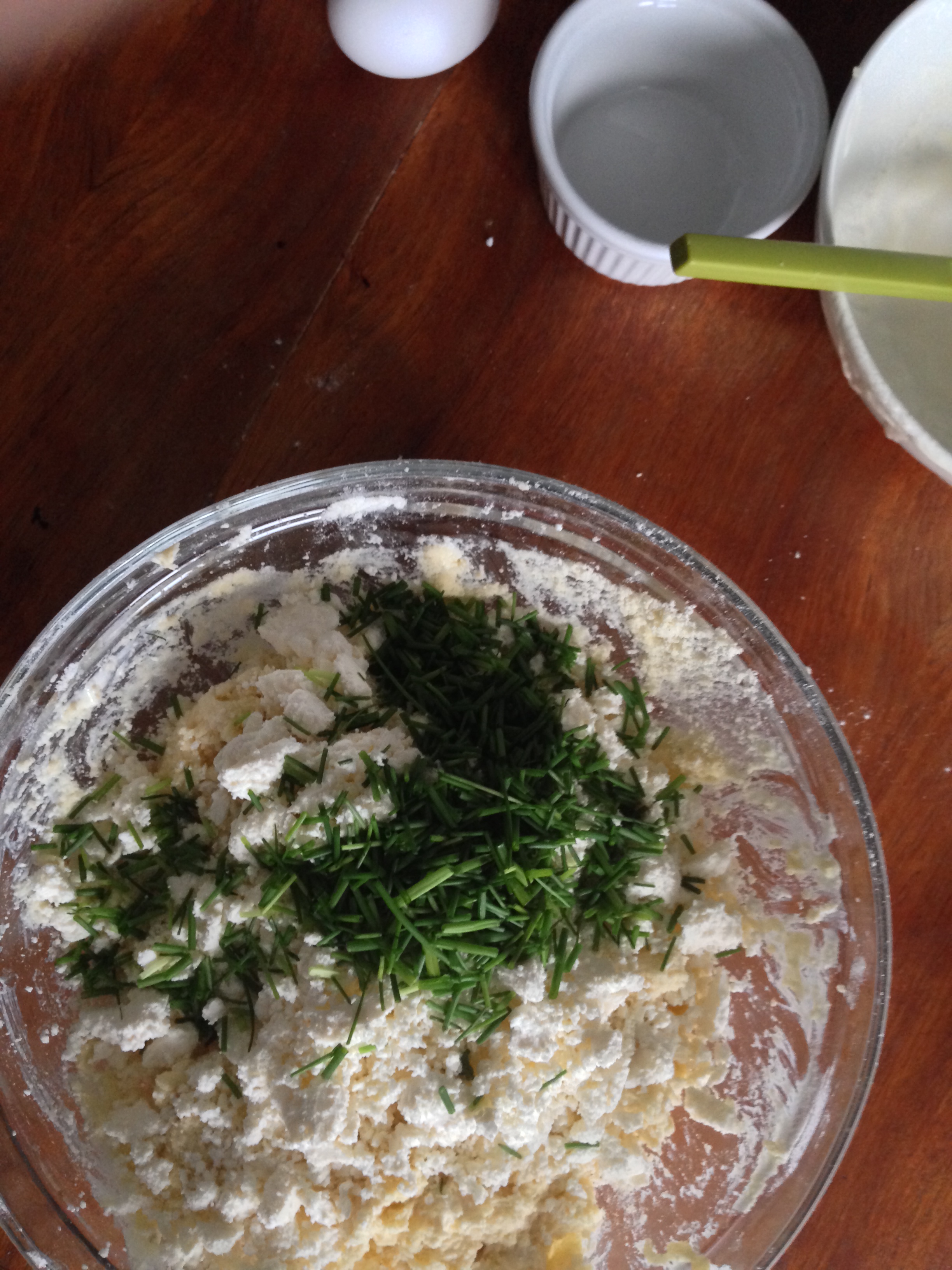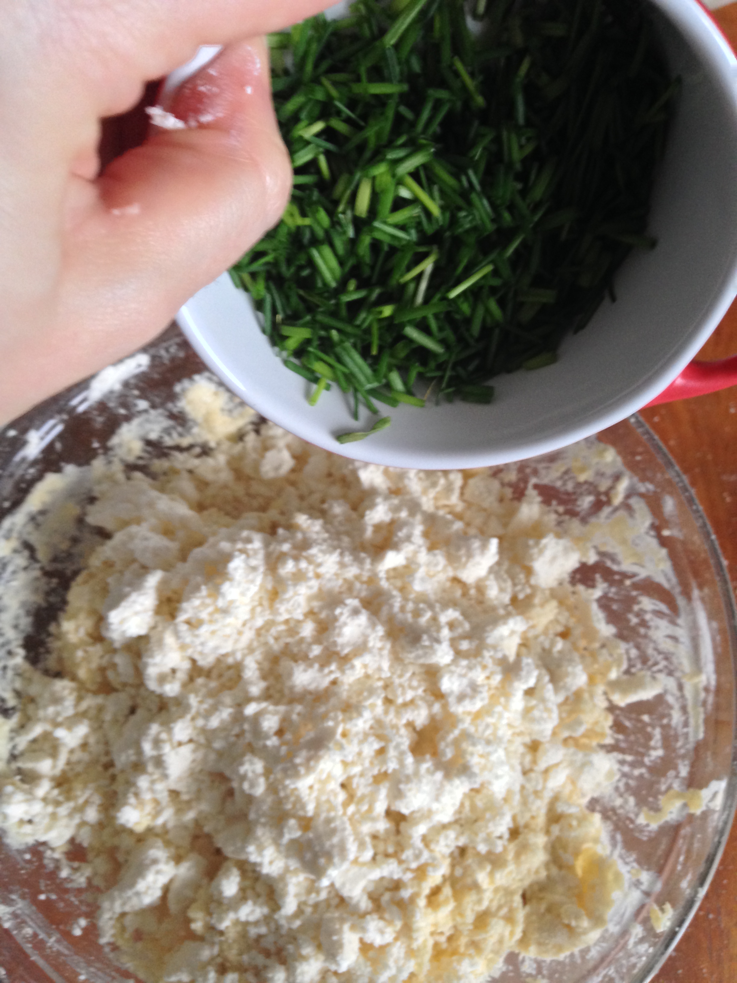 5. Add crumbled feta and chopped chives to the flour mixture and just mix 1-2 times to get them altogether.