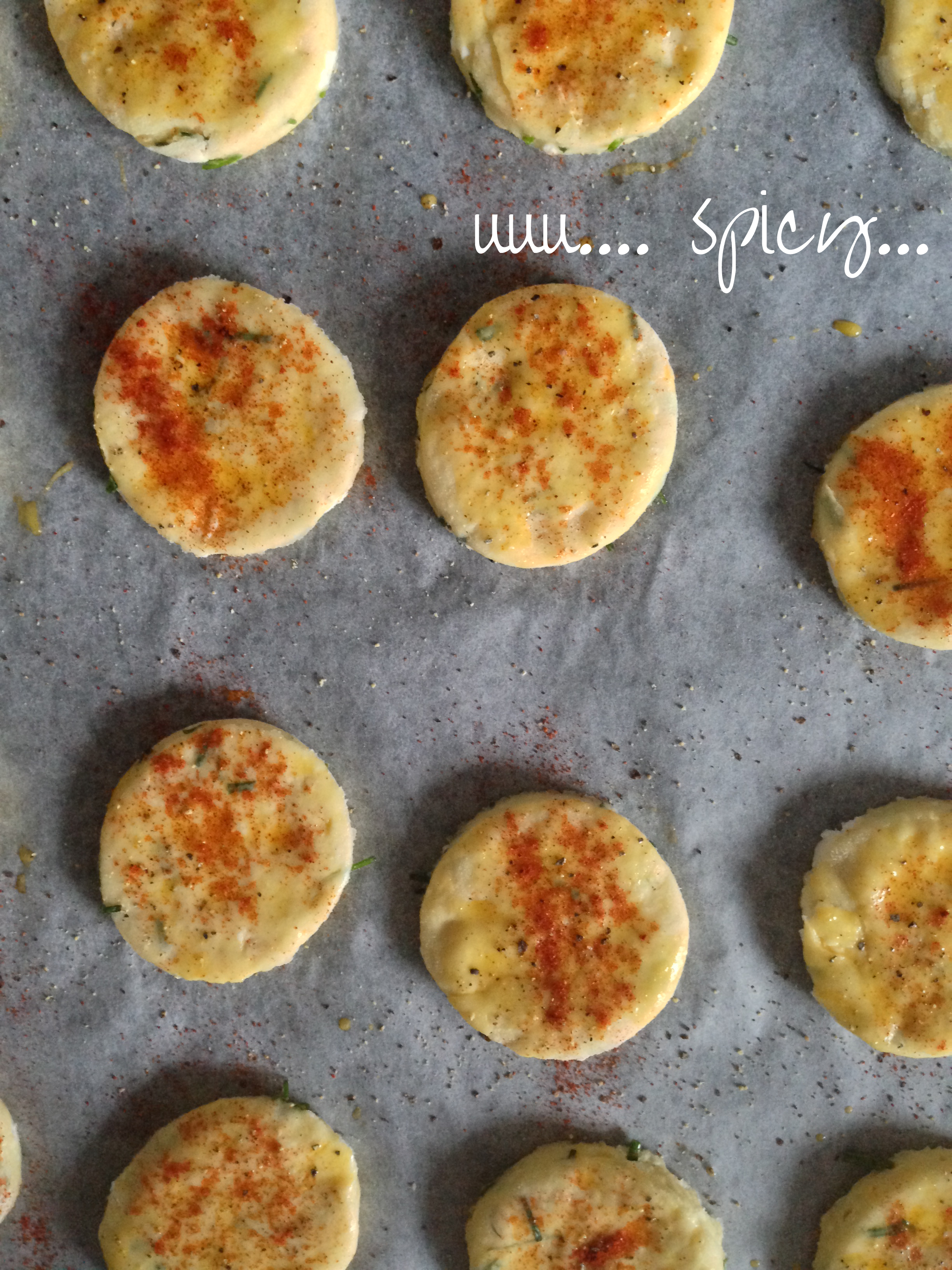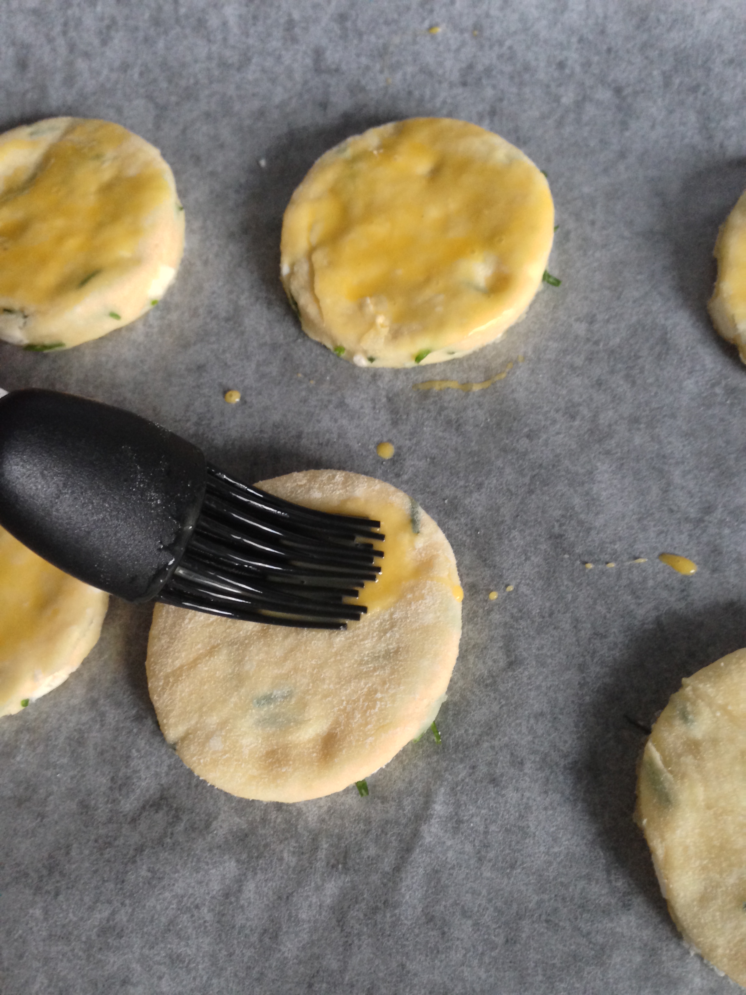 9. Beat 1 egg in a small bowl and take a brush. Brush the surfaces (and if you like, also edges) of the scones with egg. You can leave them like with only egg wash, or you can put some spices on, like black pepper and paprika (or any other spice you like).