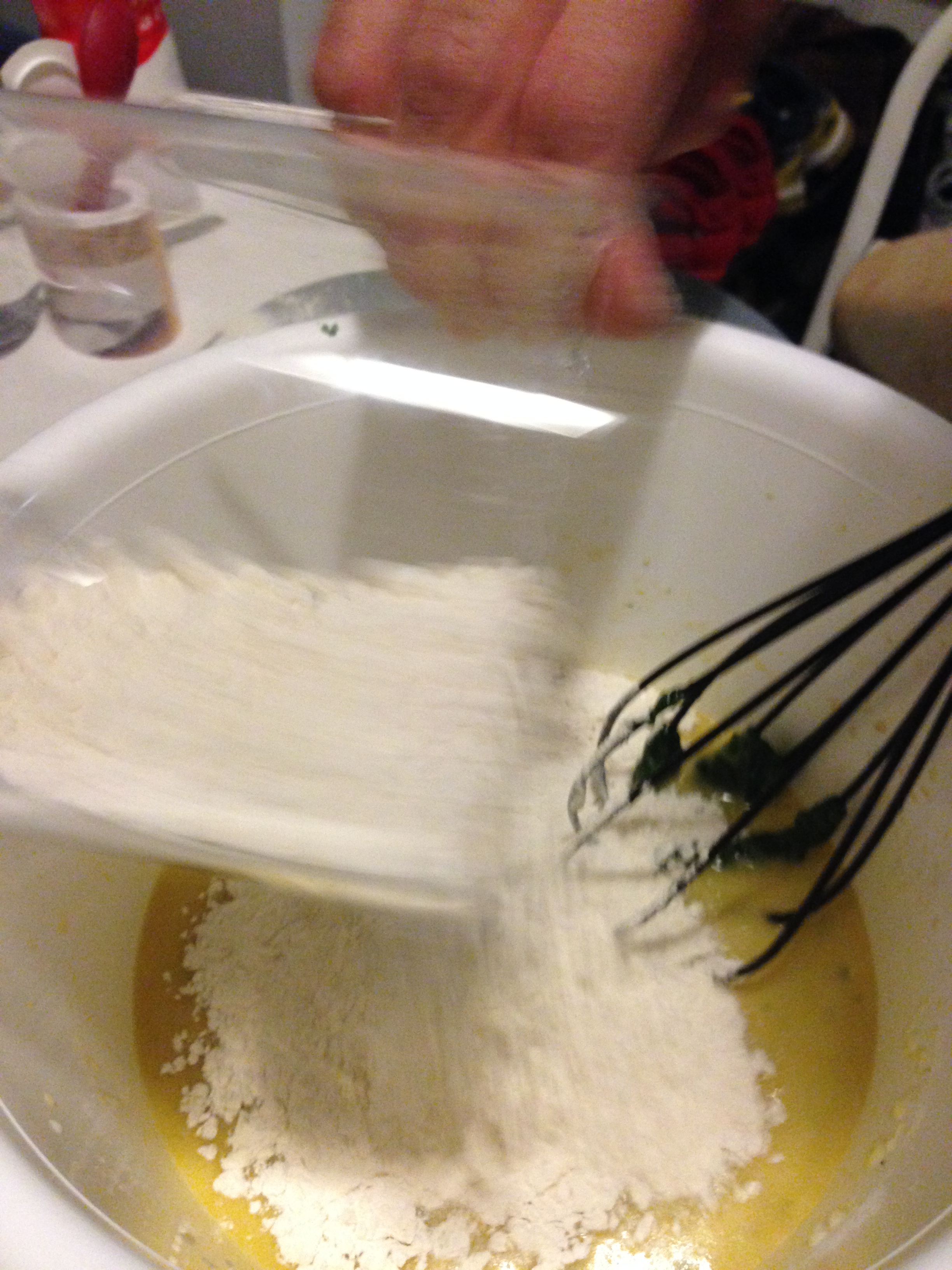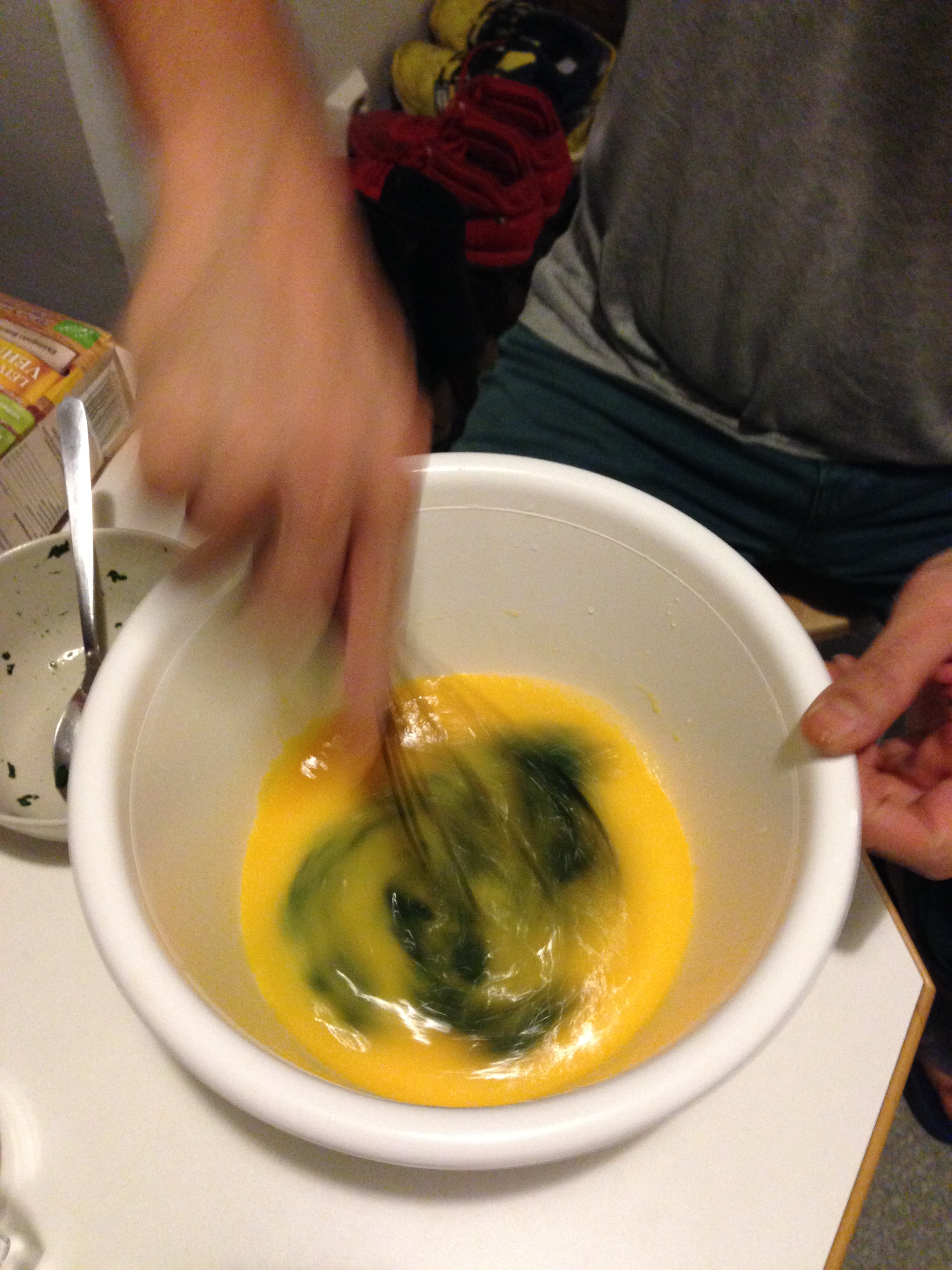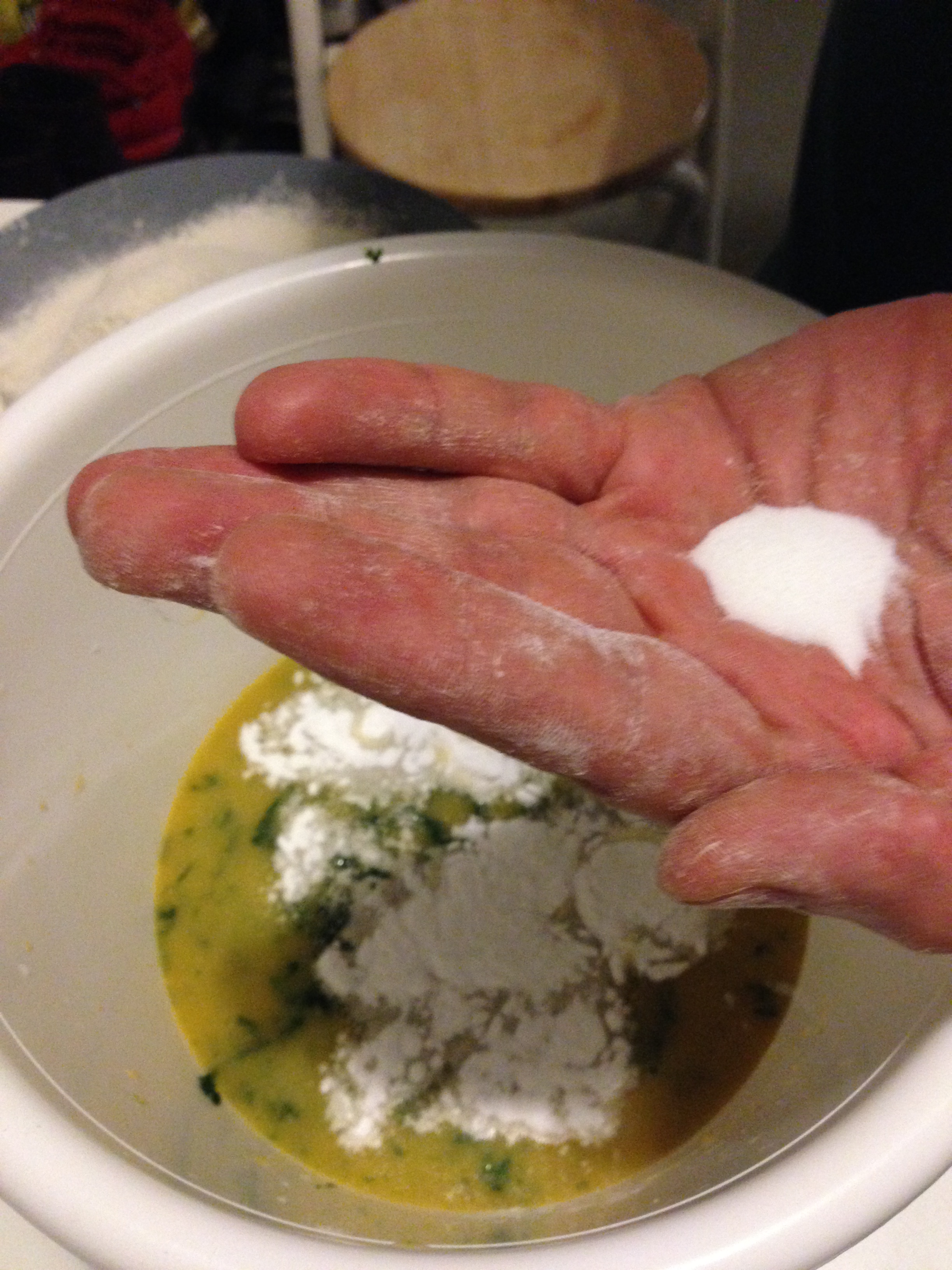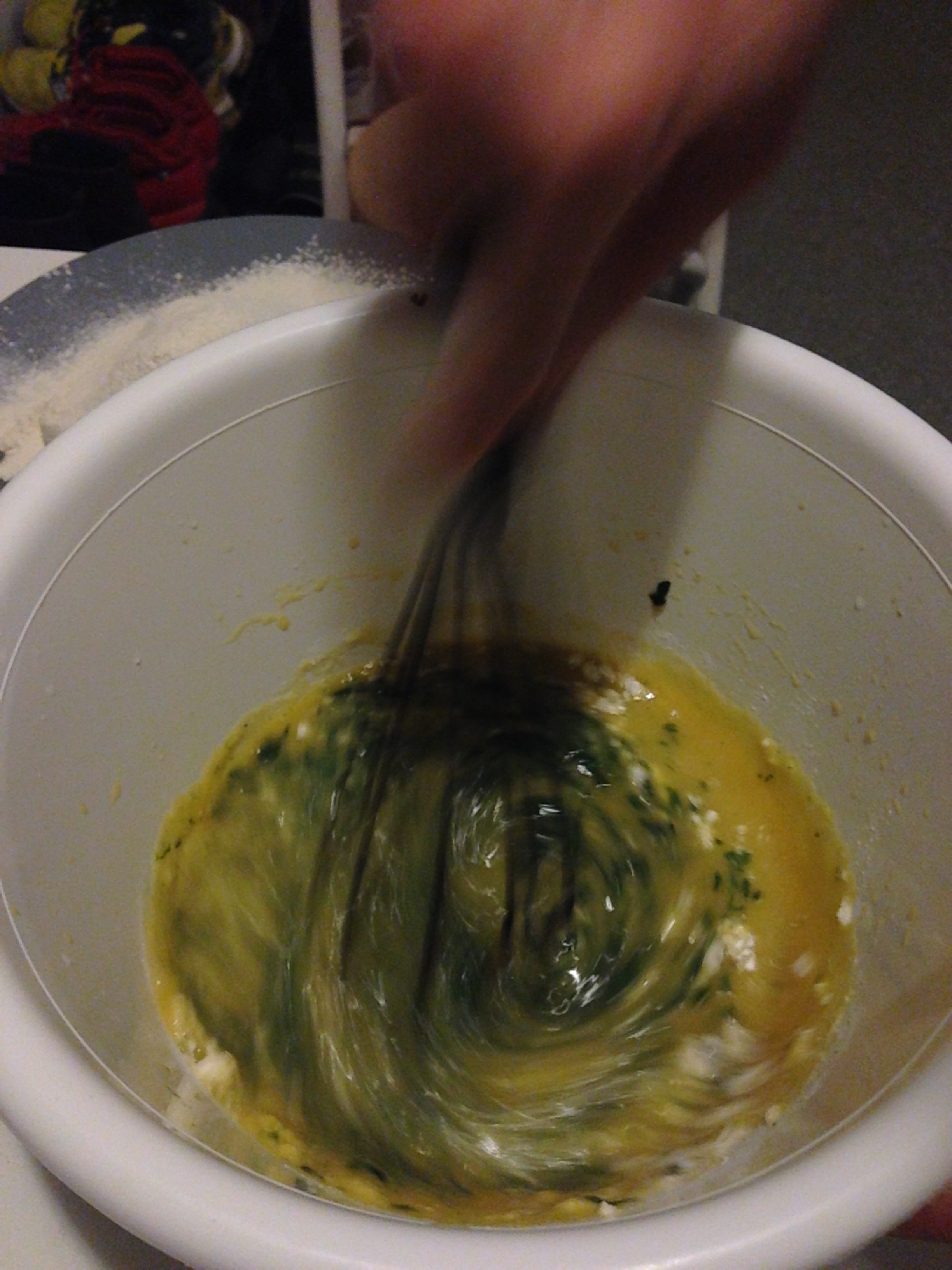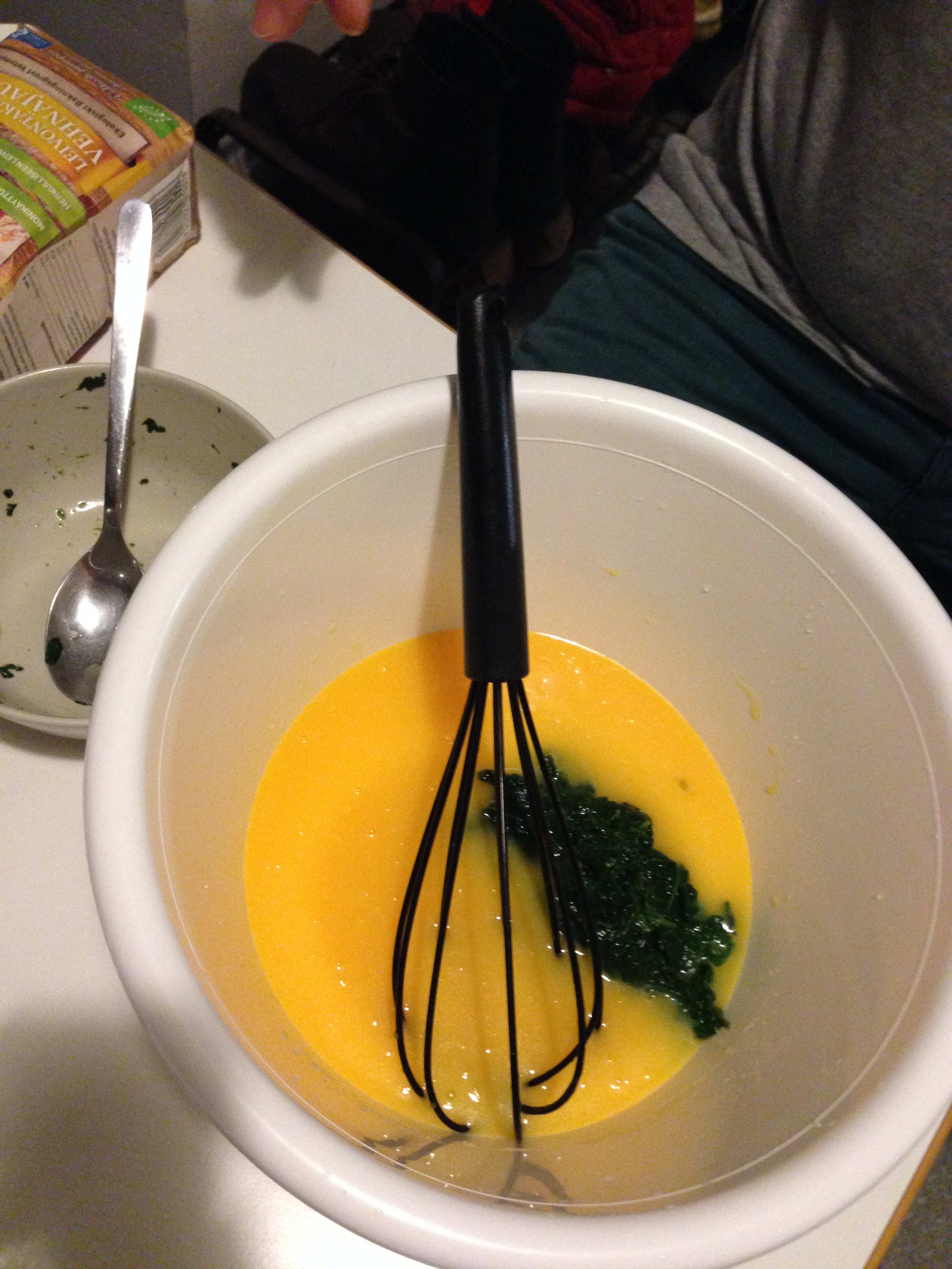 8. To the egg, butter and spinach mixture, add baking powder and salt and whisk again.