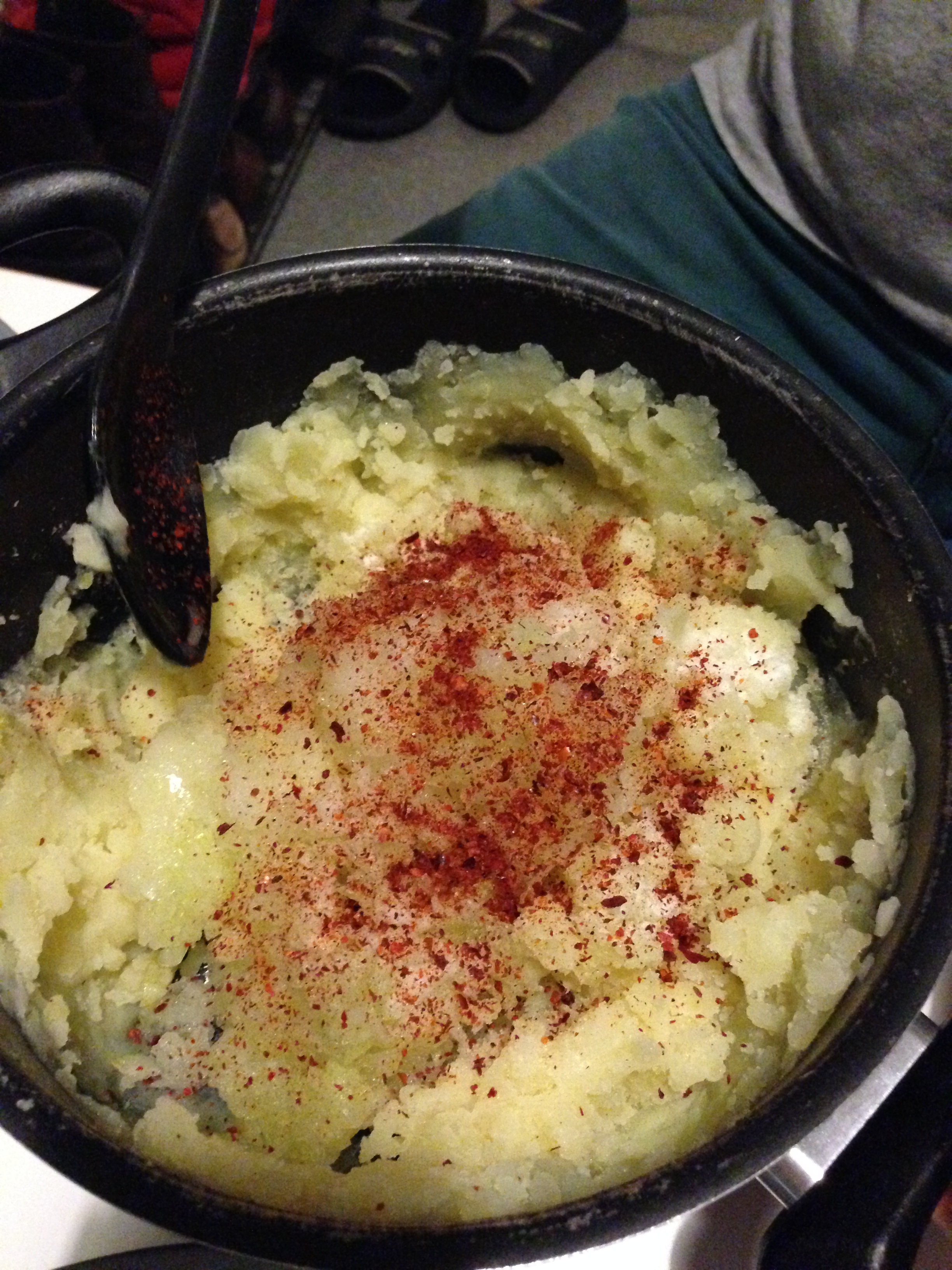 10. In the meantime, prepare the filling. Puree the boiled potatoes again using any tool you have. Add onion and aleppo pepper and stir until they are well combined.