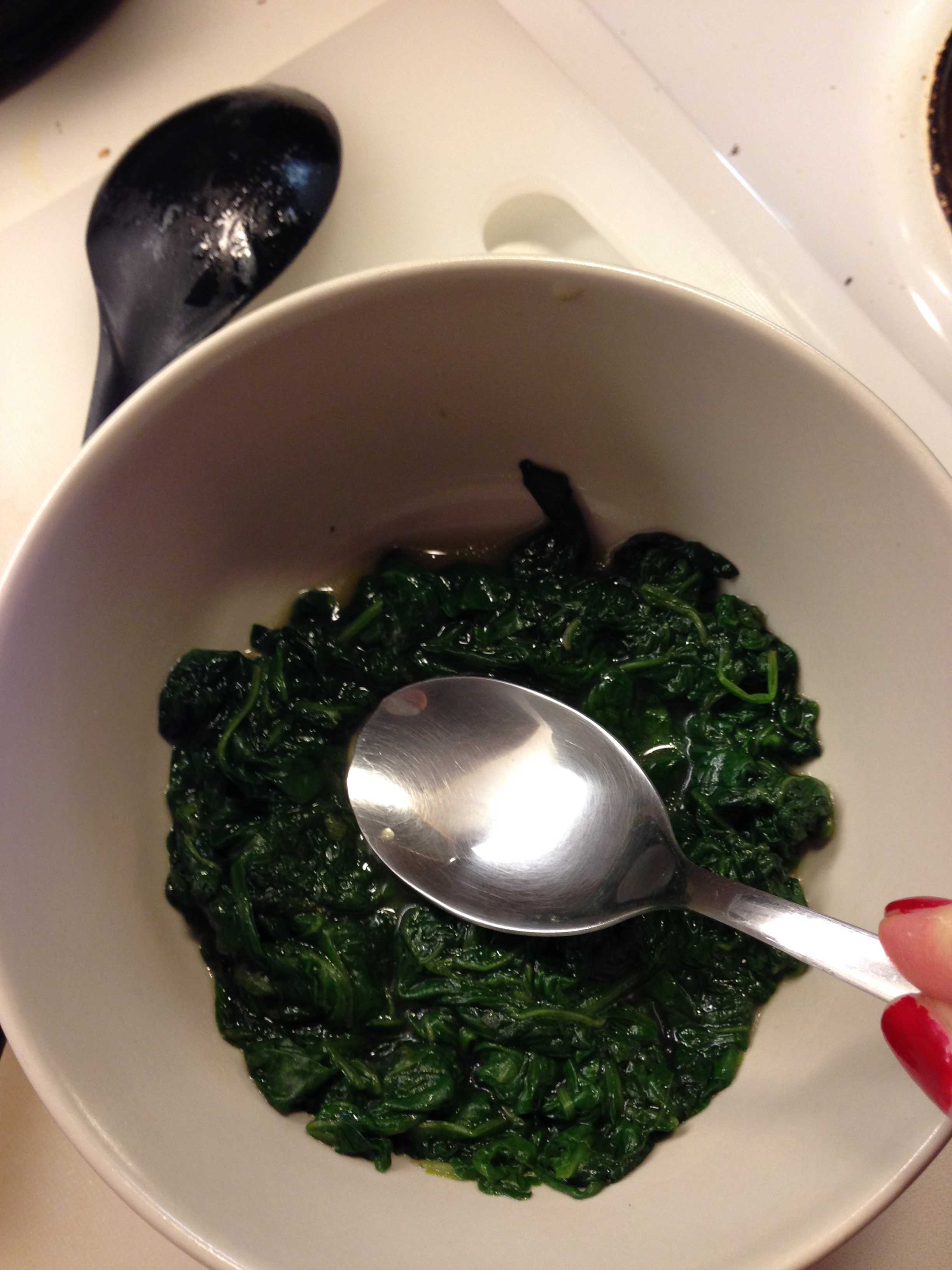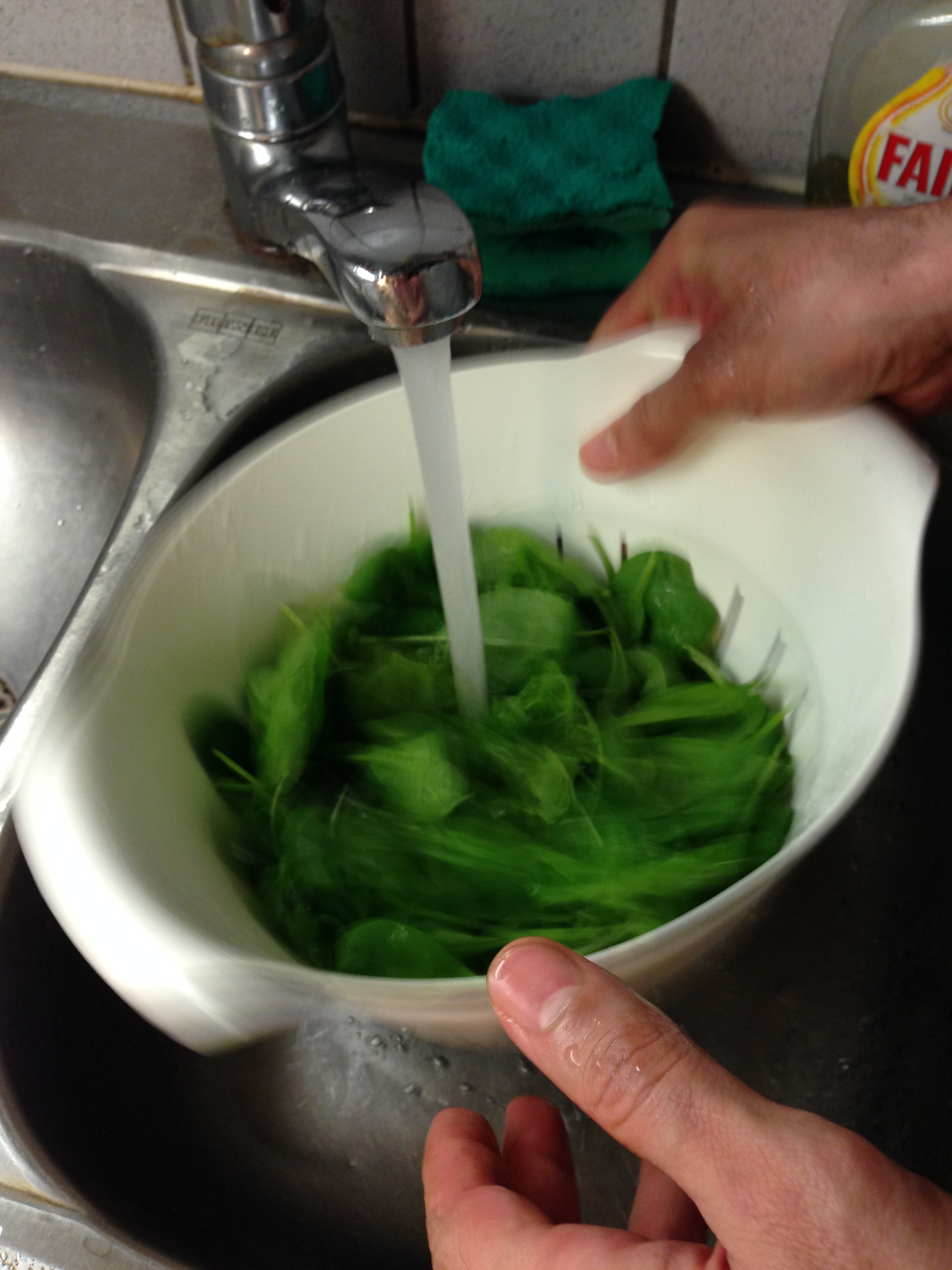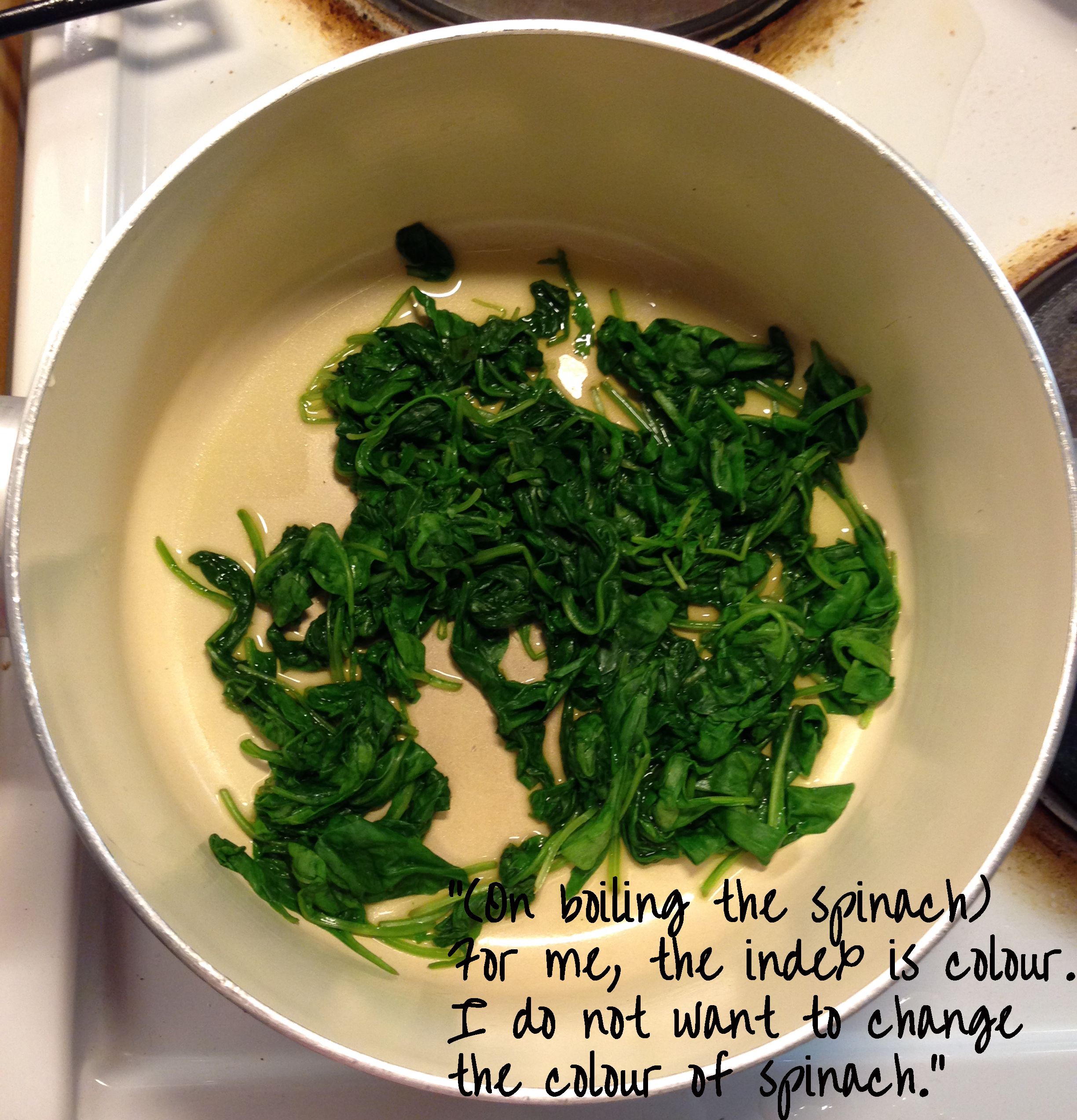 1. Wash spinach. Take out the stem of spinach and put it in a pan with some water (enough to cover the spinach). Boil it for 20 minutes, until it is cooked but not yet lost the bright green colour. Put them in a bowl and puree by using any tool you have – we made it with a spoon for instance.