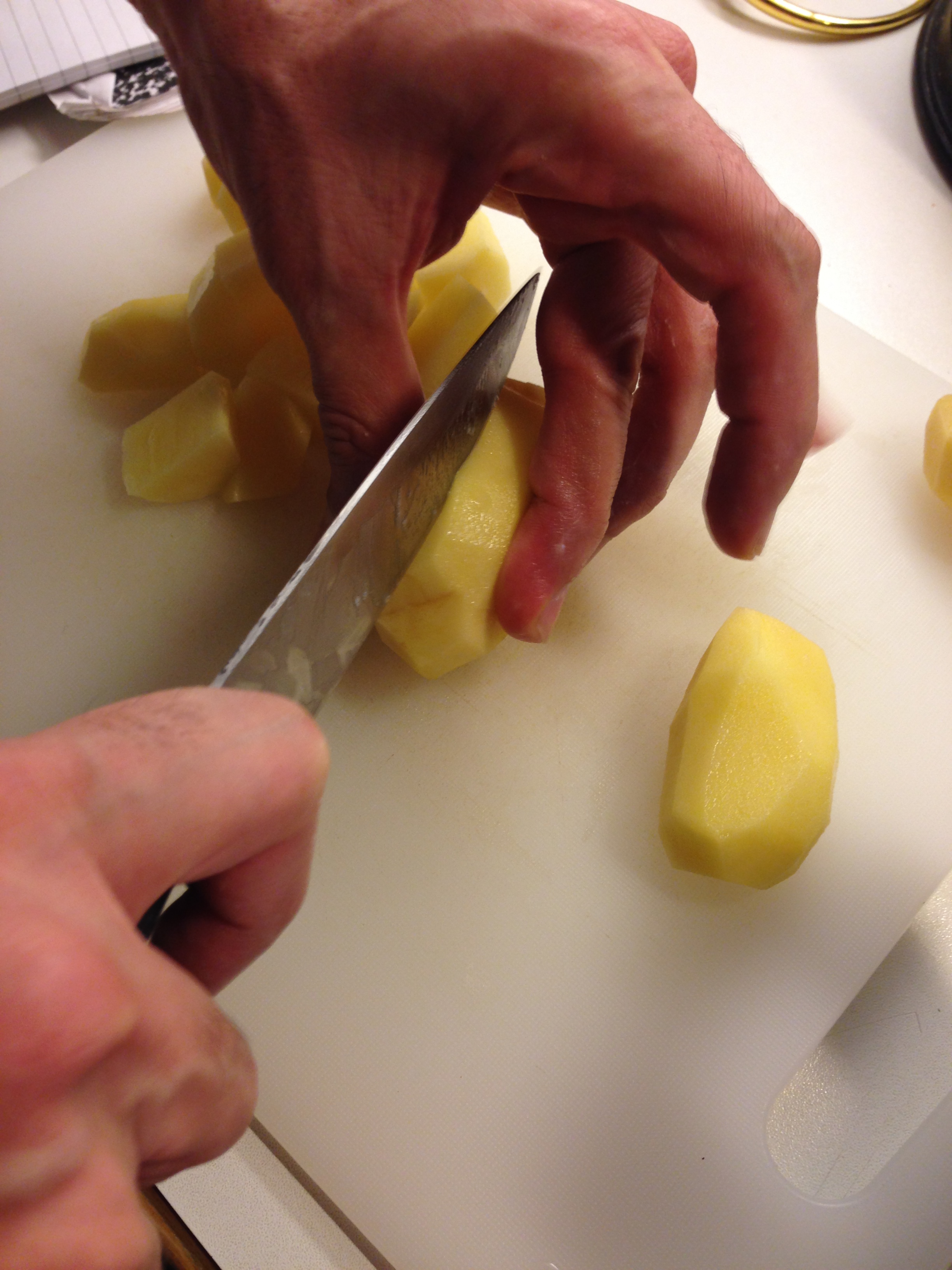 2. Wash potatoes and peel them. Chop them into smaller pieces, put in a pan and cover with water. Boil until well cooked. Take out of the water once they are boiled.