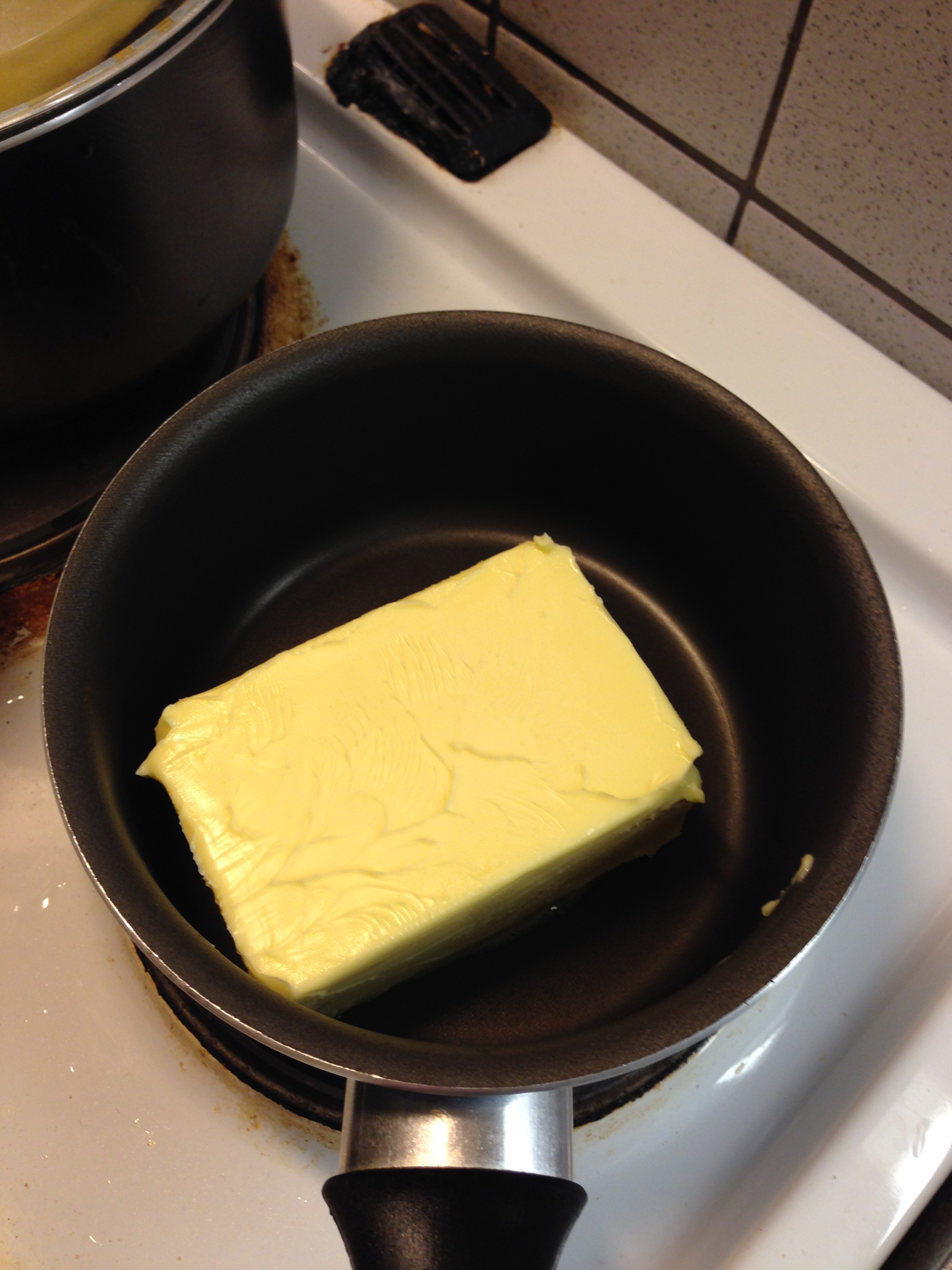 5. Crack the eggs in a bowl, add melted butter and whisk.