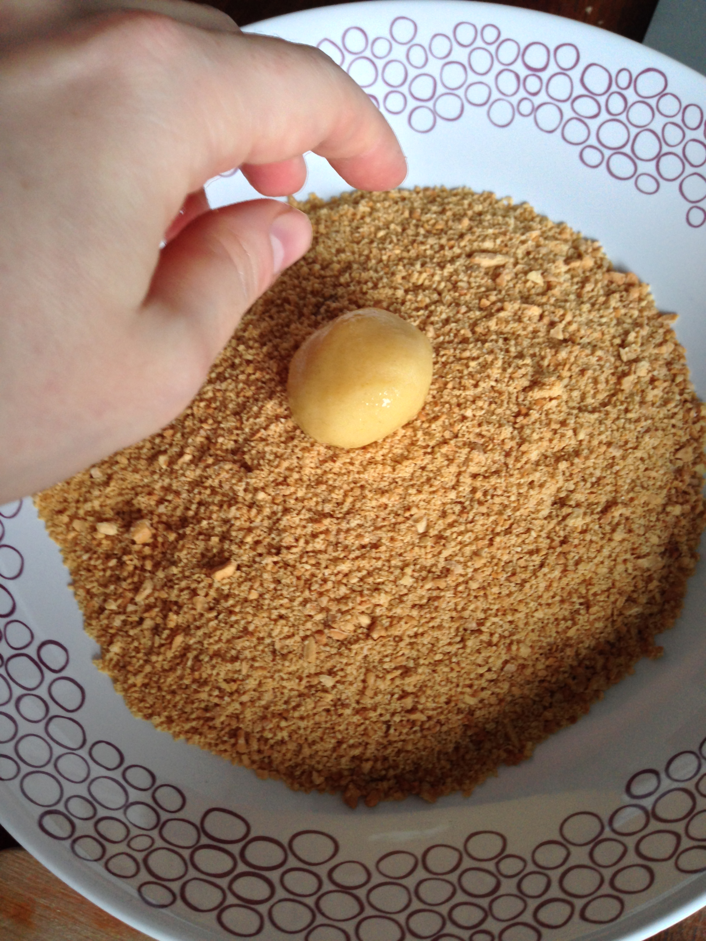 8. When the dough is ready to make balls take it out of the fridge. Put the egg white on a plate, the crushed almonds on another plate. Try to use plates that I used in the pictures, having them quite flat makes it easy to roll but since the sides are still a bit deep it does not get messy all around.
