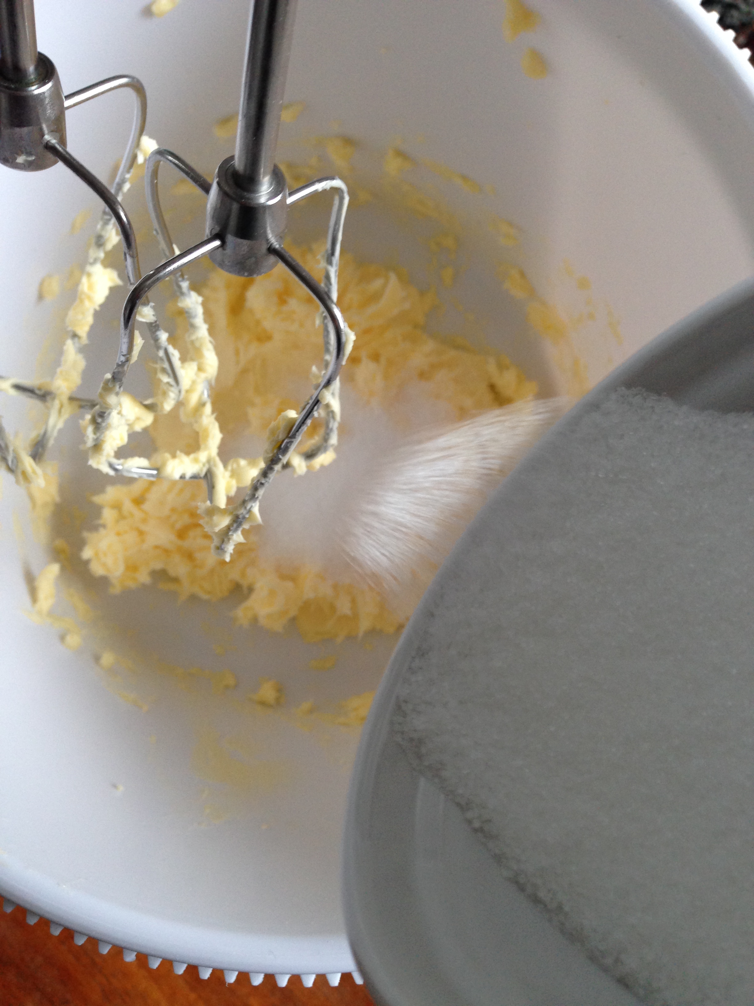 4. Add sugar and continue mixing until the mixture gets fluffy (for 5 minutes, in medium speed).