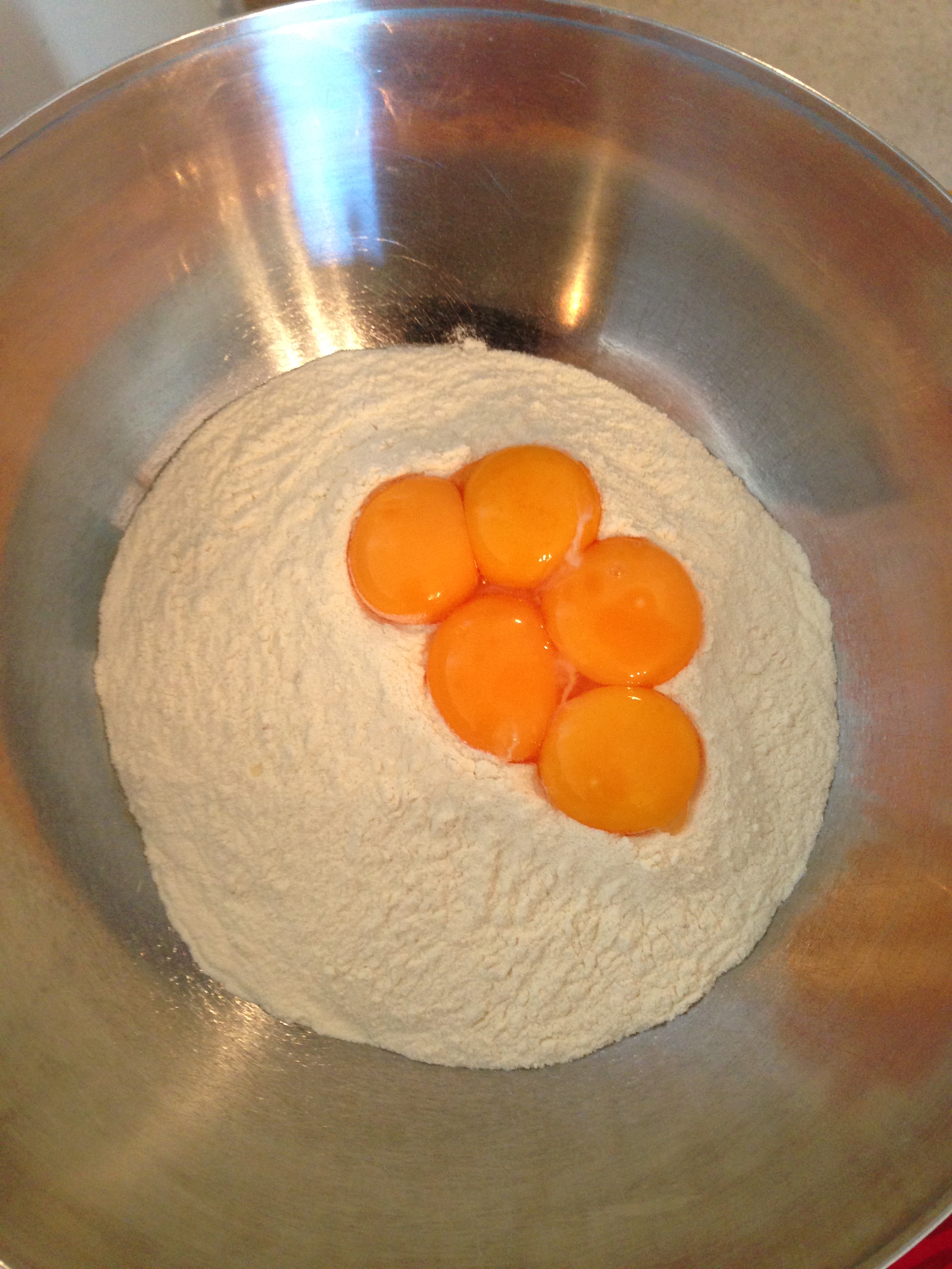 3. In a big bowl, put first the flour, then egg yolks. Crumble yeast on top of this.