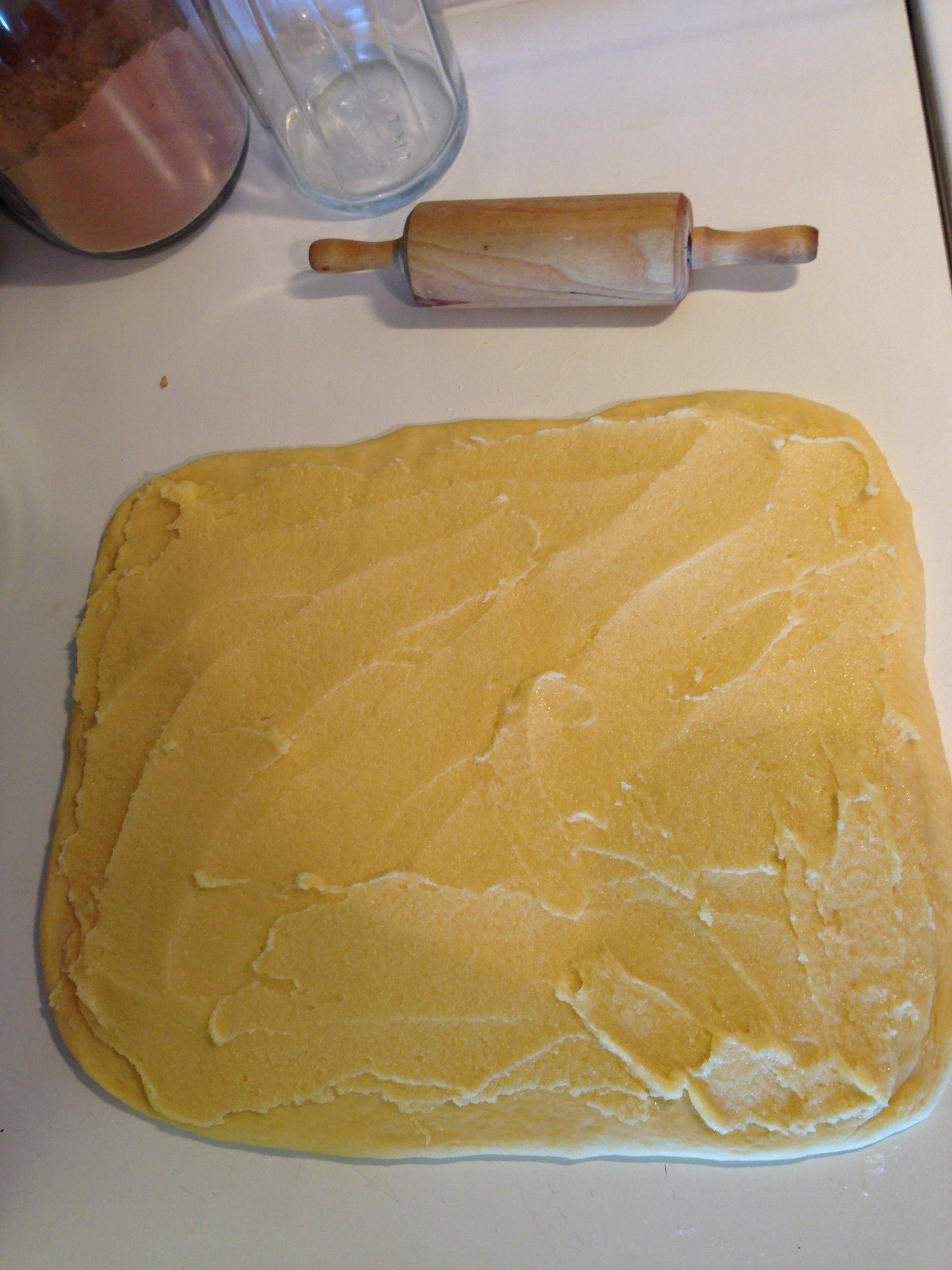 8. Take the filling and put it on the rolled dough. Spread it on the dough as evenly as possible. Cover all the surface, do not leave any space in the edges etc.