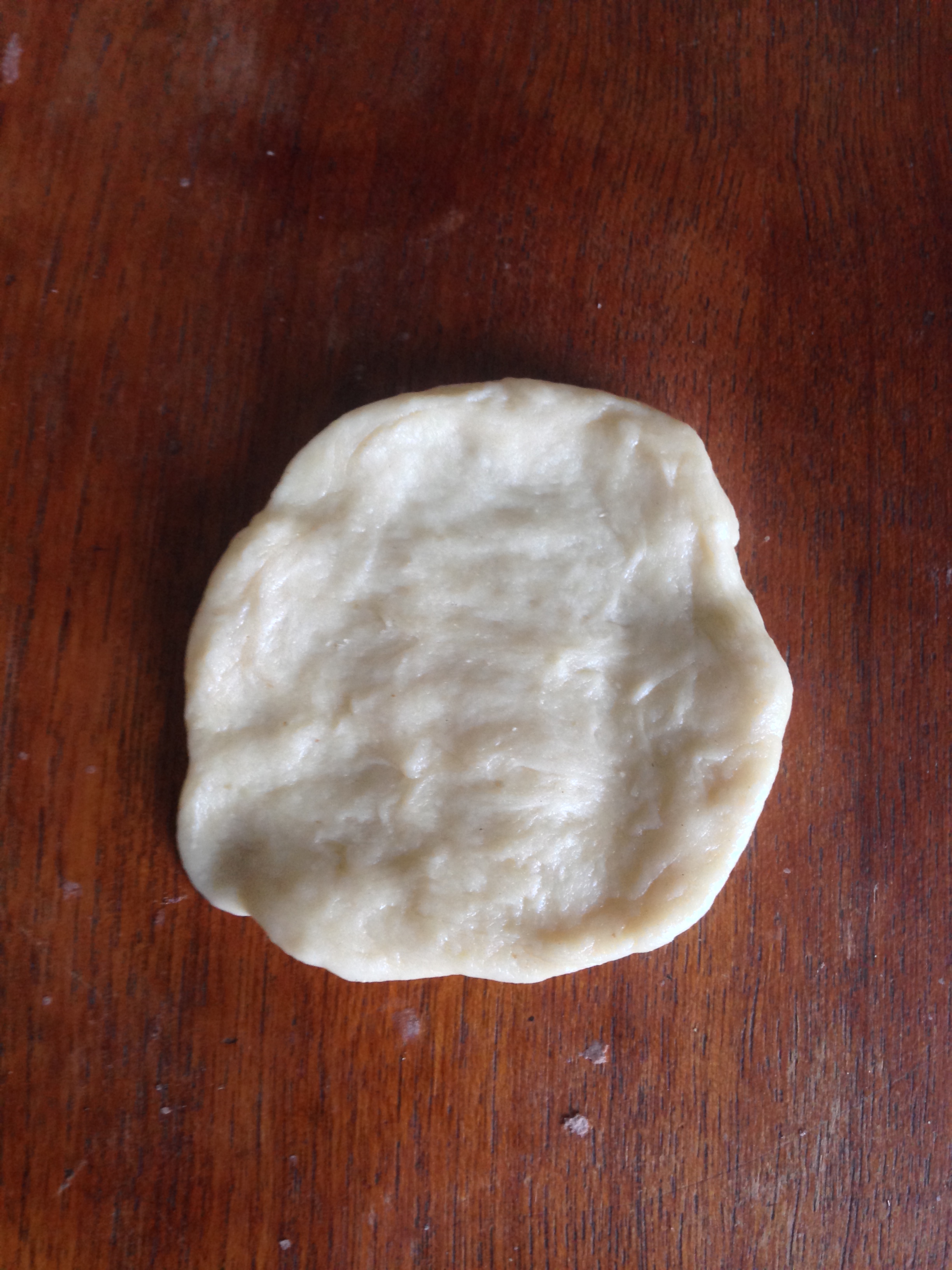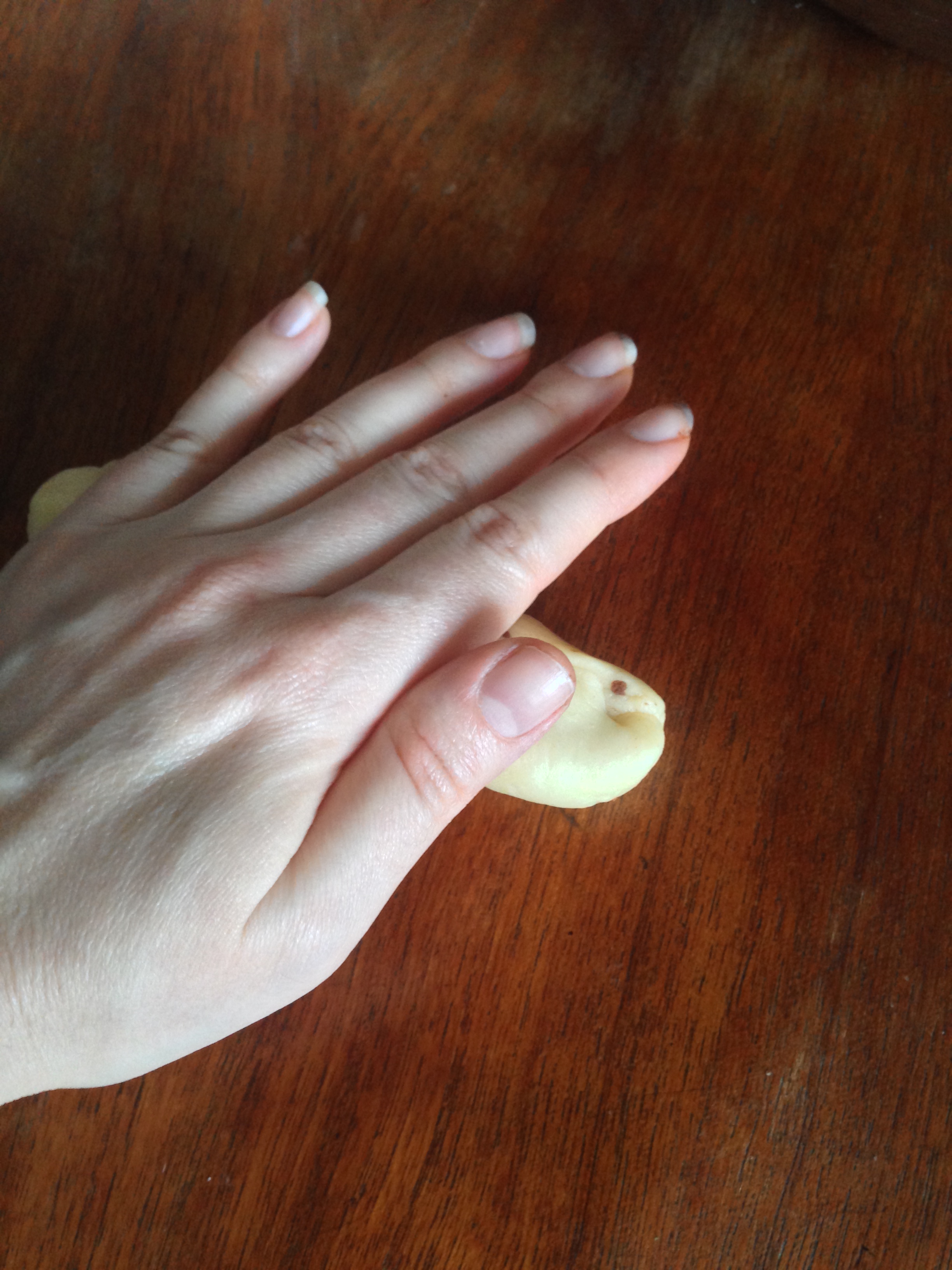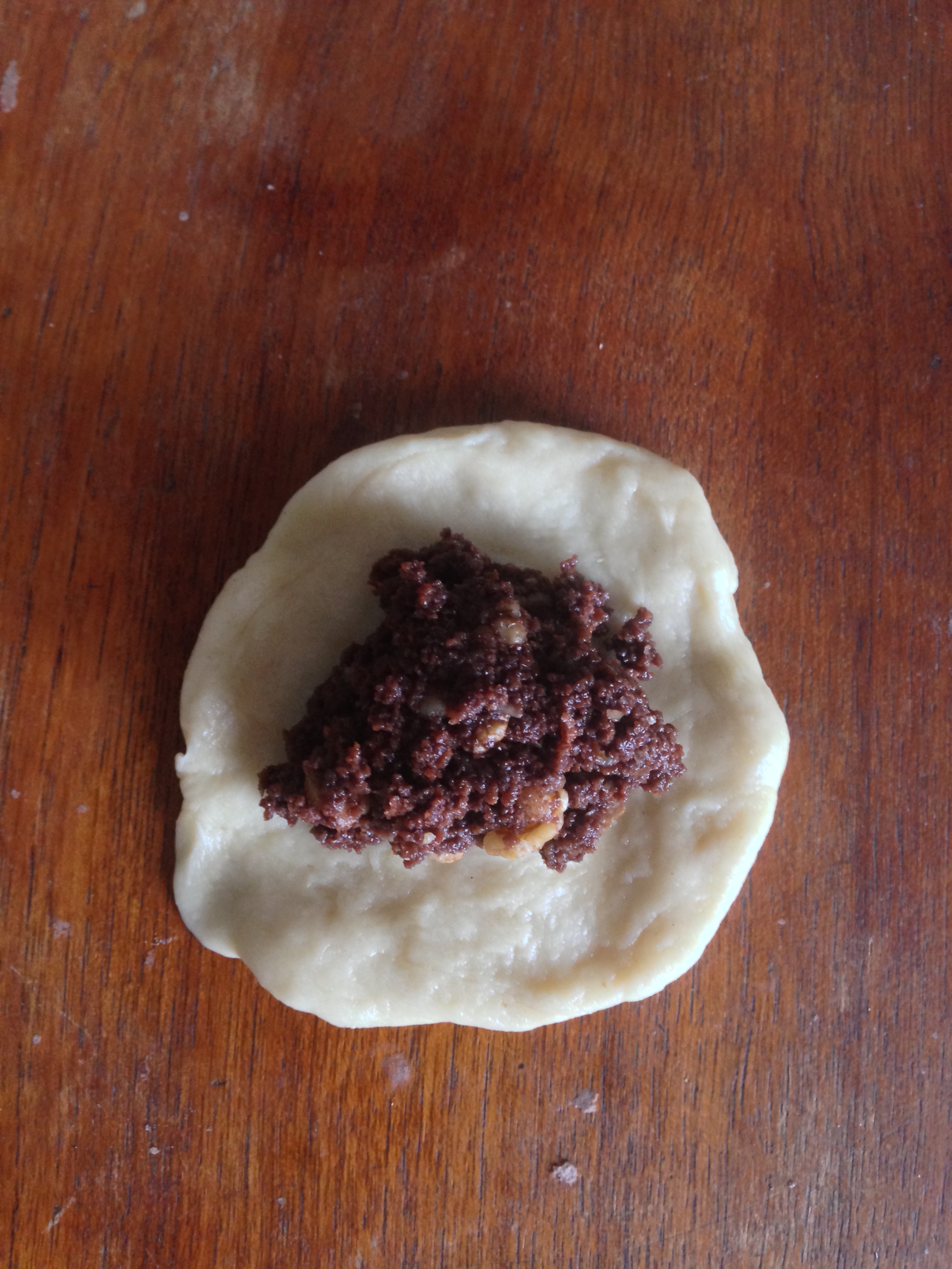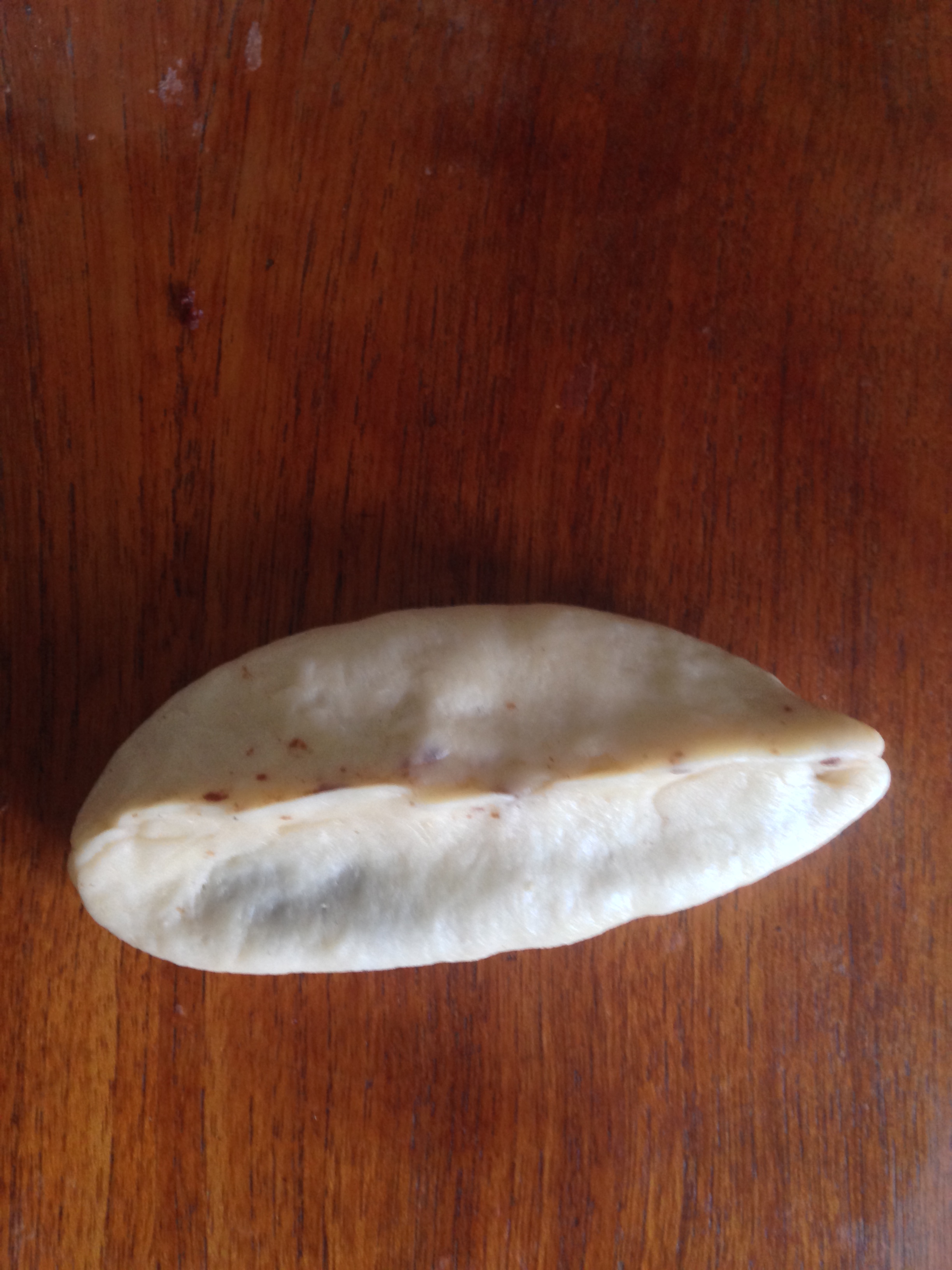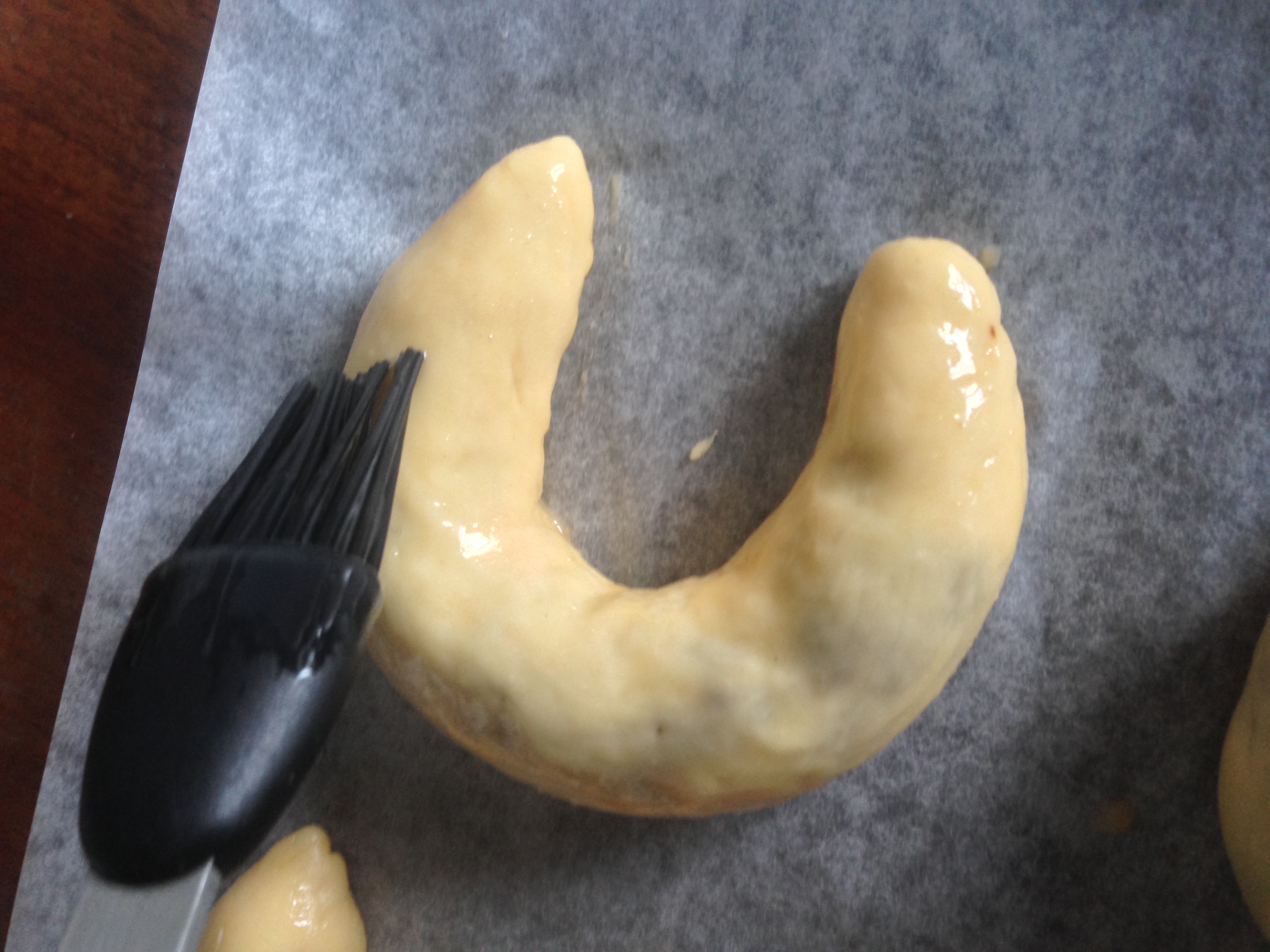 10. When the dough is ready, take a piece a little bit bigger than a walnut in size. By just using your hands, flatten the piece and make a rough circle about 10 cm in diameter (you can of course roll it with a rolling pin if you do not want to do it with hands). Put a table spoon of filling in the middle and seal it as shown in the third and fourth photos below. Roll the piece into a little tube, about 1 cm thick – try not to get any filling pop out but if it does, just collect the pieces, seal the opening and continue – it does not matter so much after all once you bake it.. Turn the tube into a crescent shape – or any other shape you like. Now remember, the dough will rise a lot once you bake, so try to make really thin tubes not to end up with too fat crescents! Put each piece about 2 cm away from each other.