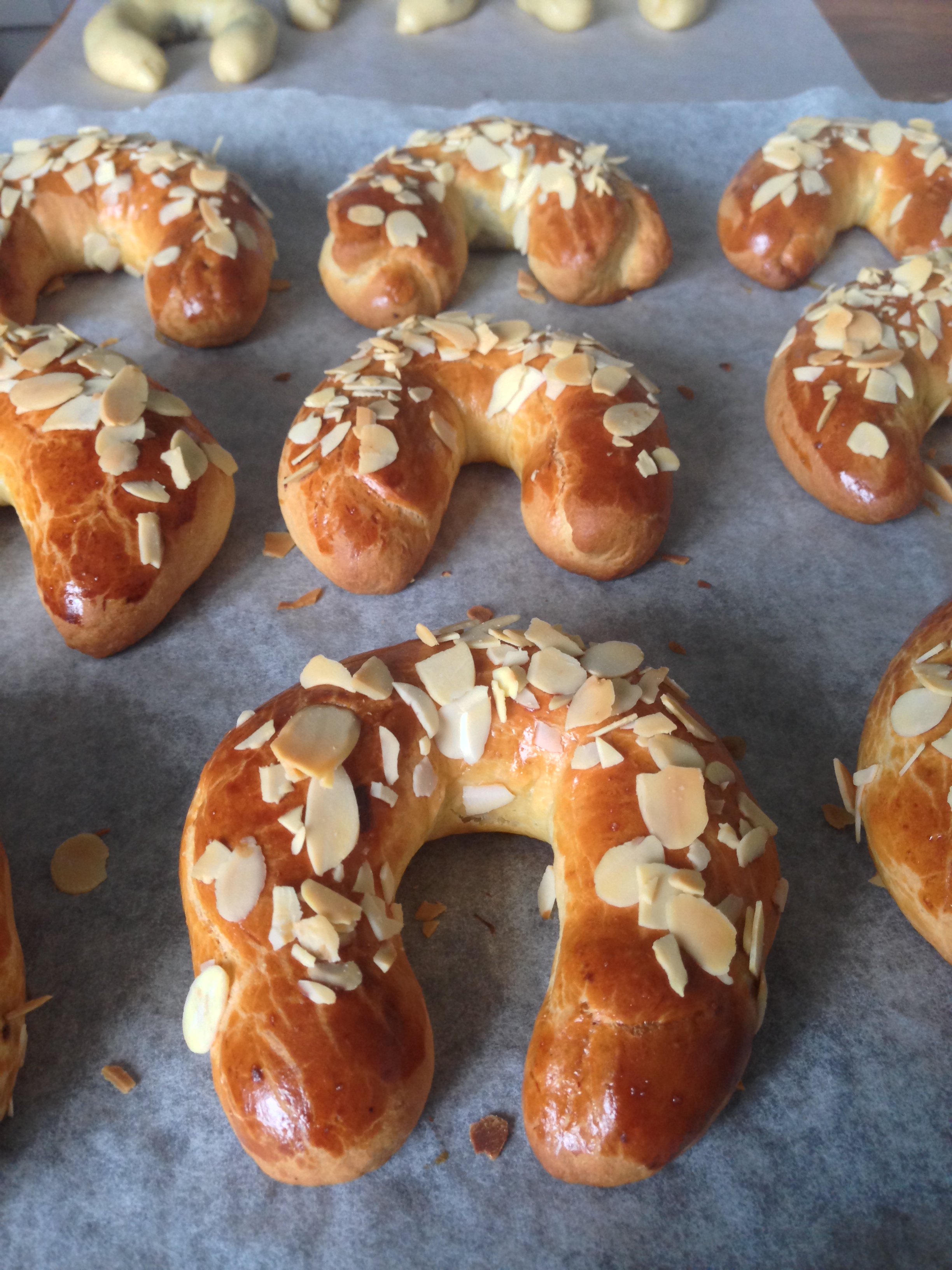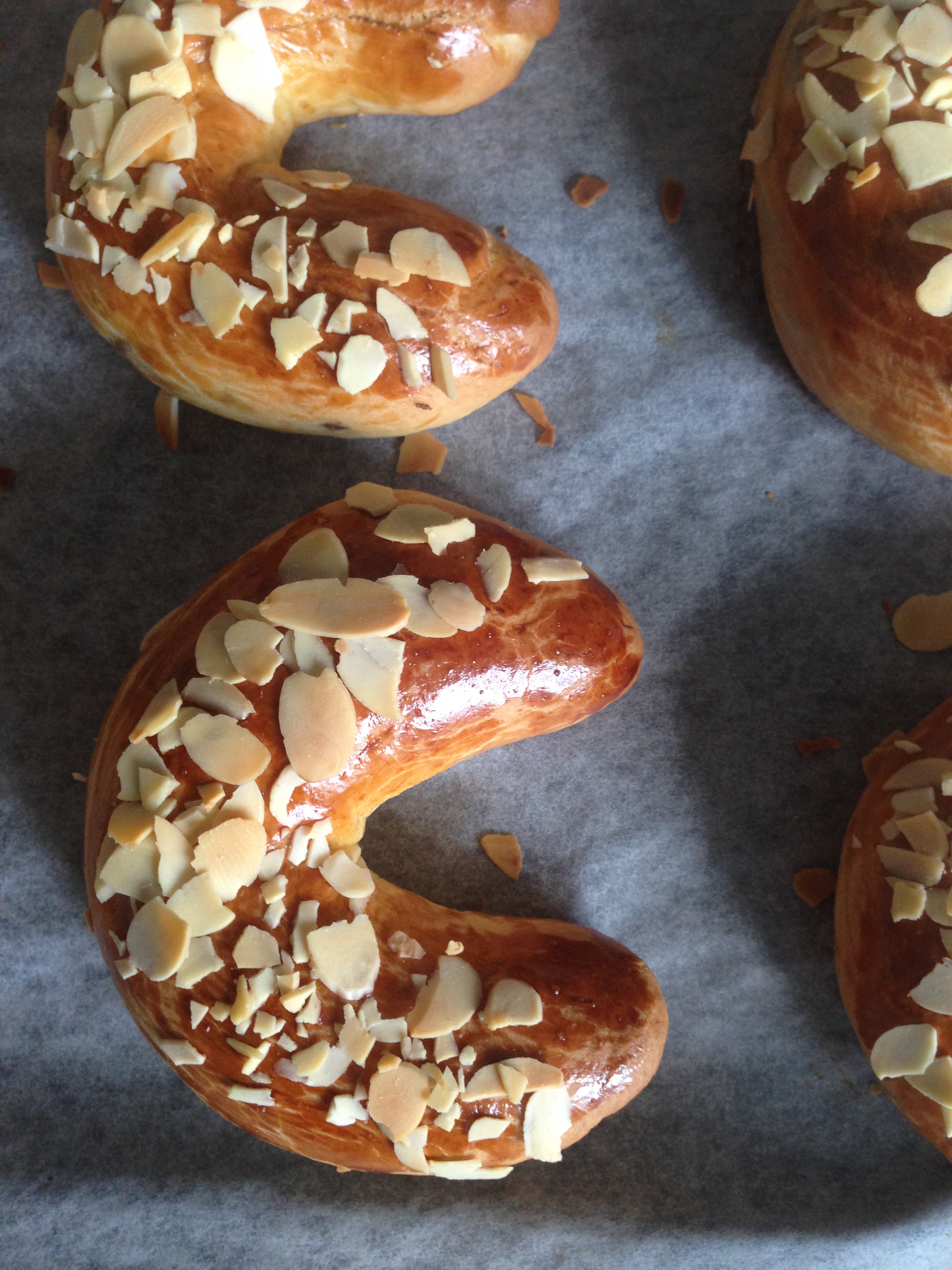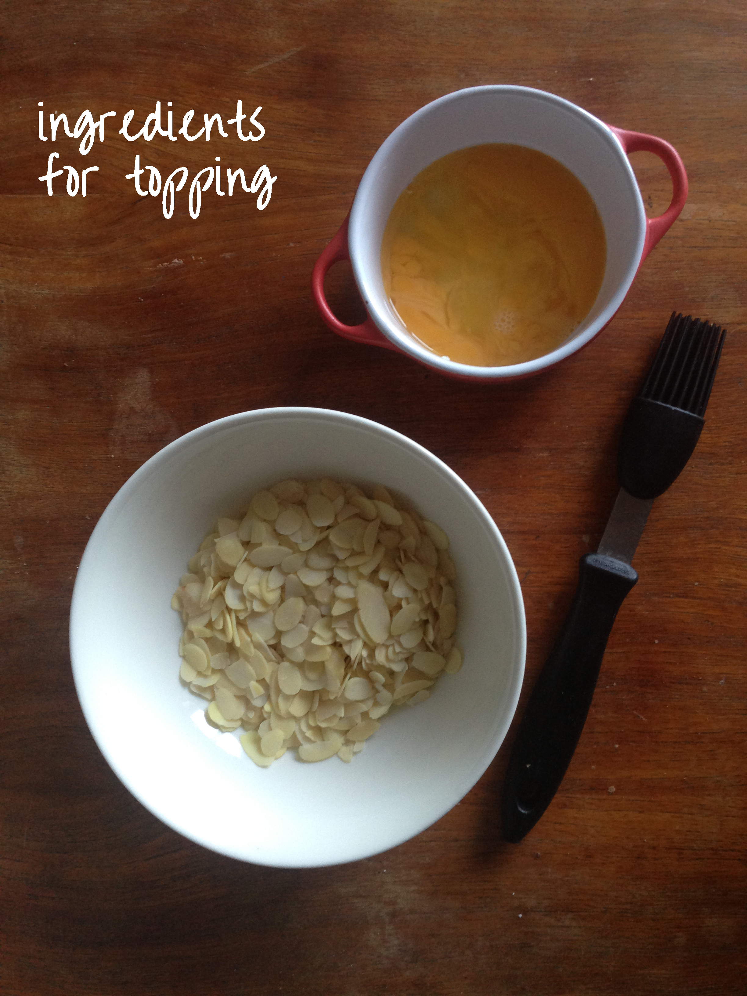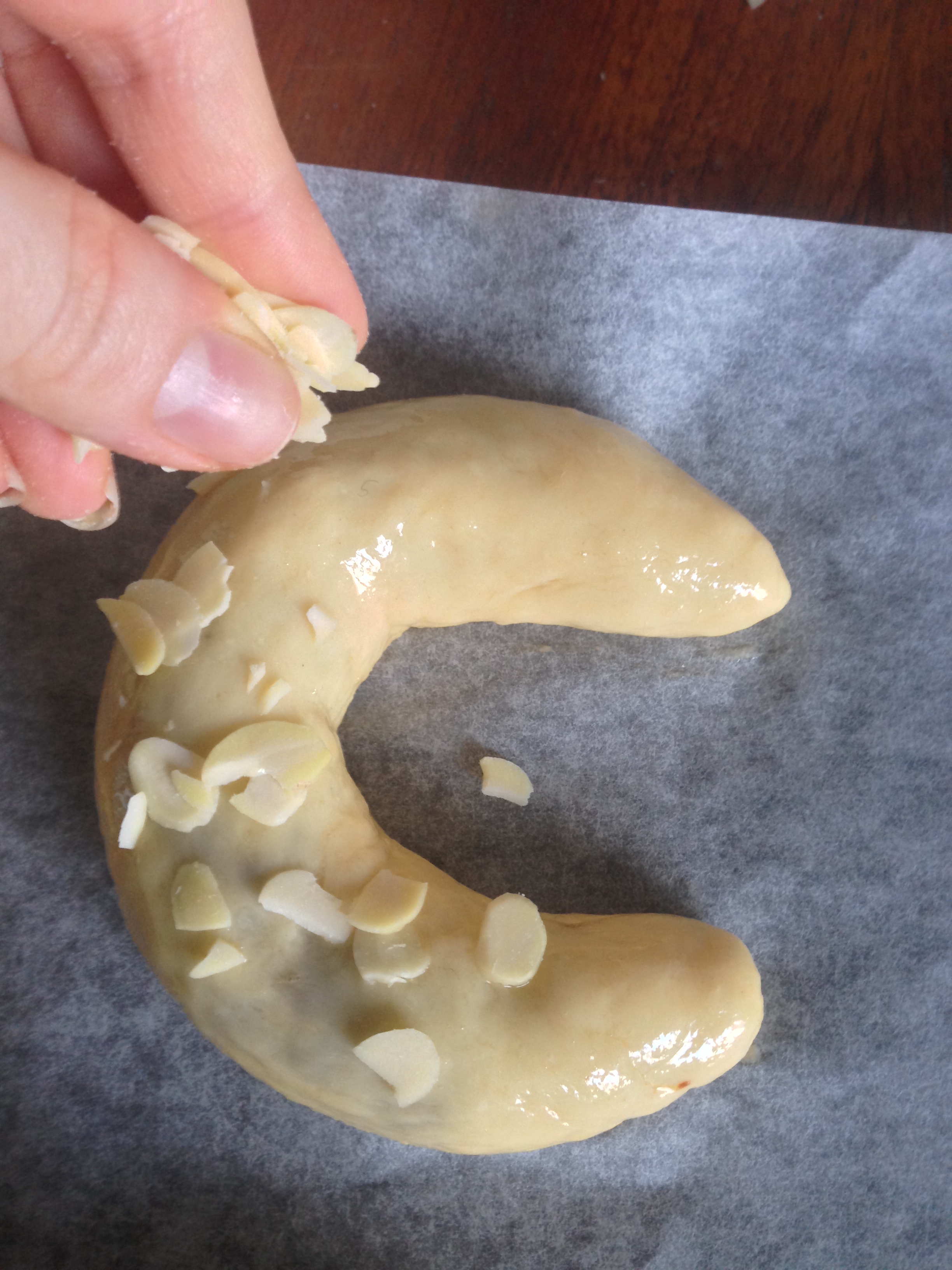 11. Once you have all the baking sheet filled the first batch, brush the buns with egg yolk generously, cover the surface with slivered almonds (as much as you like, I like to cover the whole surface, I love almonds!). Put the first batch in the oven and continue with the second, third and so on..