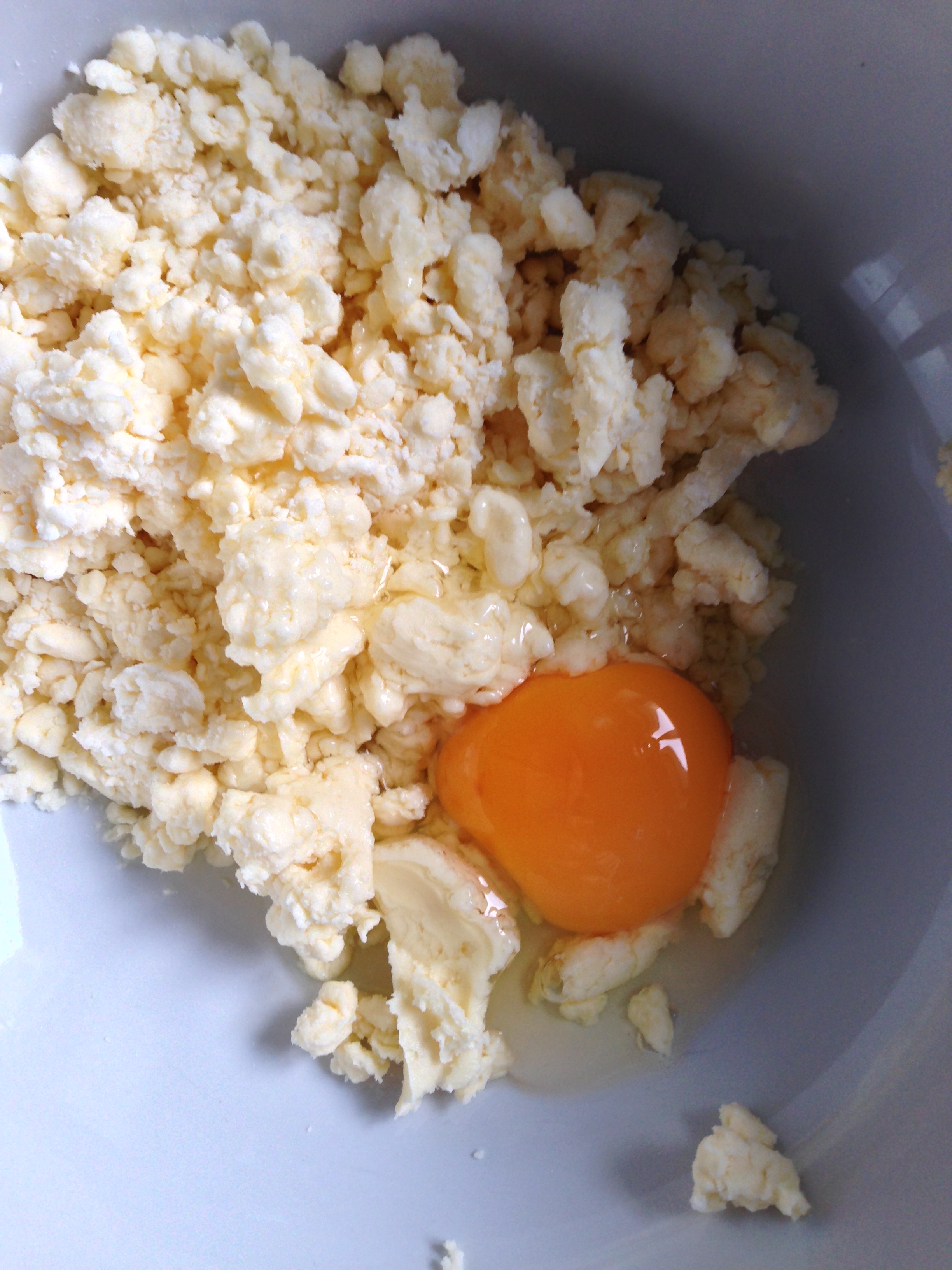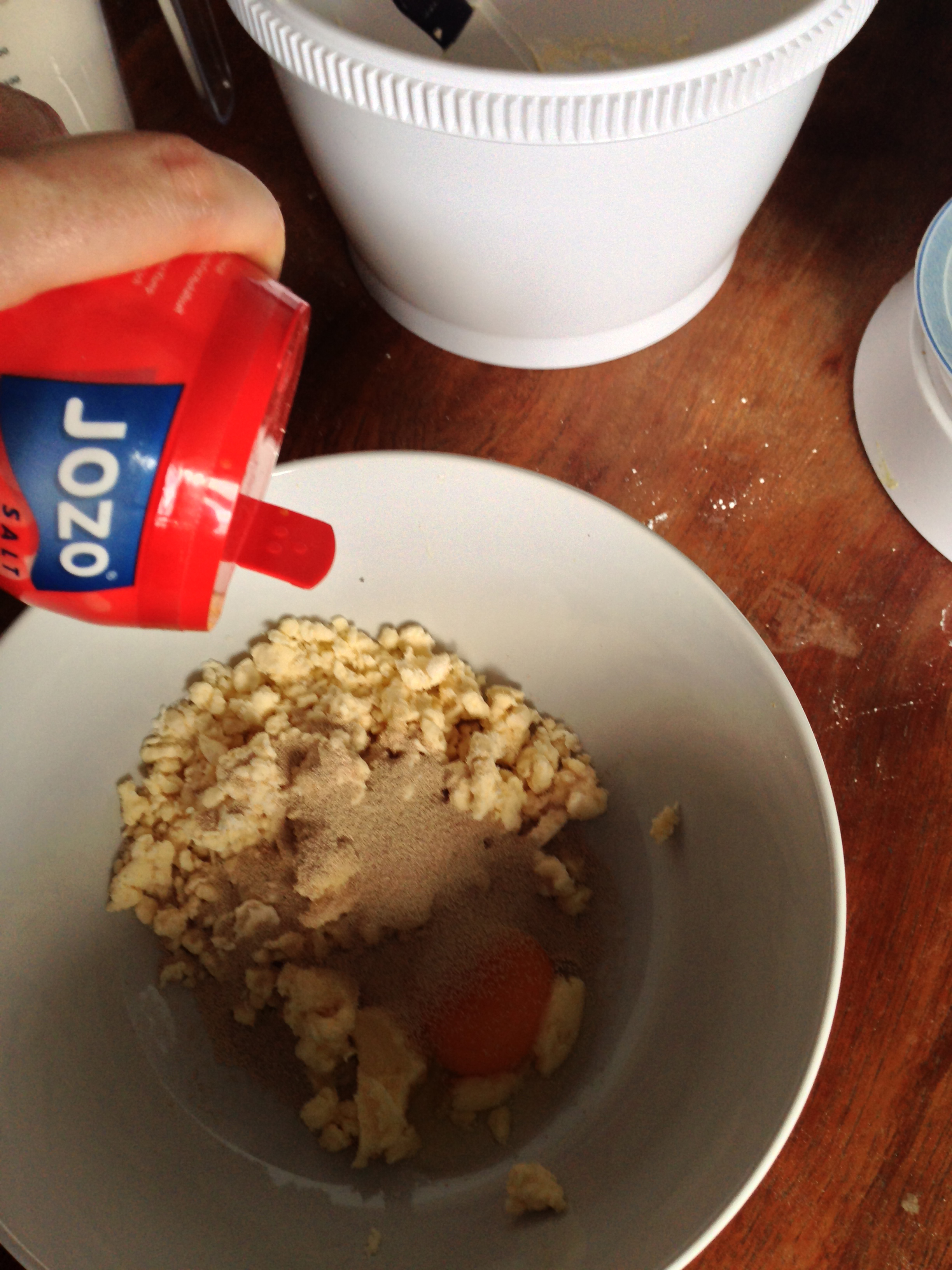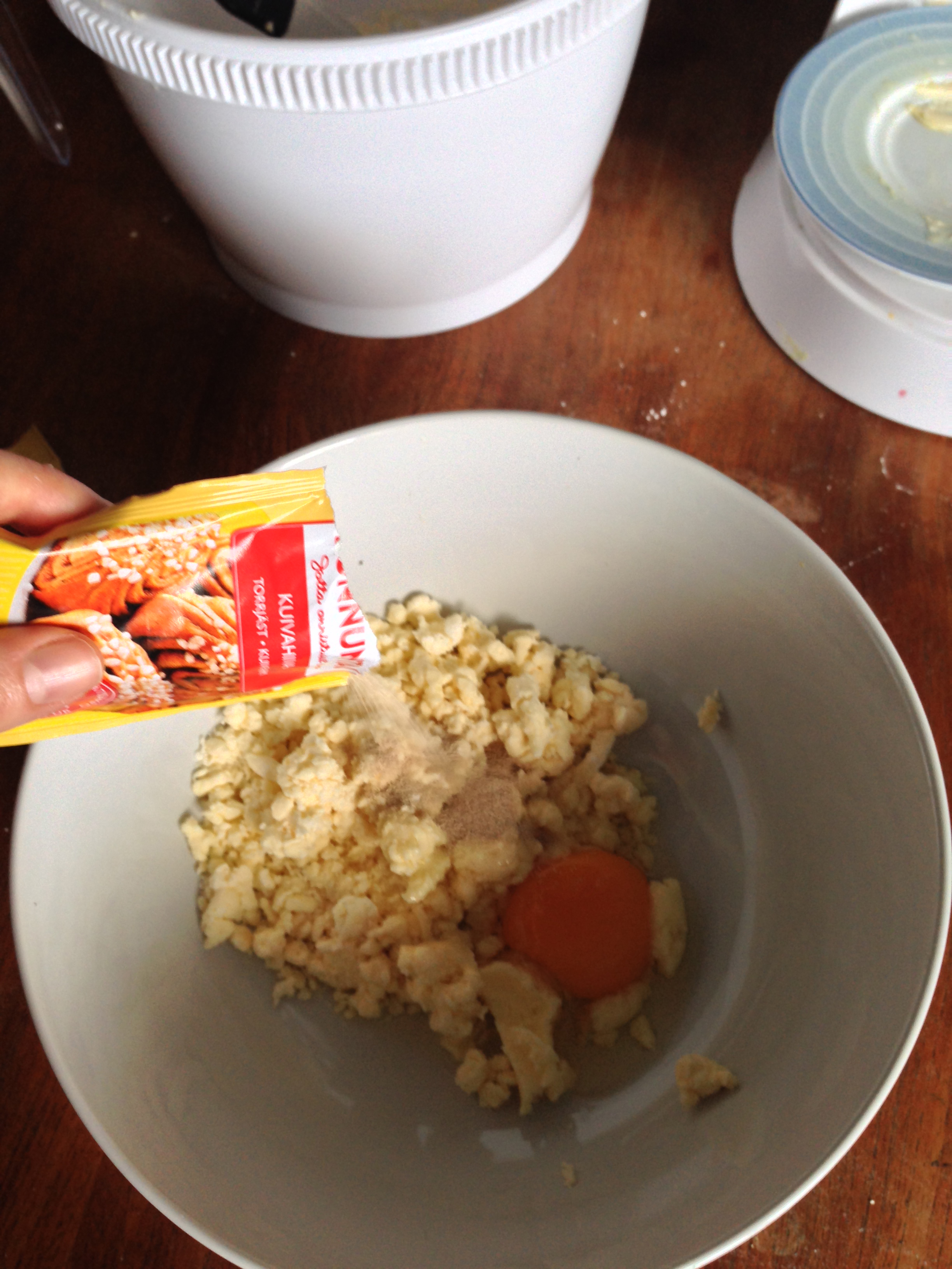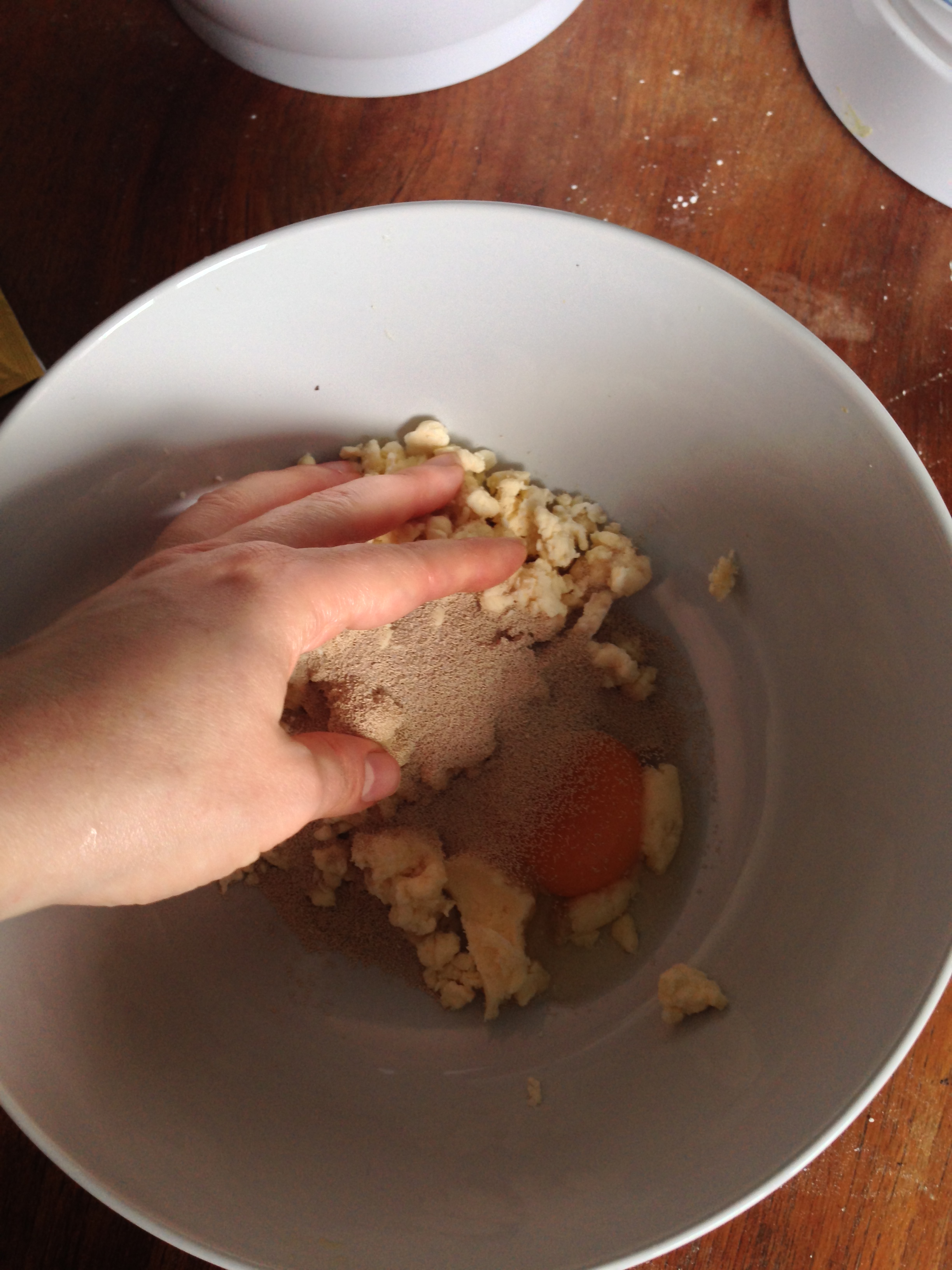 3. Transfer butter-sugar mixture into a bowl that you can knead in. Add egg, yeast and salt and blend them just a little using your hand.