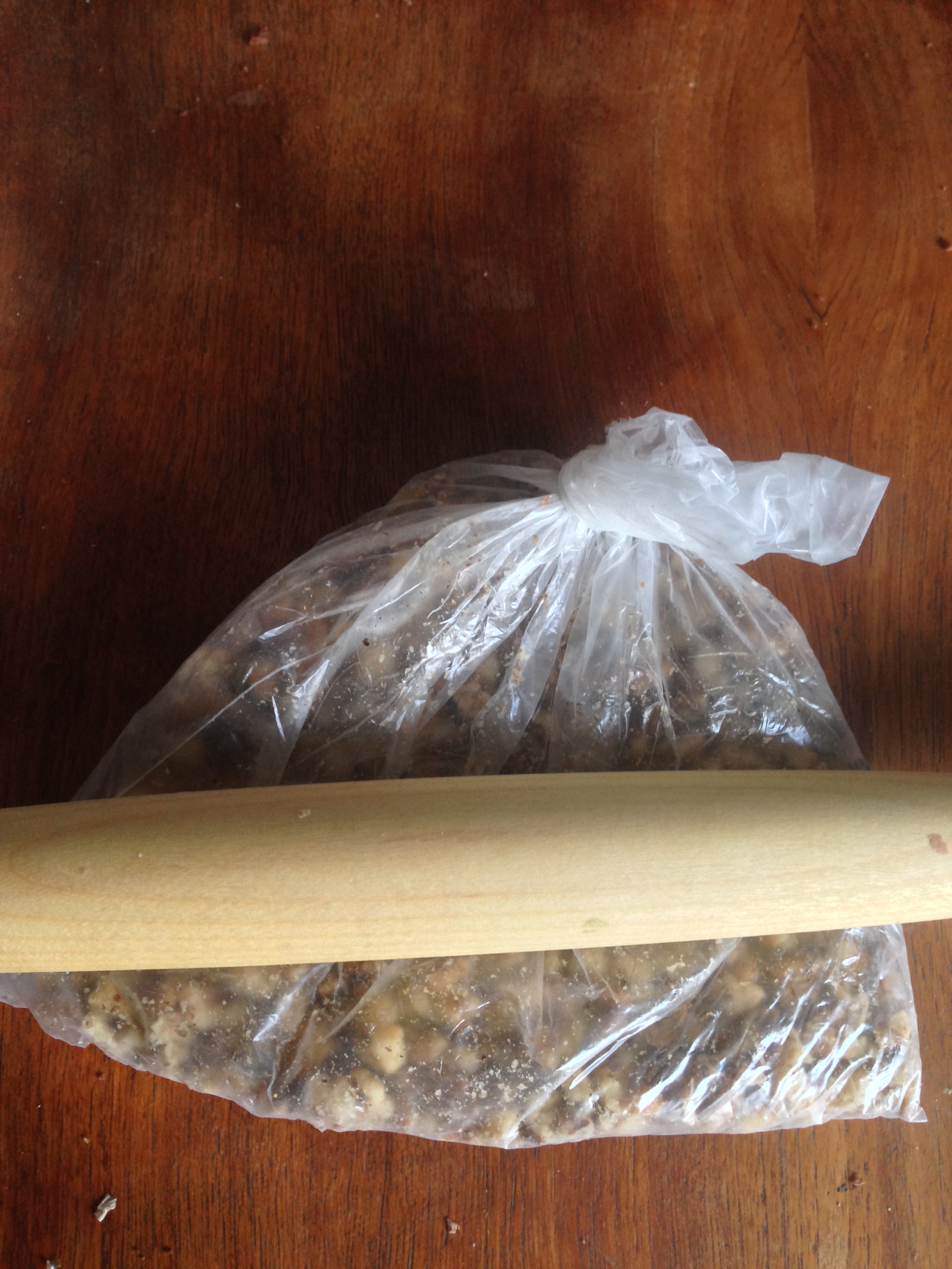 7. In the meantime, prepare the filling. First, crush the walnuts. I put the walnuts in a small storage bag, sealed it and then crushed them by using a rolling pin. I did not put them in a food processor because the pieces should not be too small, you should feel the walnut pieces.