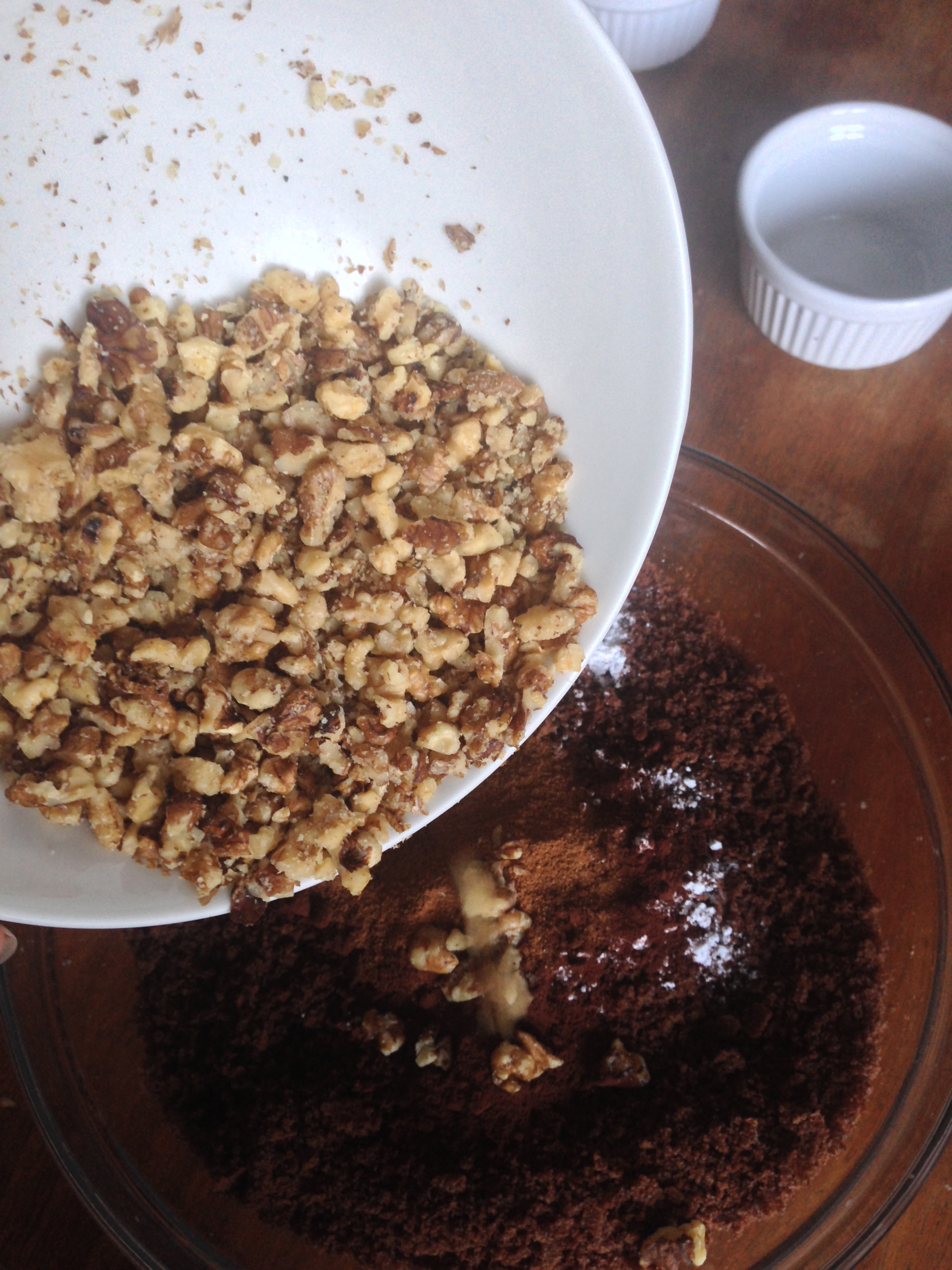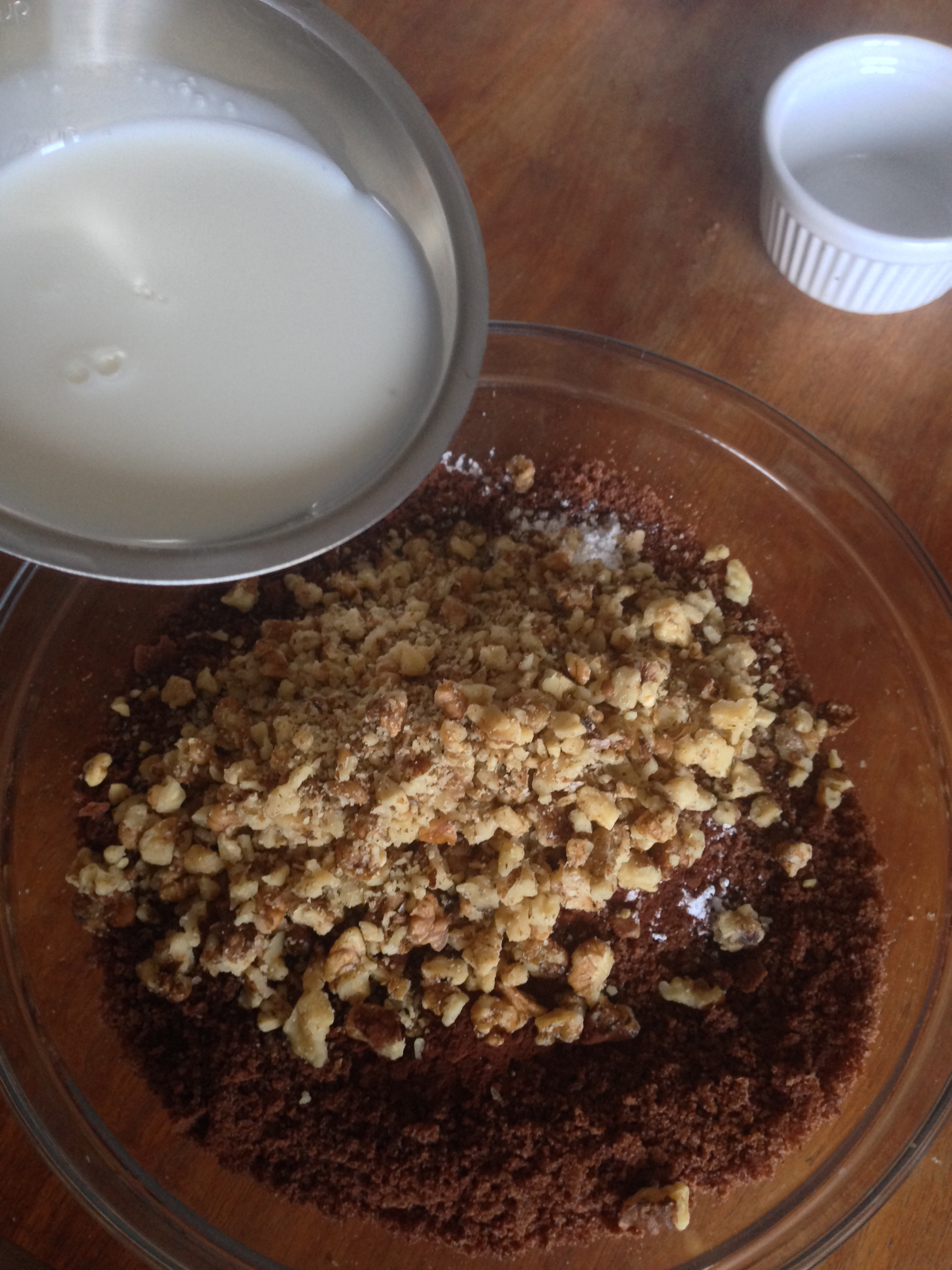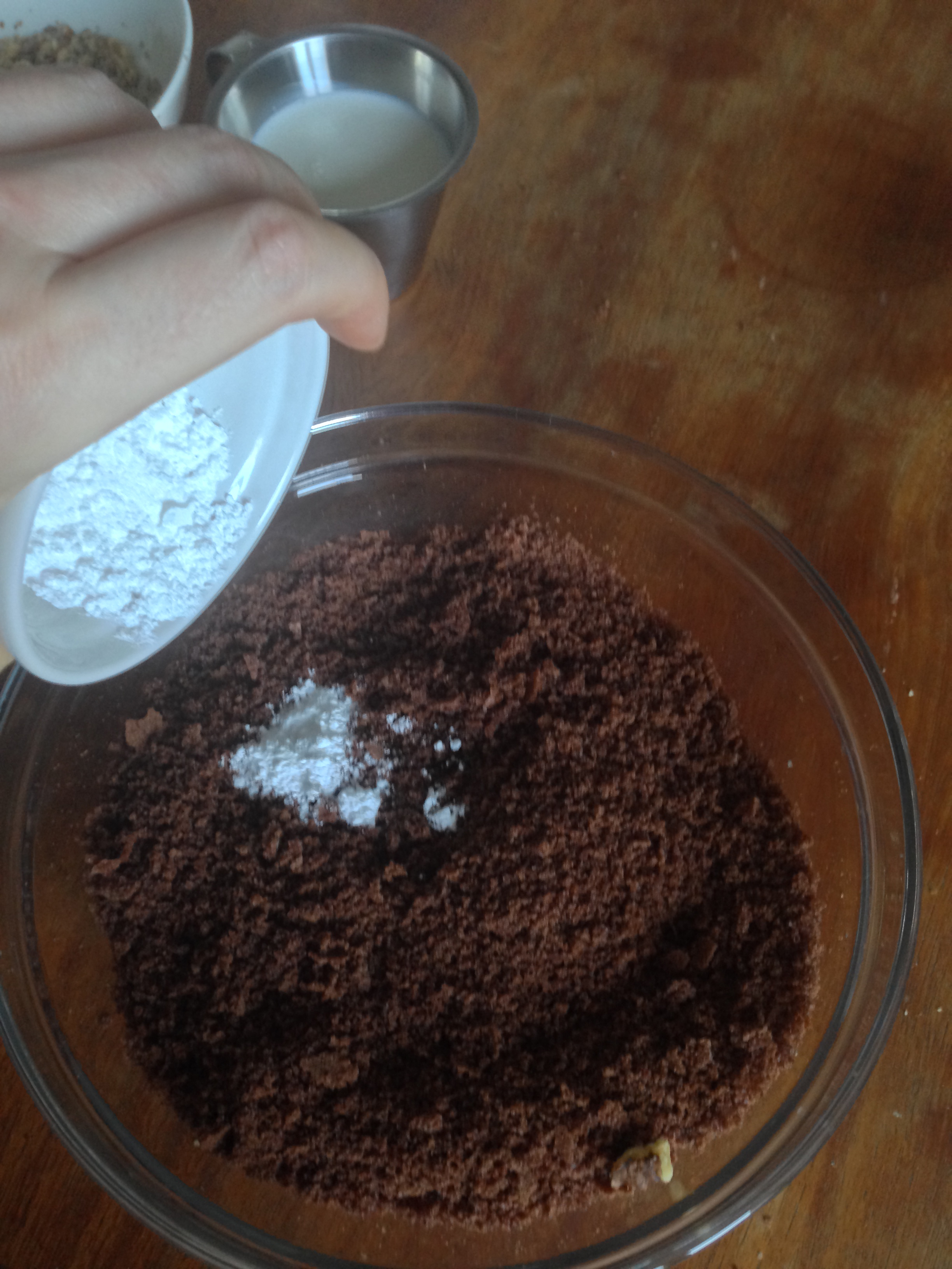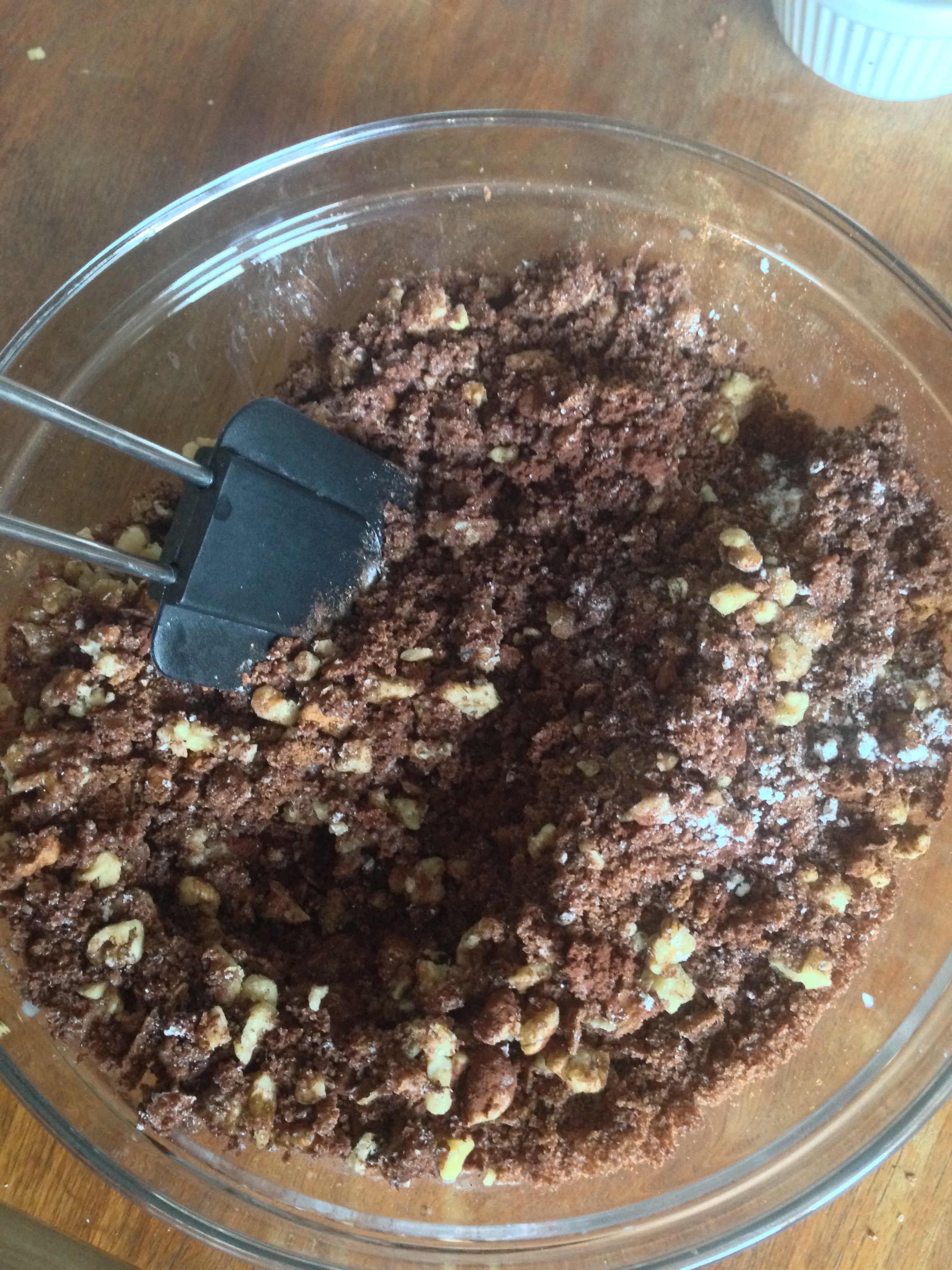 8. In a large bowl, put the cake crumbles. Add powdered sugar, cocoa powder, cinnamon, walnuts and milk and mix them using a wooden spoon or a spatula. You just have to mix it until all the ingredients are blended and get wet.