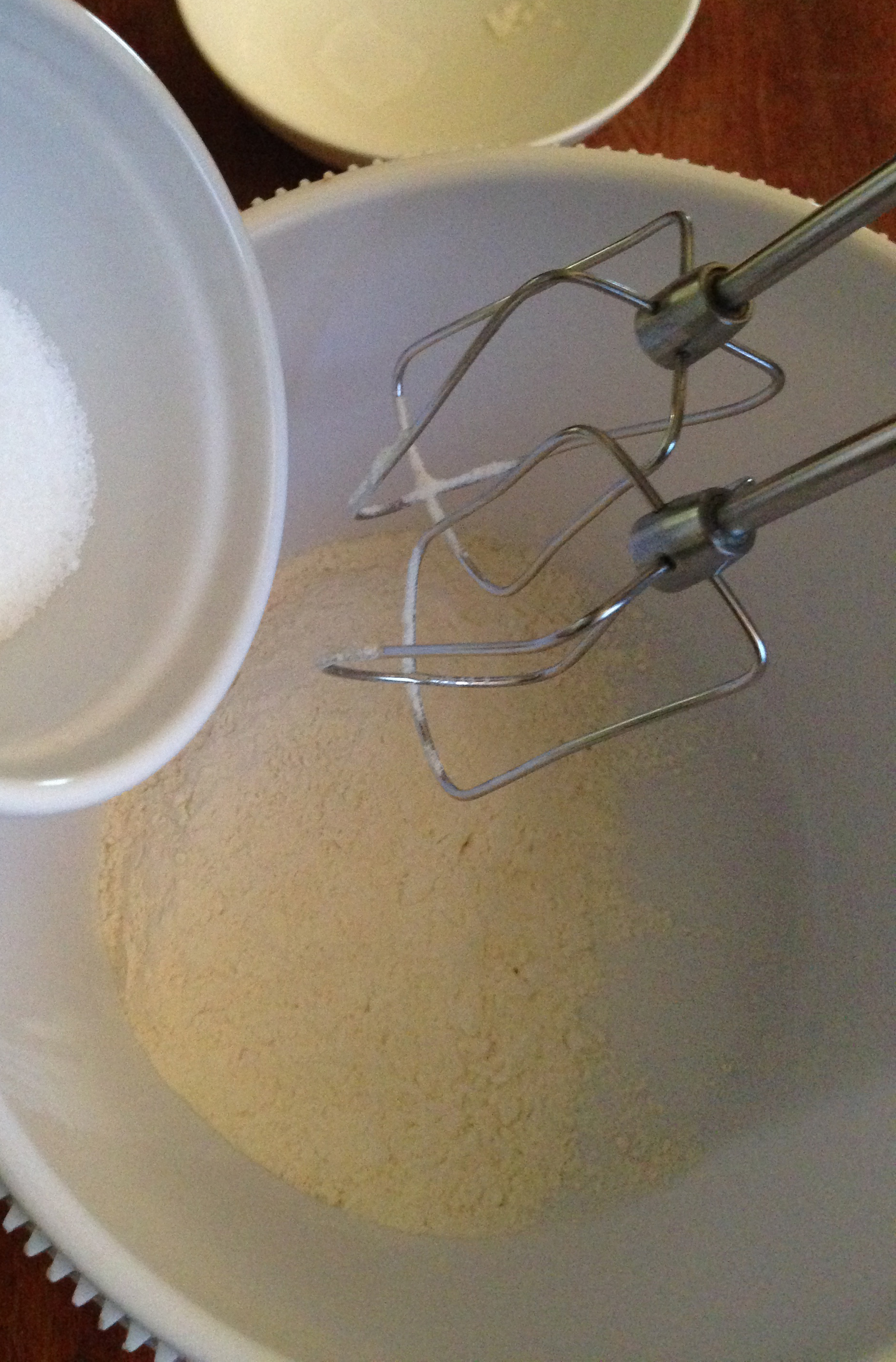 1. In a mixing bowl, put flour, sugar and salt. Grate butter into this mixture of dry ingredients. Make sure that butter is really really cold, right out of the fridge. Mix them in low speed for just about 30 sec., only until you get a crumbly mixture. Alternatively, you could do this in a food processor by pulsing as well. Actually, I’ve seen that many people prefer this, but I do not have a big enough food processor, so I used mixer. One other option is to use your hands – but you should be very quick if you are doing in this way, not to heat the butter too much with your hands.