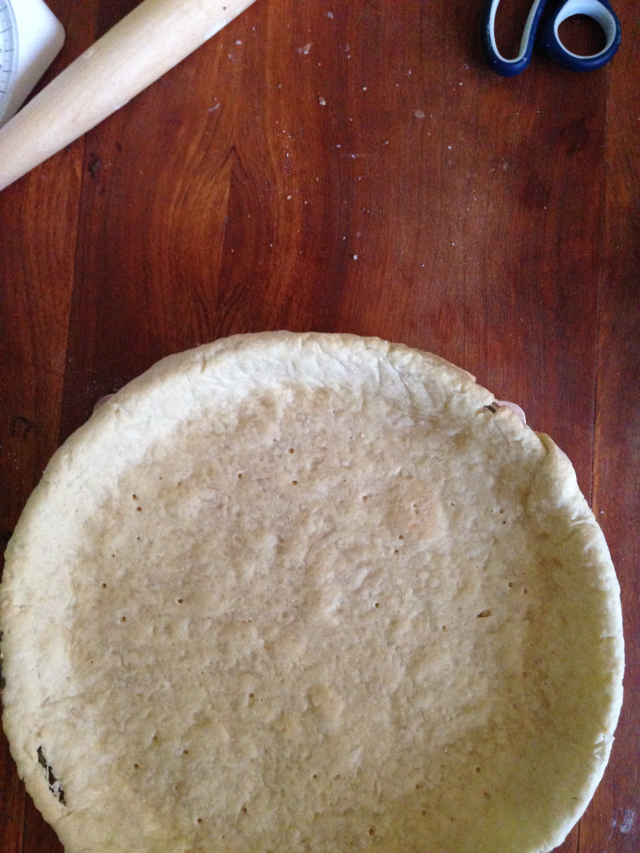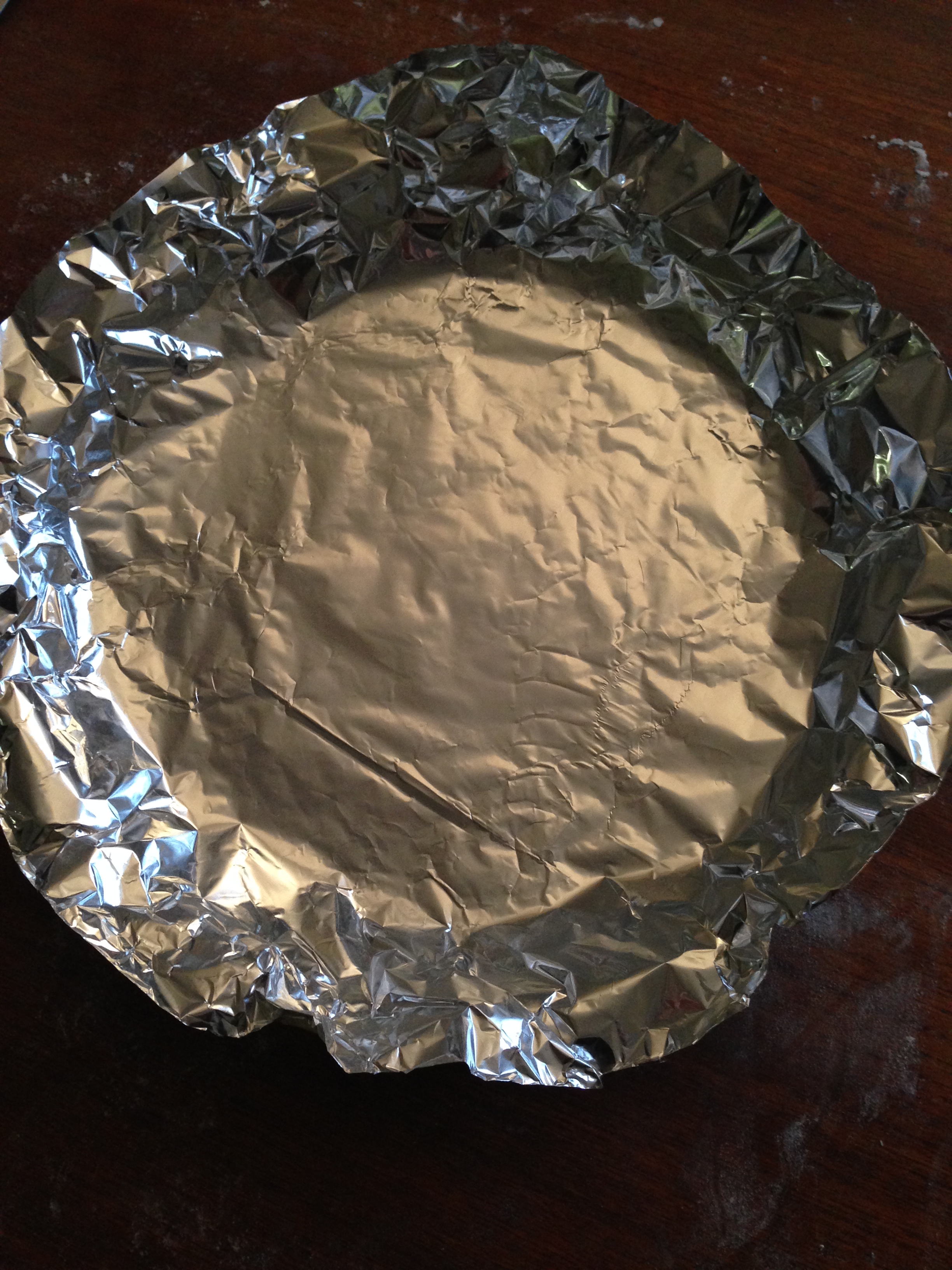5. After the dough is chilled in the fridge, take it out and roll it about 5 cm bigger in radius than your pie dish and put the rolled dough on the dish. Make sure that it sticks to every single corner of the dish. With the help of a fork, make some holes on the dough (distribute the holes as evenly on the dough as possible) and cover it with an aluminium folio. You can also put some beans on the folio to keep the surface from puffing (it puts a pressure on the dough).