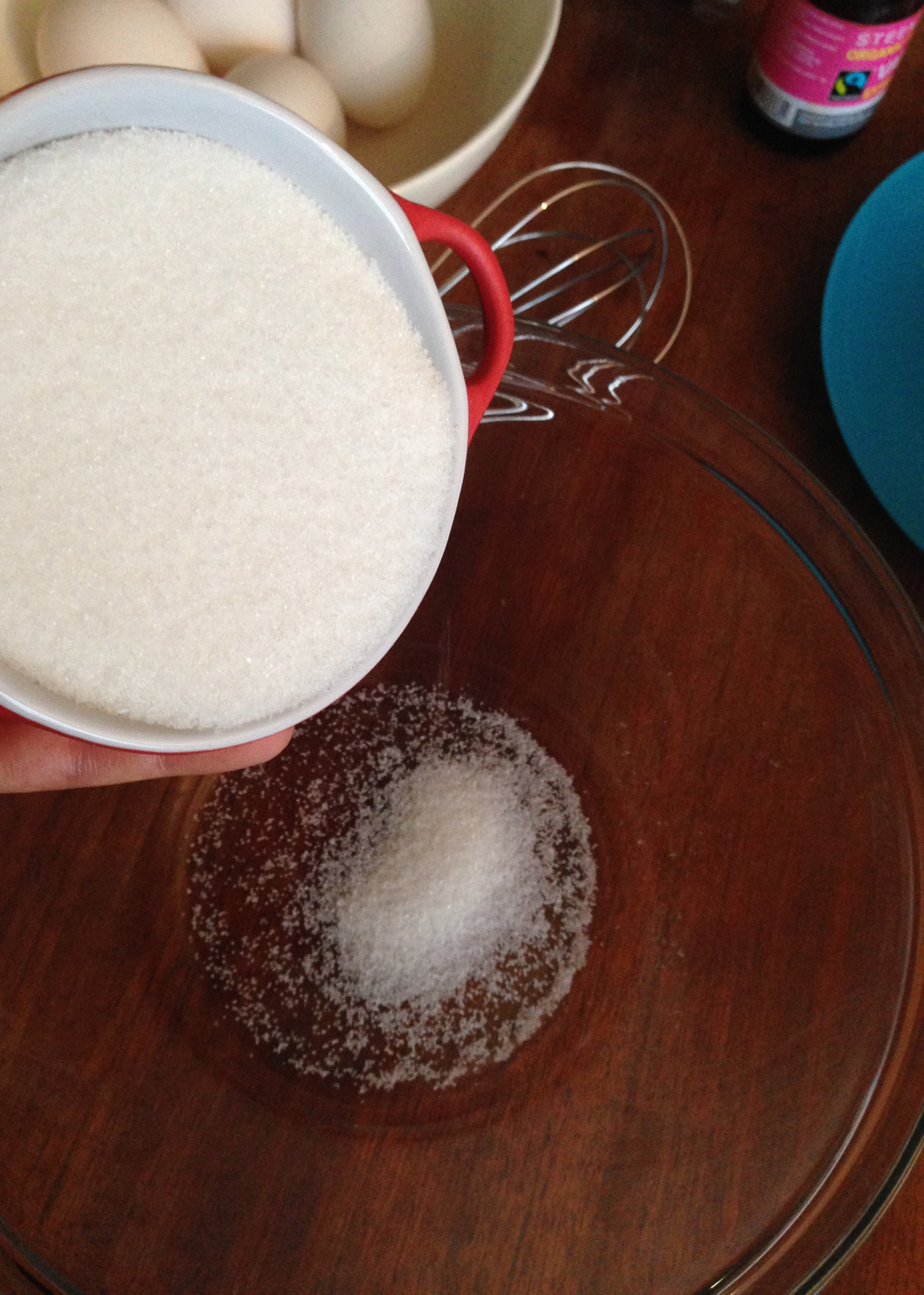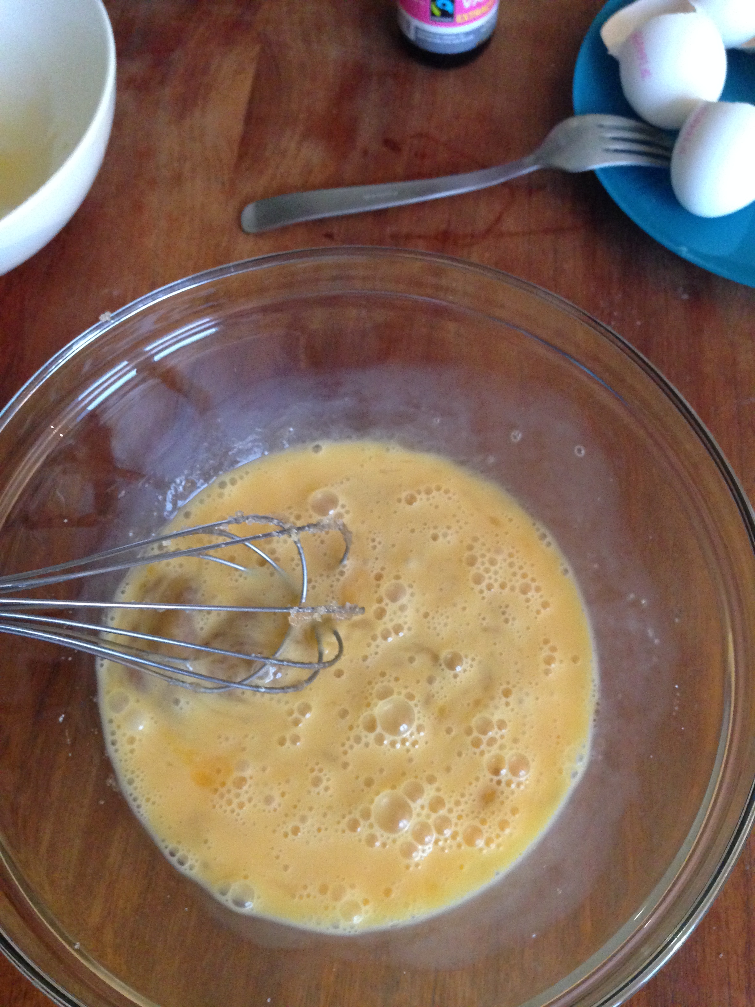 4. In another bowl, beat 4 eggs. Add it to the sugar mixture and whisk them altogether.