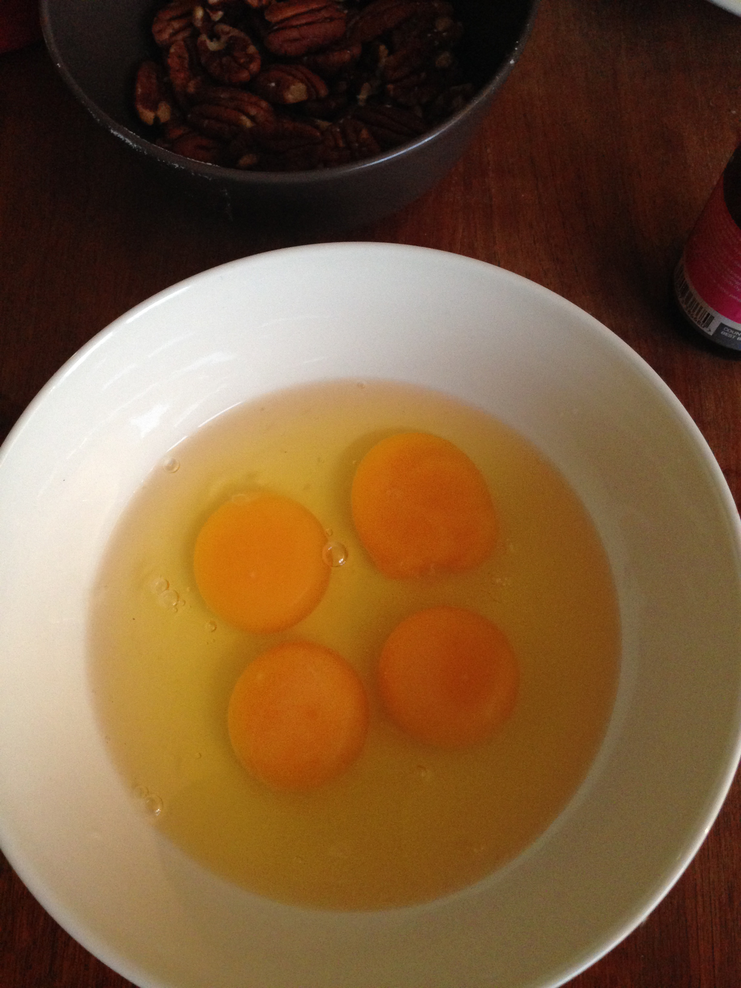 When your crust is done baking, put it aside while you are preparing the pecan filling. This recipe calls for a partially pre-baked crust.